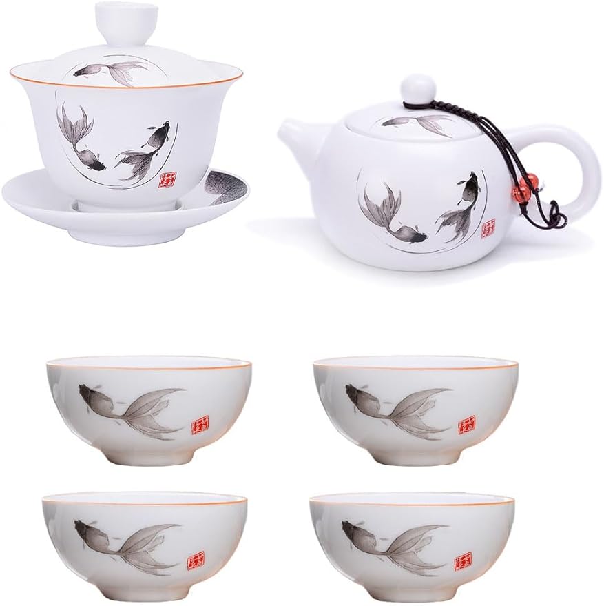 Porcelain Teapot Gaiwan with 4 cups Set,Chinese Feng Shui Ink Painting Fish Gongfu Tea Set