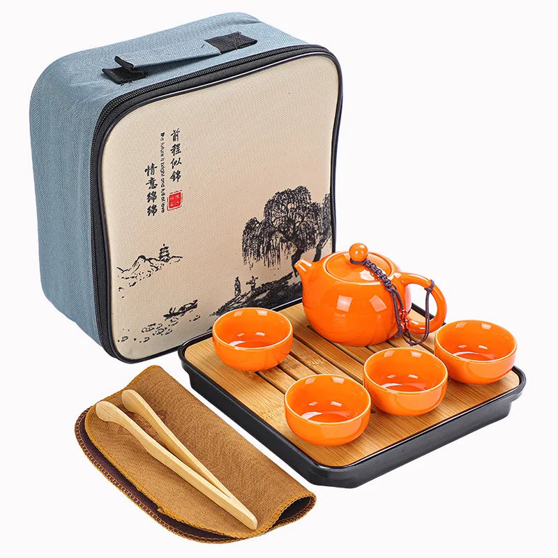Chinese Style Travel Tea Set with Carrying Bag Ceramic Glaze Teapot 1 Pot 4 Cups Outdoor Camping Teapot Kung Fu Tea Cup Set