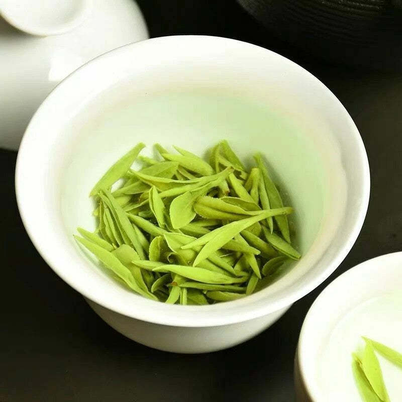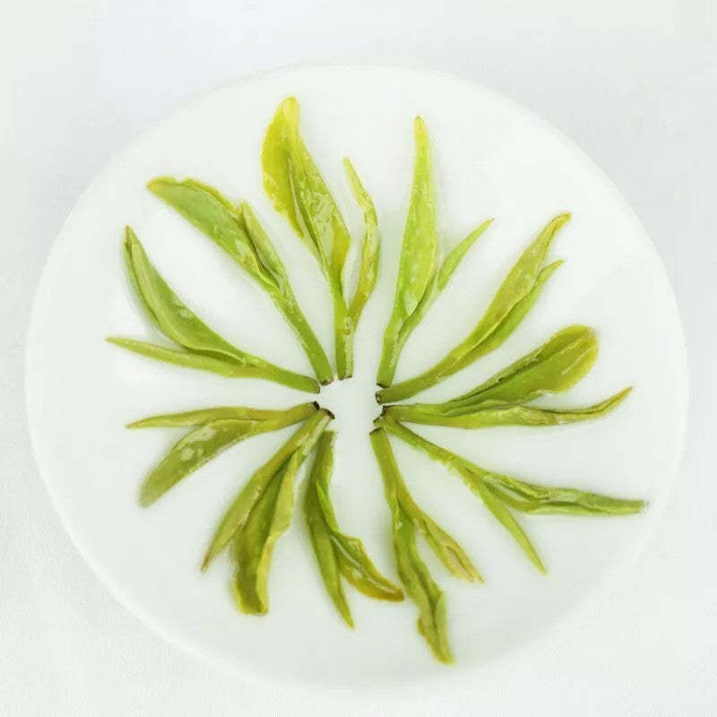 This is a supreme quality green tea made of two young spring tea leafs and a bud as you can see in the picture. The tea trees are grown on the mountain 1200-1800 meters above sea level, untouched by pollution. It is made from the Yunnan Broad Leaf variety, which gives it its distinctive aroma and taste. This green tea enhances the natural full bodied character and its rich, delicate flavour. It has an unmistakable aroma.
