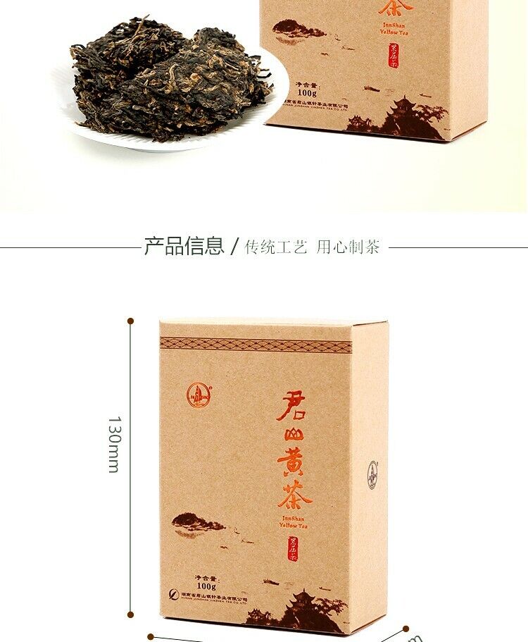 Premium Hunan Jun shan Huang Cha Pressed Nuggets Jun Shan China Yellow Tea 100g Type:Yellow Tea Net Weight:100g Packaging: Box Origin: Yueyang,Hunan,China Jun Shan Huang Cha tea is a yellow tea from Junshan Island of the Hunan Province in China. It is one of Chinese Famous Teas. Junshan yellow tea is only produce using the tea leaves from the tea garden at the Junshan Island, which is located in the middle of Dong Ting Lake of Hunan Province. The best quality Jun Shan tea is called as Jun Shan Yin Zhen. The production of Jun Shan Yin Zhen demands that tea pickers pluck only buds while the golden brick is made with the material picked as one bud and one leaf system. Jun Shan yellow tea is processed similarly to green tea, but after the first firing it undergoes steaming followed by a prolonged “resting” wrapped in cloth or paper. This stage called men huan may last a day or two before the final firing. The moist pause allows the leaves to breathe back their own aromas and prevents the astringency associated with some green teas. It also gives the leaves a very slight yellow cast. The initial firing halts most of the oxidation, but similar to white tea it is very slightly oxidized.As a result, it produces bright yellow color, refreshing flavor and sweet and mellow taste that are the characteristics of yellow tea. Jun Shan Huang Cha is less expensive than Jun Shan Yin Zhen needle tea, first grade leaves harvested from the same area, followed by traditional process, you can try the famouse yellow tea at an affordable price. An authentic product from Hunan Junshan Yinzhen Tea Co., Ltd. Brewing Guide: Use 5g of tea leaves for 200ml of water. Quickly rinse the tea leaves with hot water at 80 degree Celsius, and then gently pour hot water at 80-85 degree C into the teapot, let it brew for 2 minutes. The leaves are good for 5 infusions. Add a little more time for each subsequent infusion.