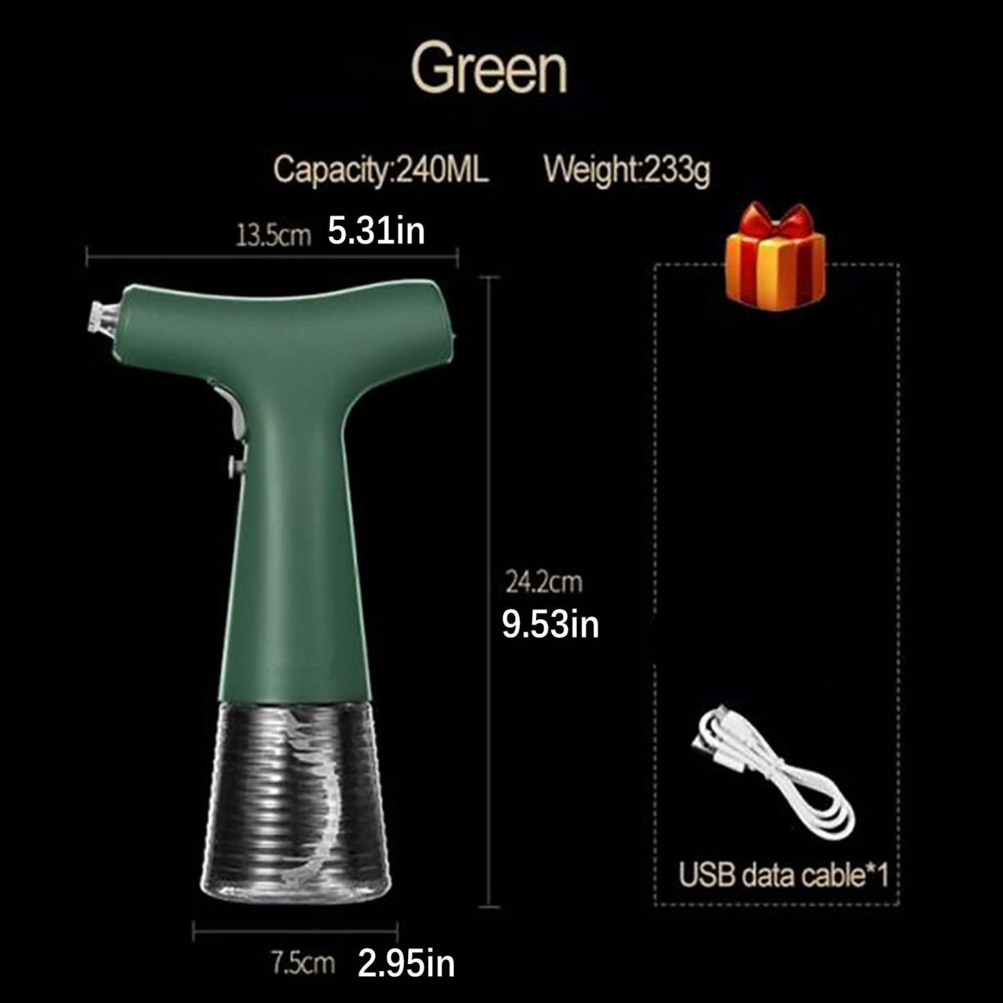 Specifications: Name: Electric spray bottle Material: ABS+PET Color: Black, White, Green Capacity: 240ml Rated voltage: 3.7V Rated power: 7W Output: 5V1A Power supply: 1800mAh Charging interface: type-C