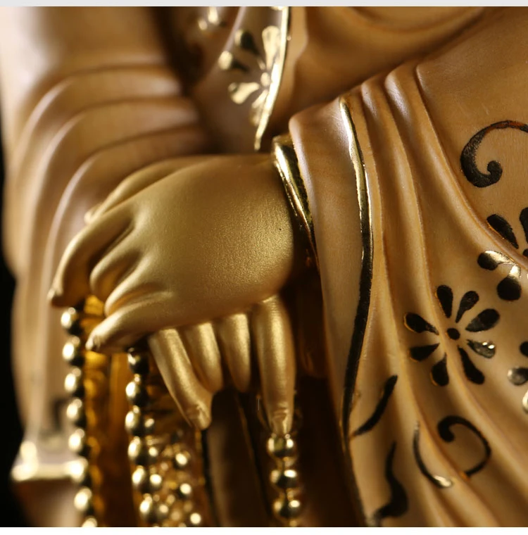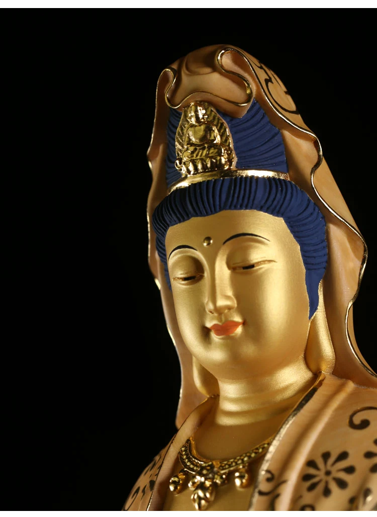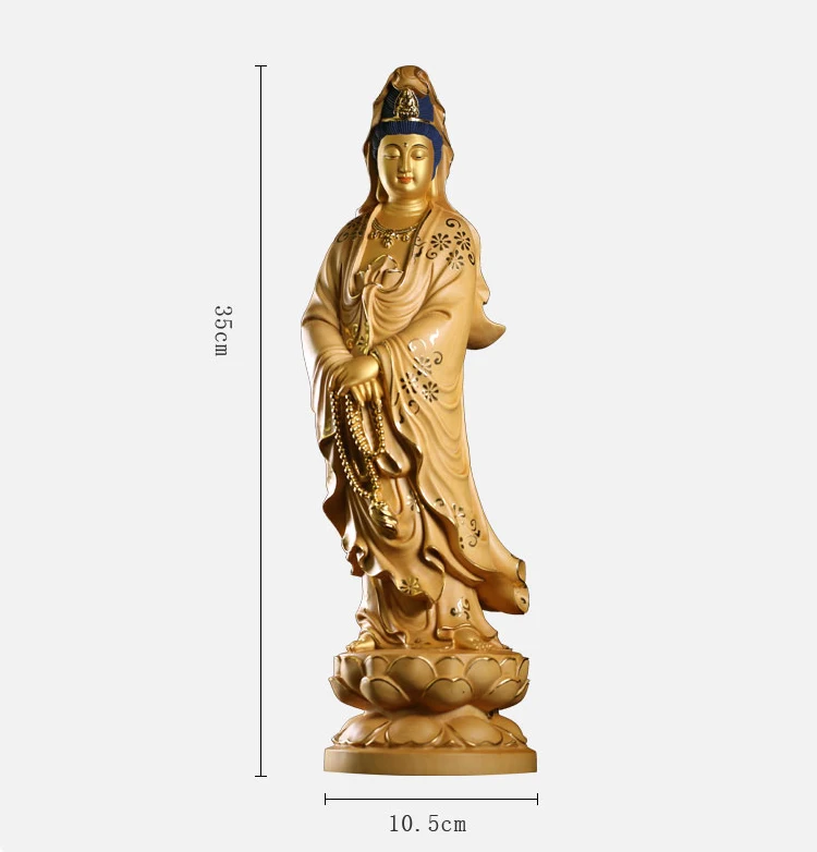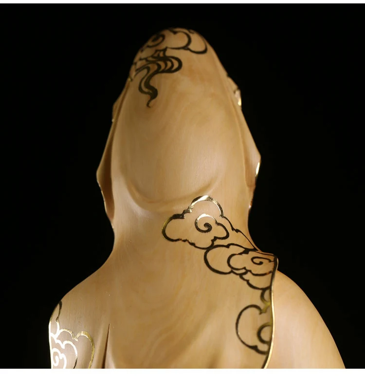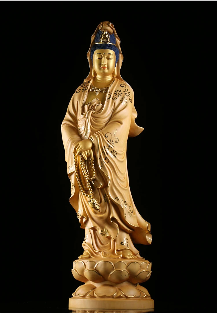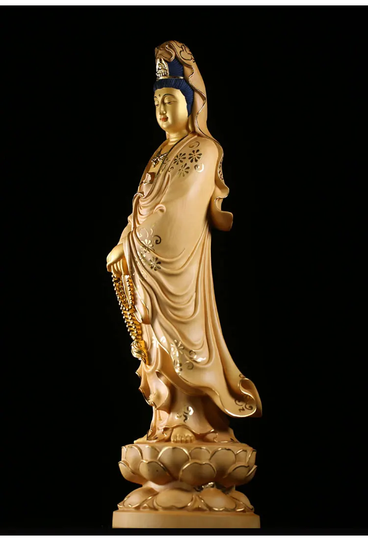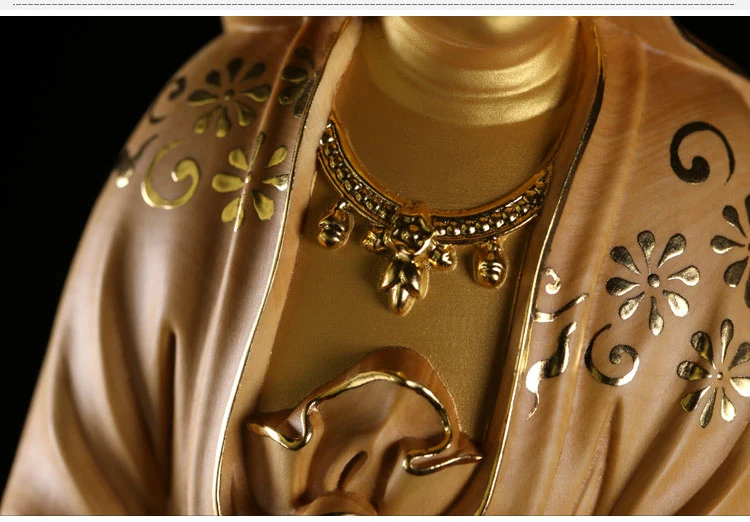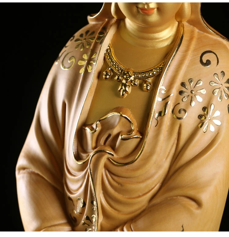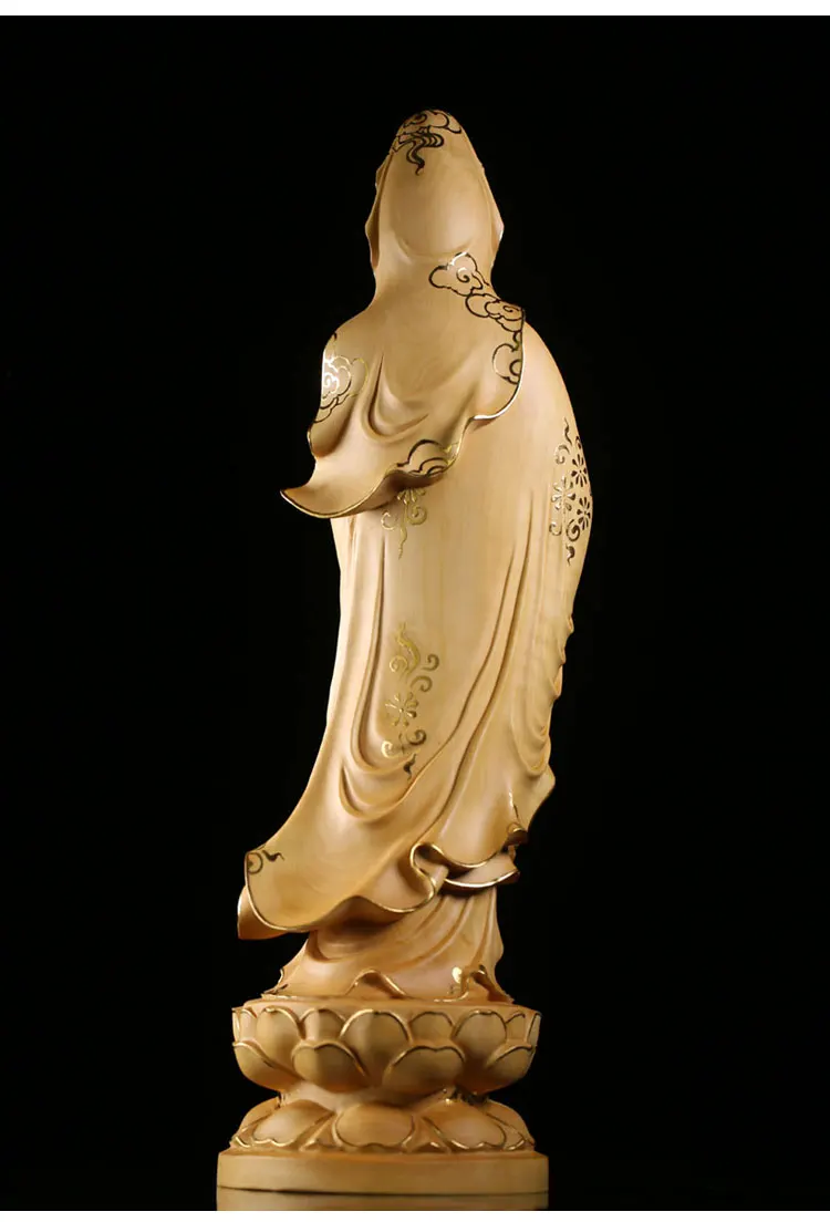 35cm Solid Wood Wood Carving Crafts Buddha Ornaments Hand-painted Gold Painted Guanyin Bodhisattva Statue