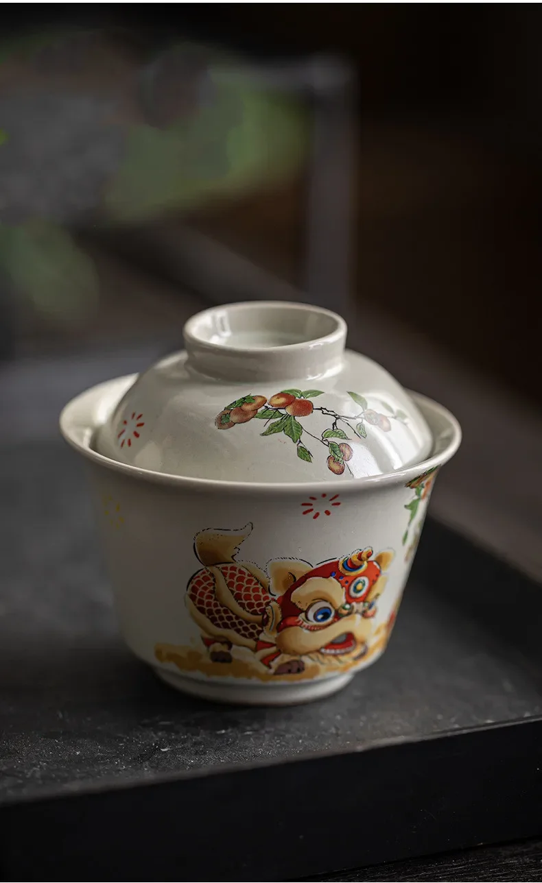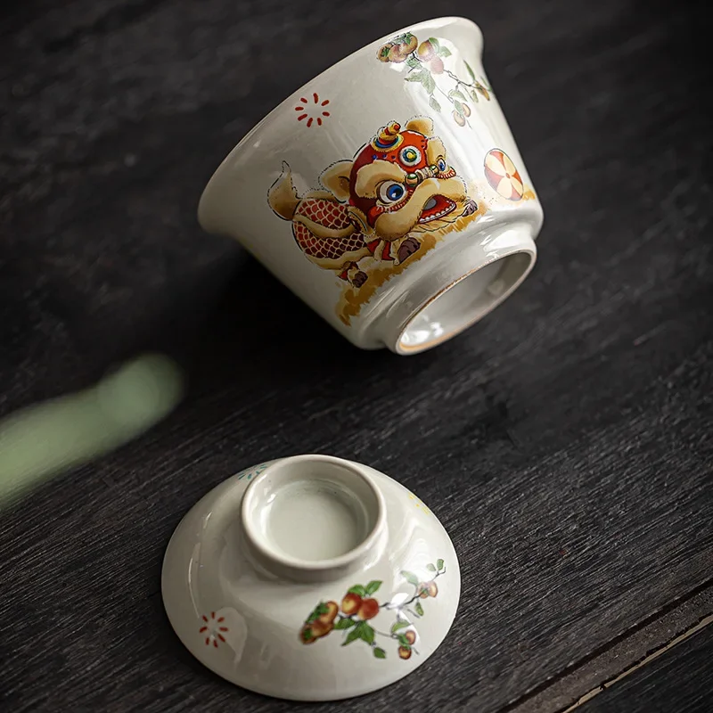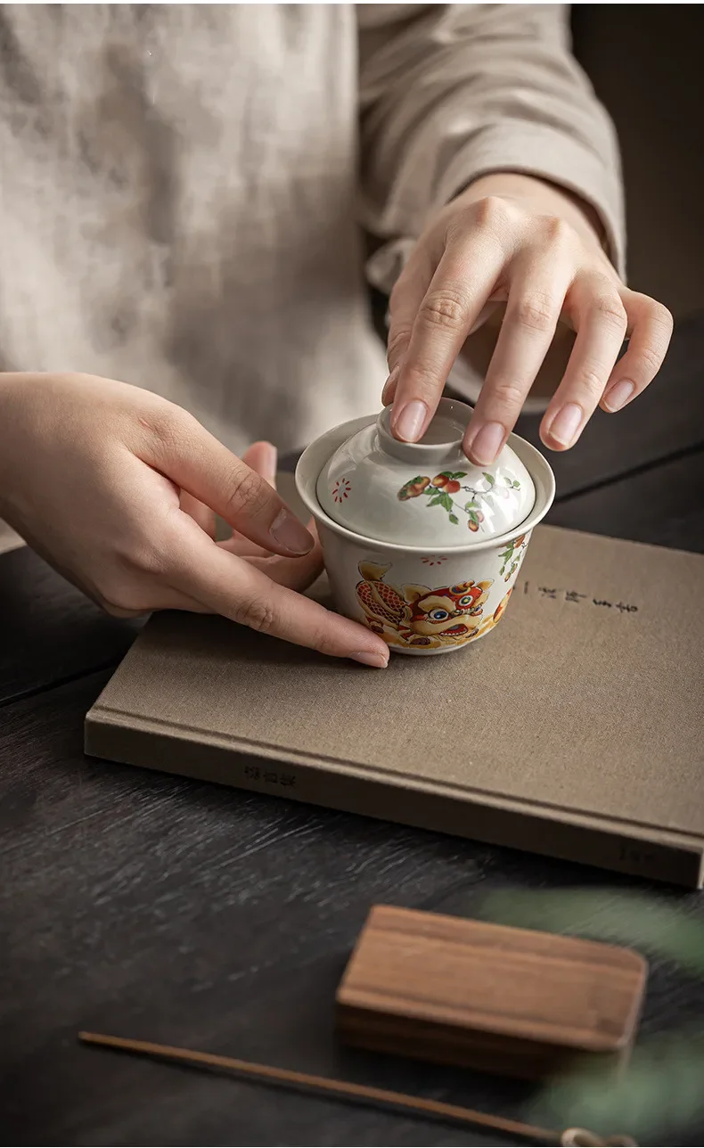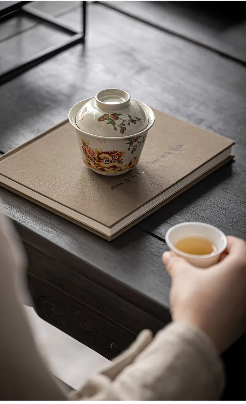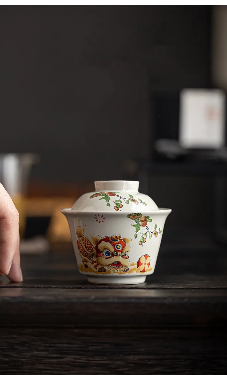 Ceramic Handmade Gaiwan Creative Color Painting Lion Tea Tureen Portable Office Tea Bowl with Cover Teacup Chinese Tea Set