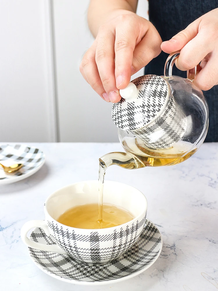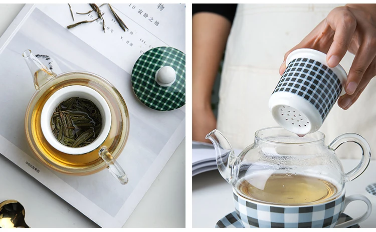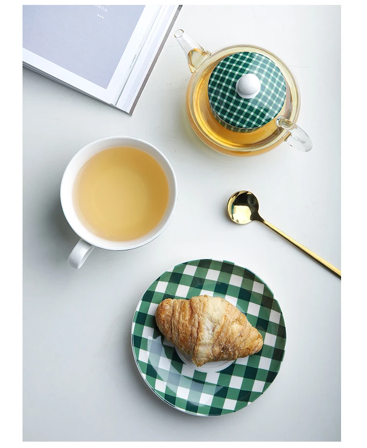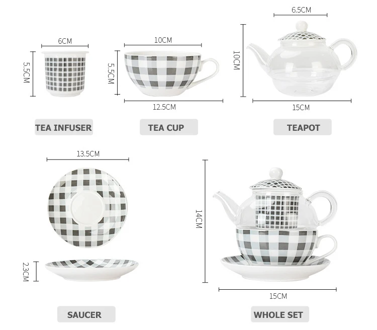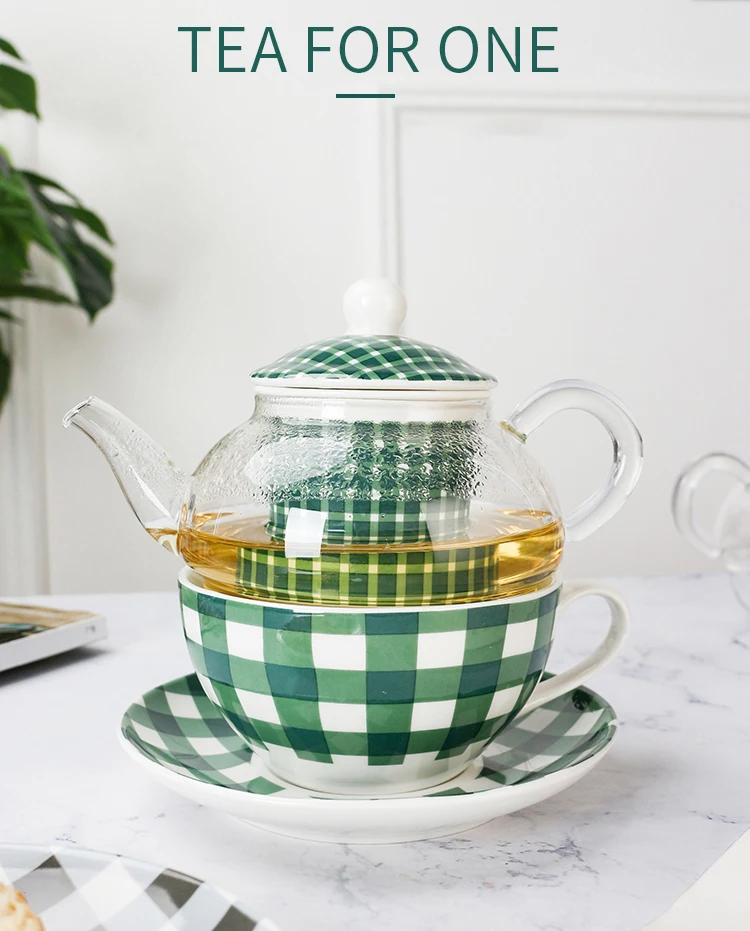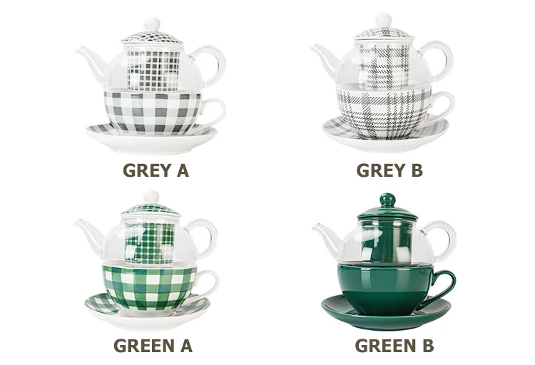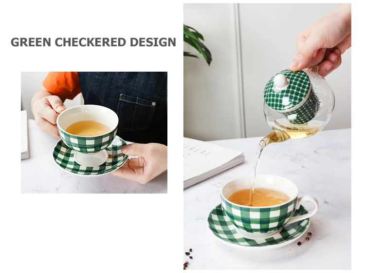 Made of high quality Fine Bone China and glass. Minimalist green and grey checkered design. Teapot with strainer, teacup with saucer. Hand Wash Only. Capacity: teapot holds 360ml, teacup holds 200ml. Comes in a gift box.