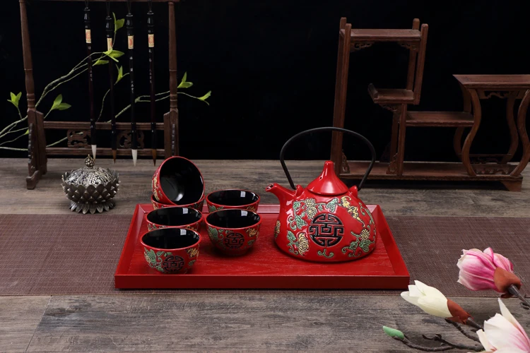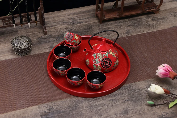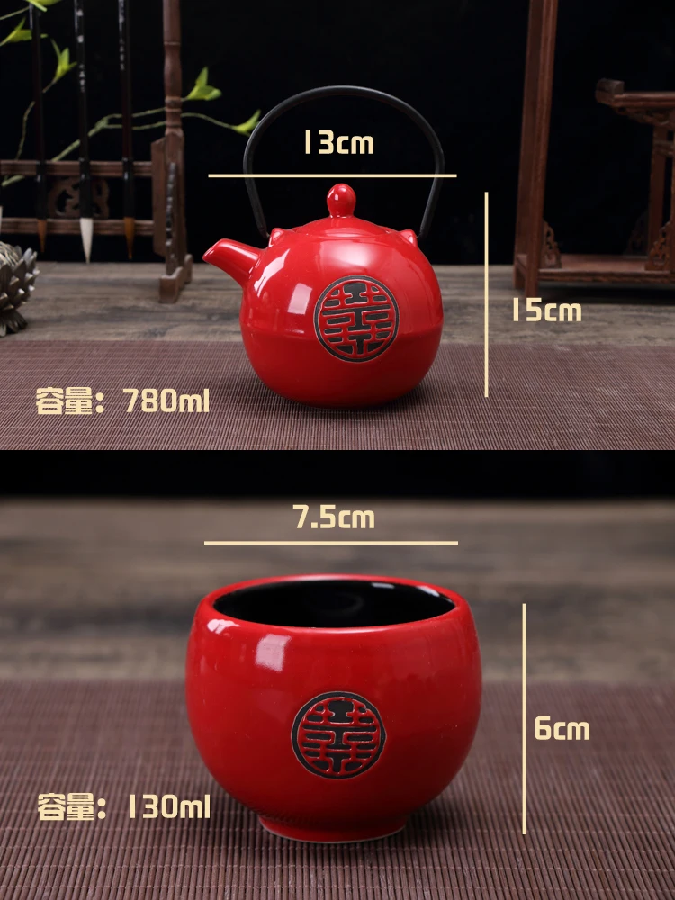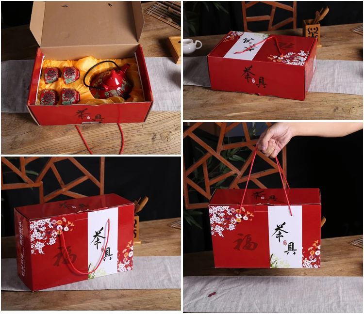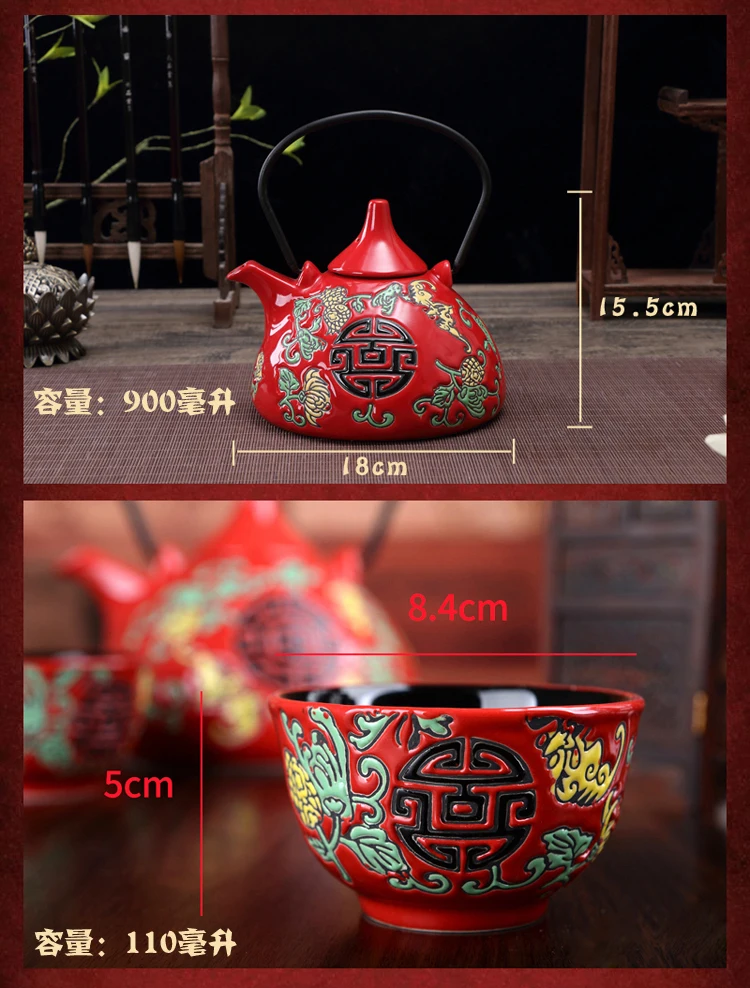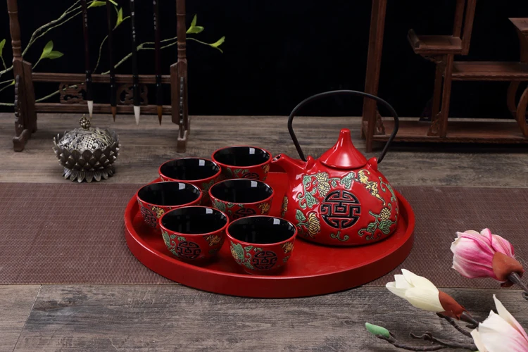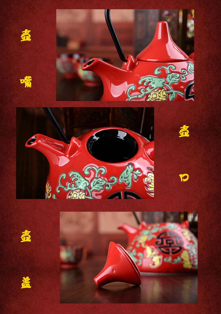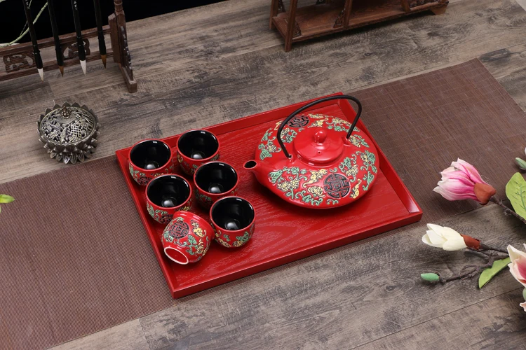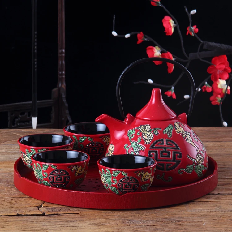 China Red Ceramic Tea Set Home Teapot 6 Teacups Kung Fu Black Tea Jin Jun Mei Teaware Creative Wedding New Wedding Gift Box