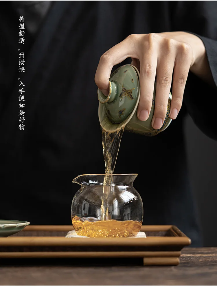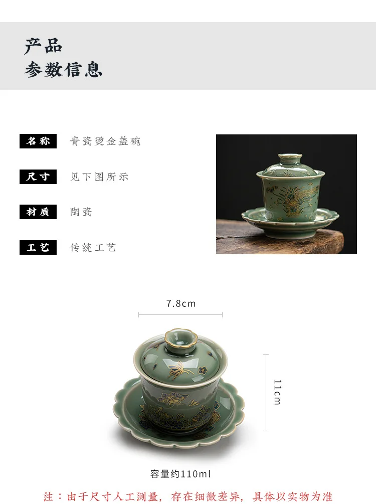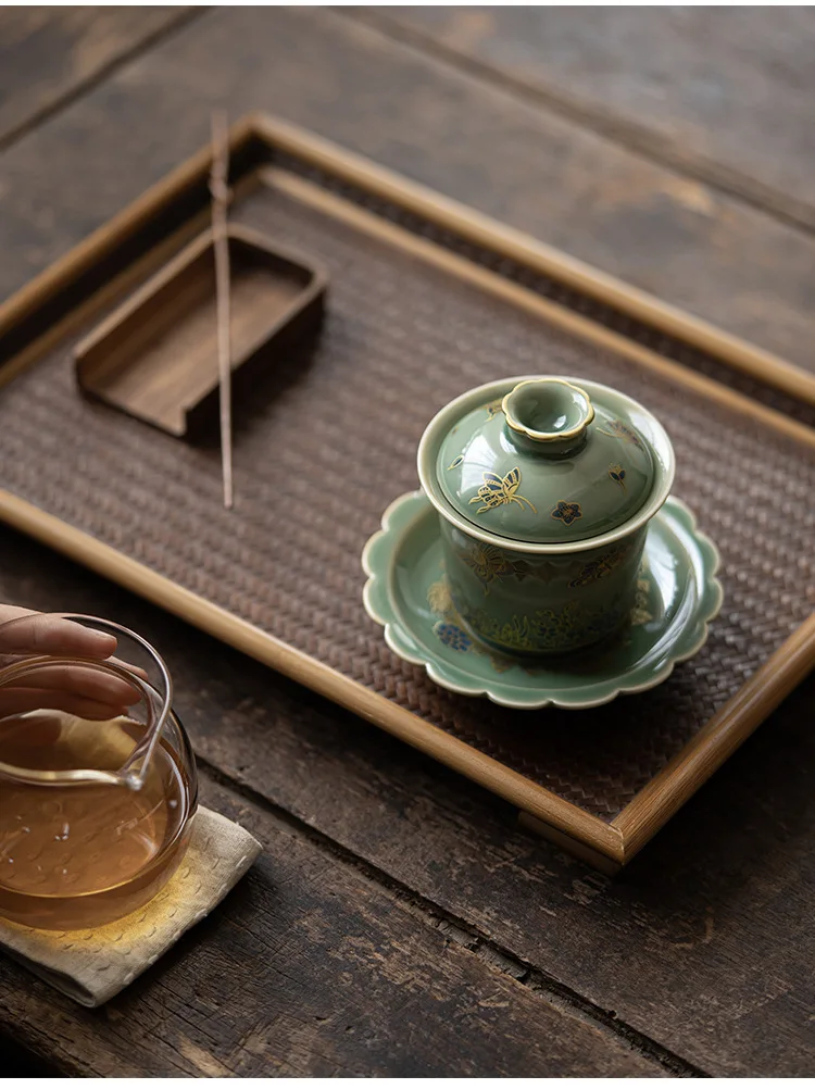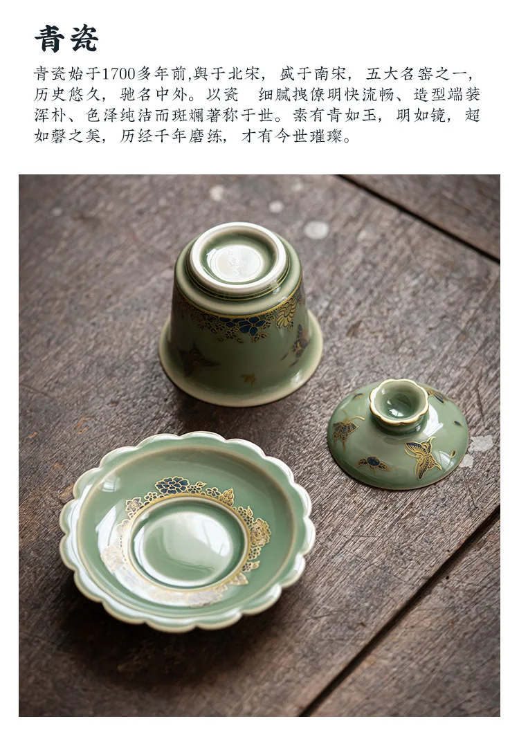 Chinese Elegant Gaiwan for Tea Jingdezhen Celadon Kung Fu Tea Tureen Handmade Ceramic Teaware Sancai Tea Bowl Cups