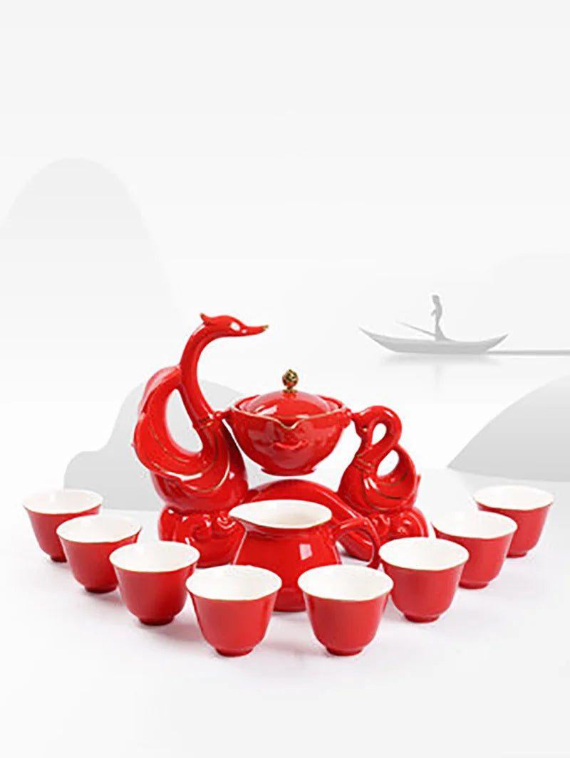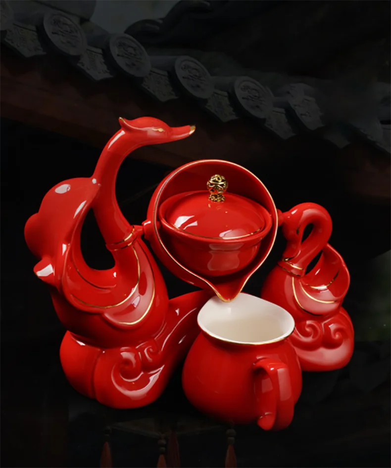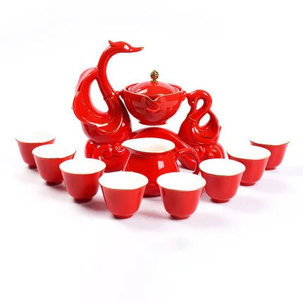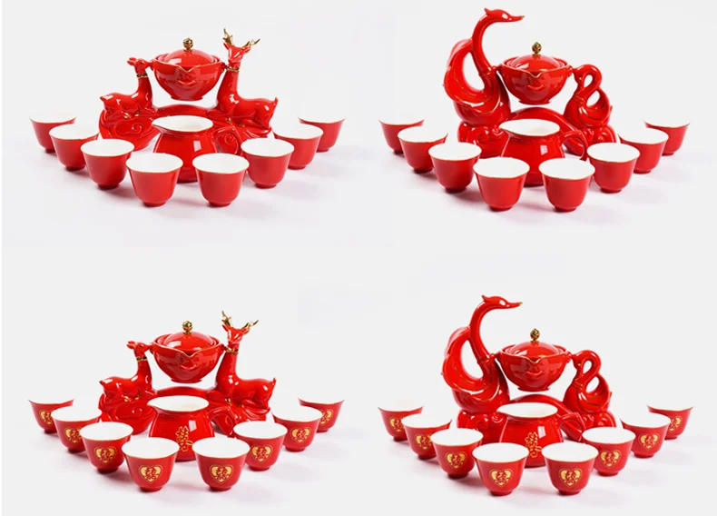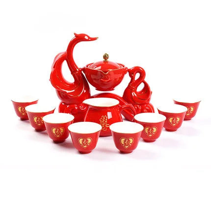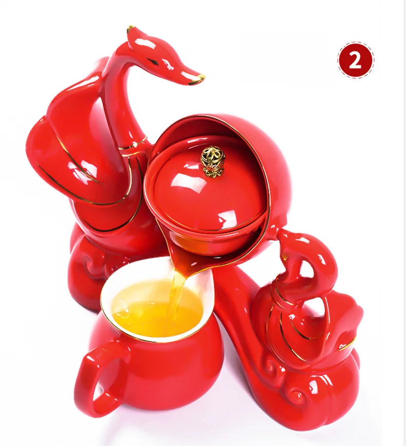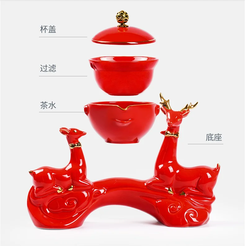 Chinese Traditional Red Wedding Automatic Kung Fu Tea Set Semi-automatic Office Tea Set Creative Lazy Ceramic Teapot Cup Teaware