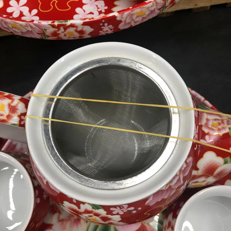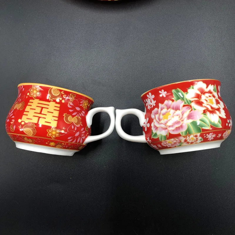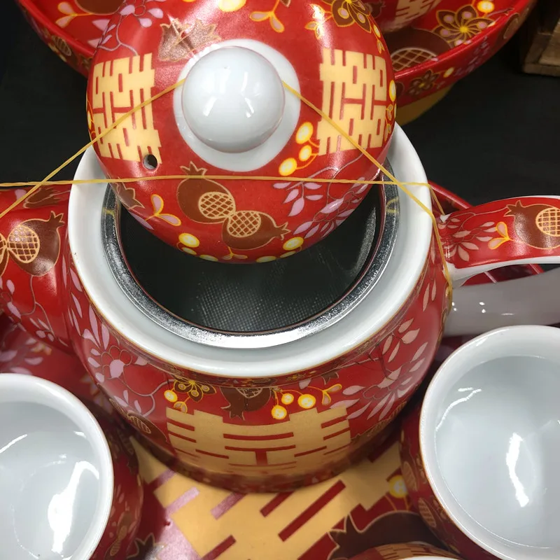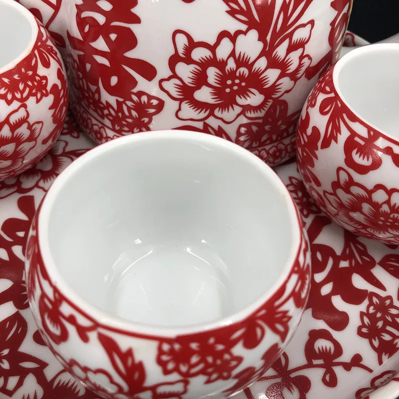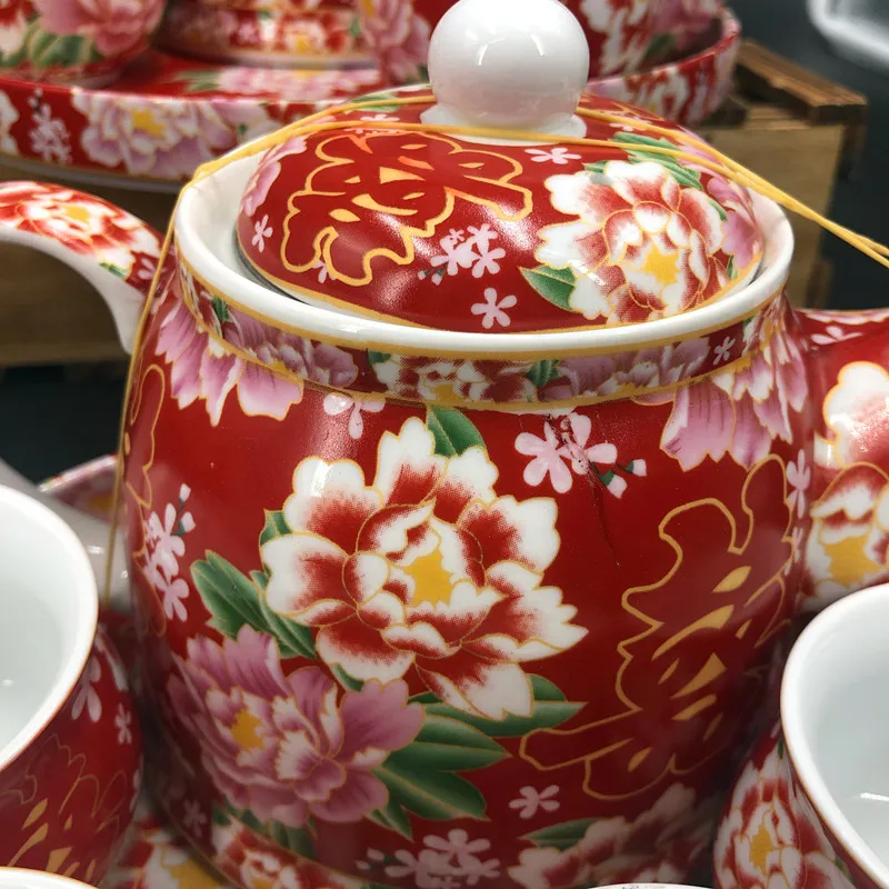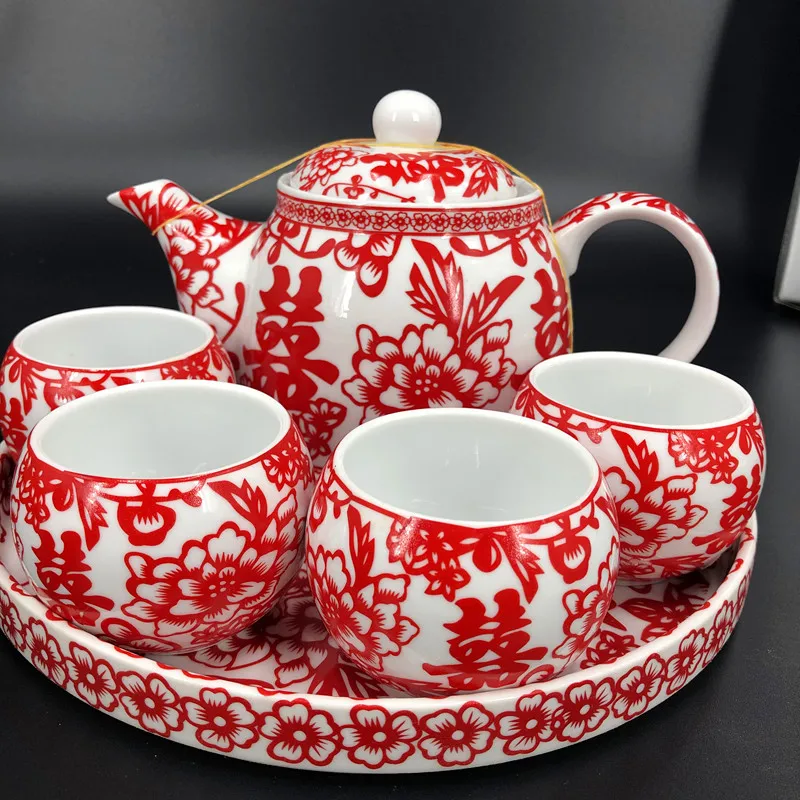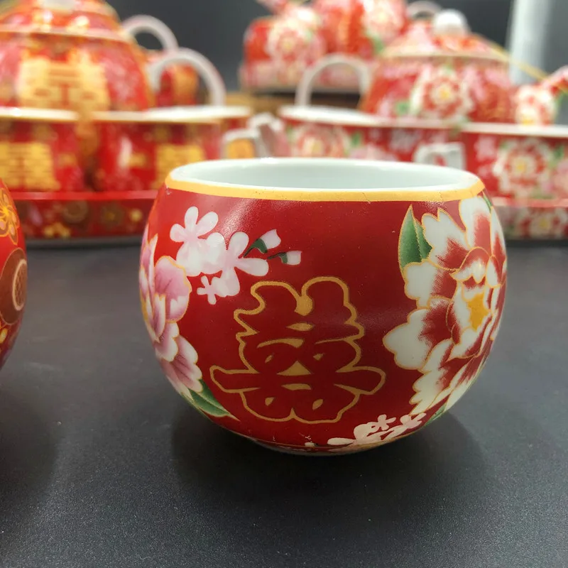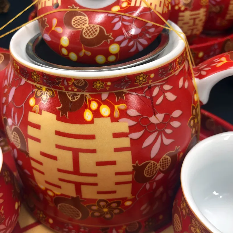 Chinese Traditional Wedding Ceramic Tea Set Retro Red Double Happiness Teapot Tea Cup Newlywed Bride Gift Dowry Marriage Supply