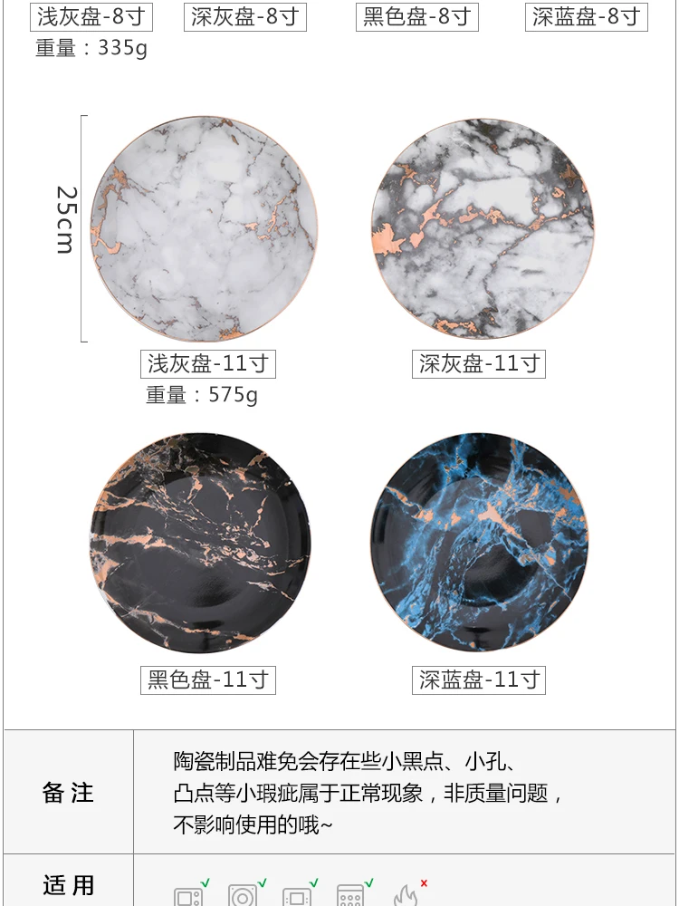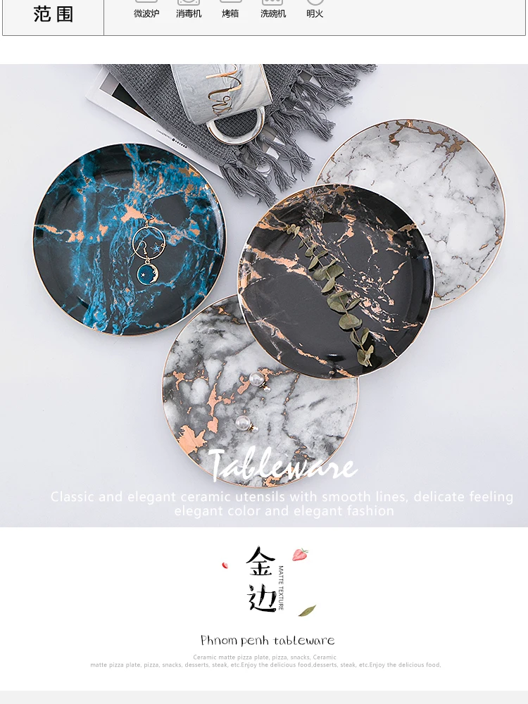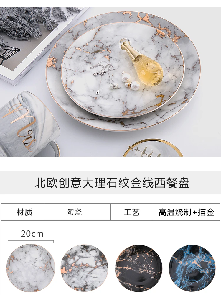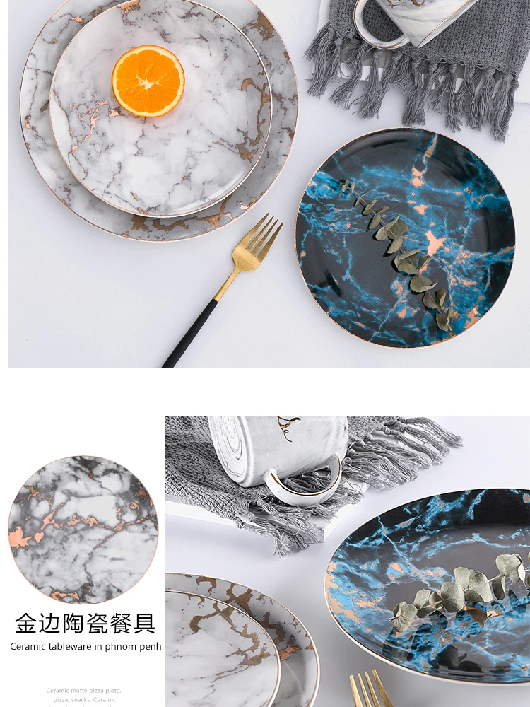 European Style Marble Plates Ceramic Dinner Set Gold Inlay Porcelain Dessert Plate Steak Salad Snack Cake Plates Tableware