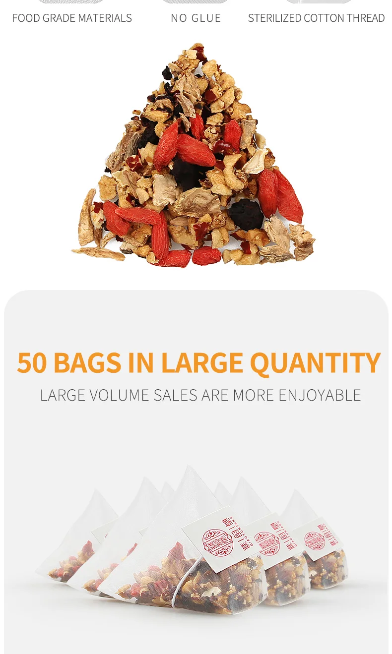 This product adopts a triangular tea bag design, which can prevent tea ingredients from entering the mouth when drinking.