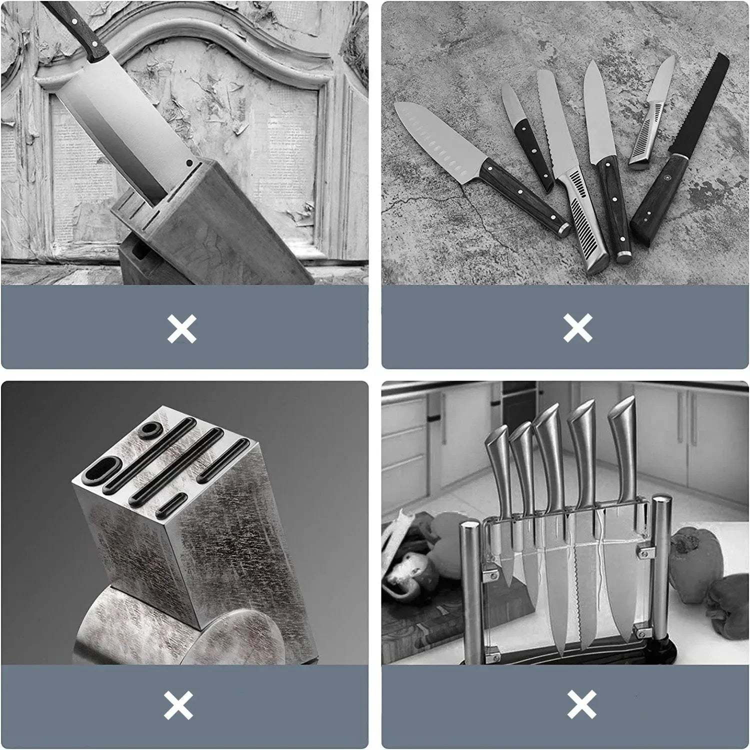 Our chef knife holder is versatile & easy to stow kitchenware tools. The rods conform as you insert each kitchen tool & knife, allowing you to insert them at any angle.