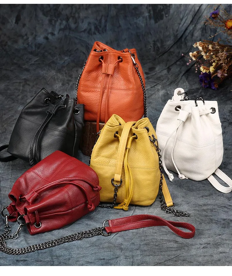 MS Cowhide Bag Luxury Handbags Women Chains Shoulder Bucket Bag Soft Natural Leather Bag Female Mini Bucket Yellow New In 2023