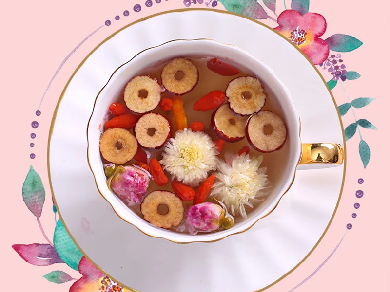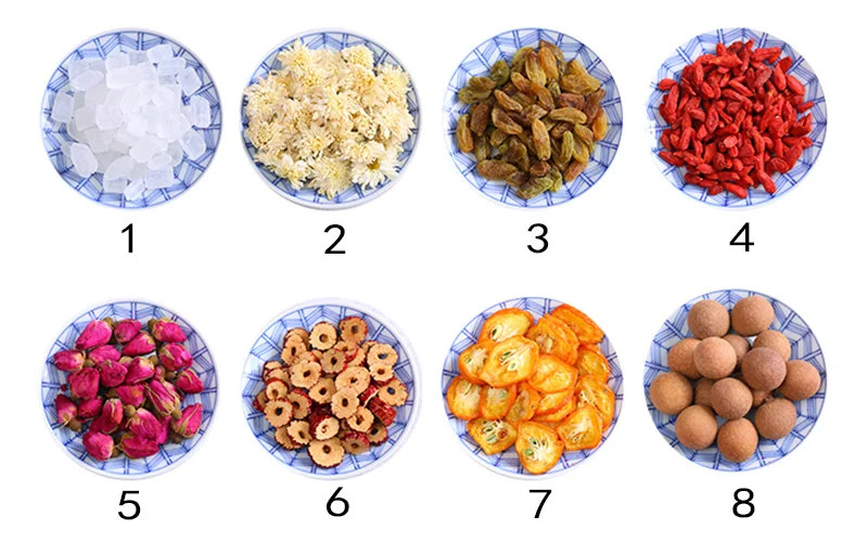 1. Rock sugar 2. chrysanthemum 3. raisin 4. goji berry 5. rose 6. jujube 7.dried kumquat 8. longan