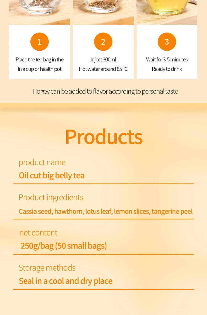 Product ingredients:Cassia seed, hawthorn, lotus leaf, lemon slices, tangerine peel