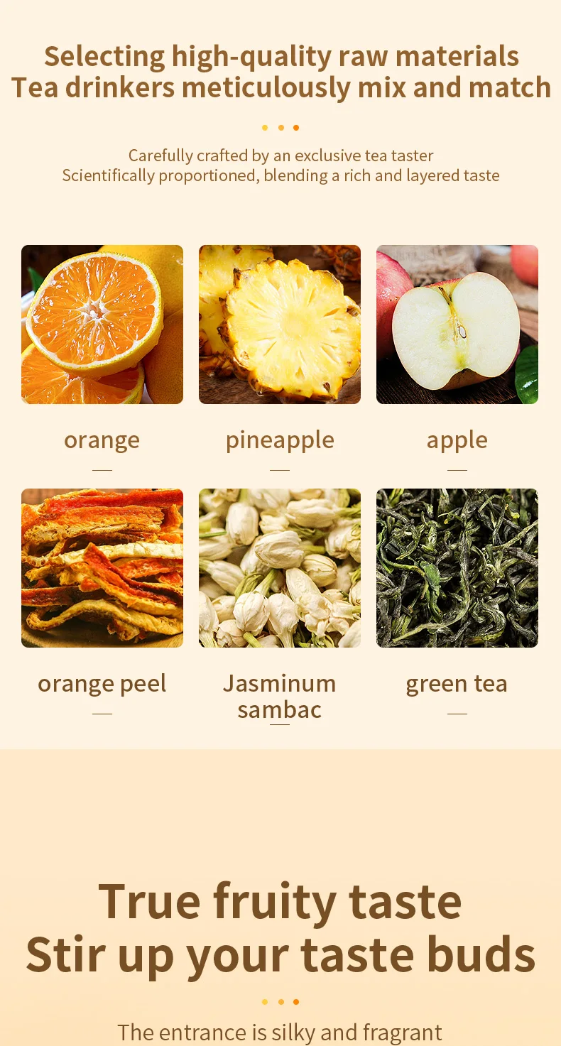Ingredients: orange peel, dried apple, dried orange, green tea, Jasminum sambac, dried pin eapple