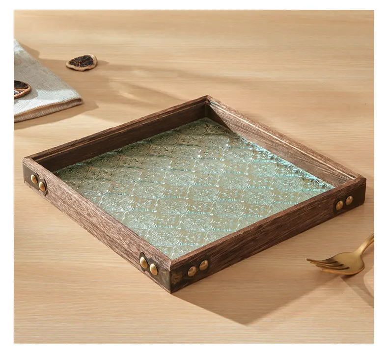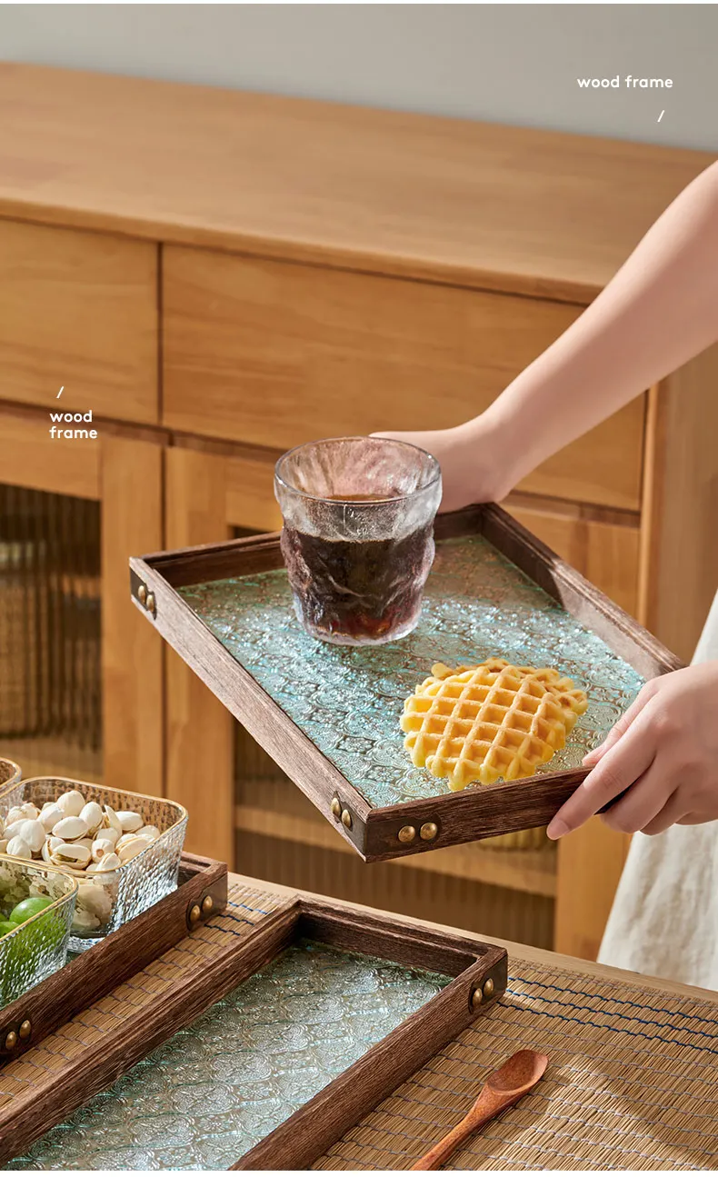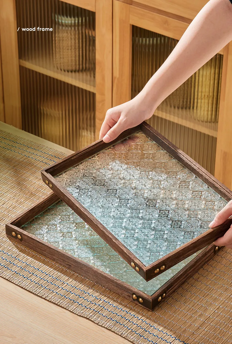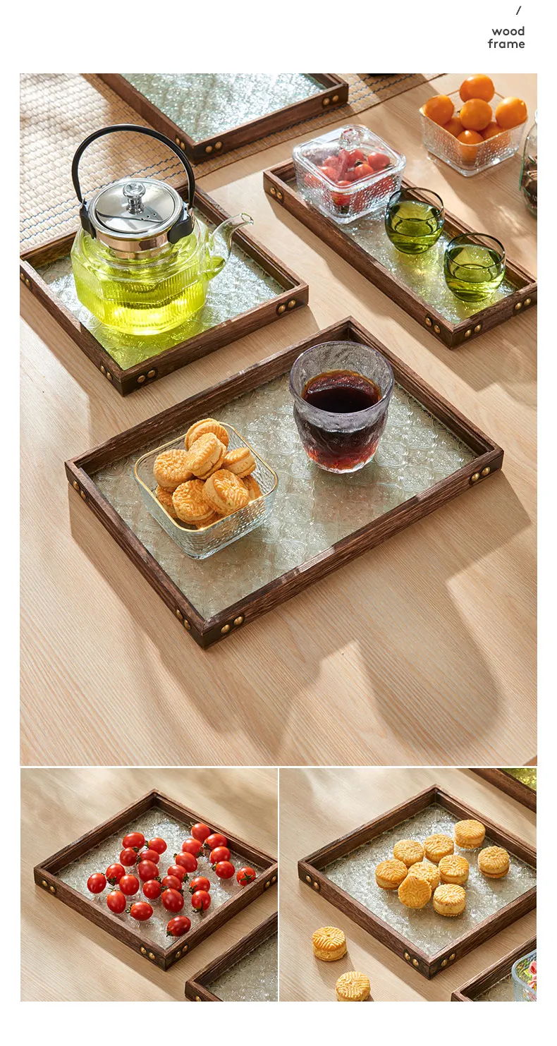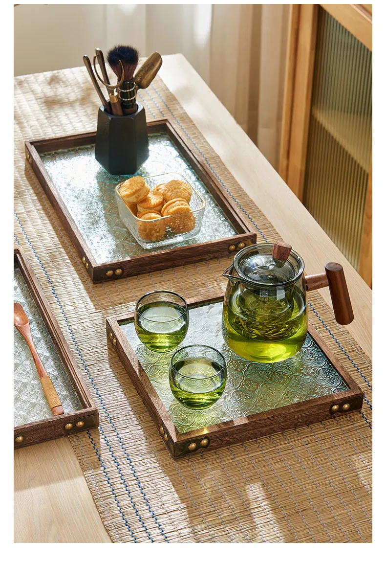 Solid Glass Wooden Tea Table Tray Coffee Snack Food Meals Chinese Tea Serving Tray Rectangular Fruit Bowl