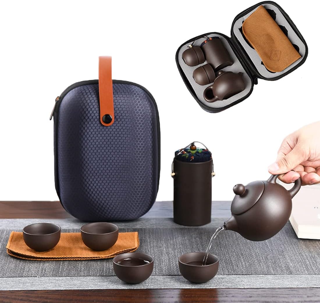 Zisha Travel Tea Sets 6 Pack Portable Chinese Kungfu Tea Set Ceramic Teapot Sets for adults, Purple Clay Tea pot 4 Teacups Canister in One Bag for Outdoor Picnic Business, Christmas Gift Tea Sets