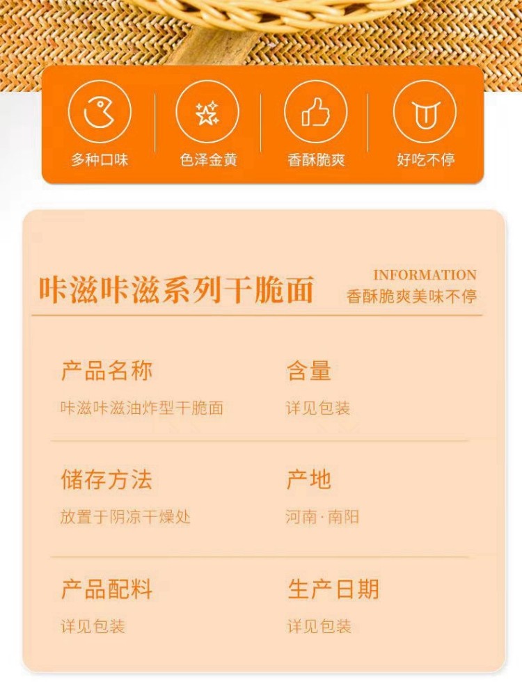 方便干吃脆面鸿四方咔滋大包零食 Easy To Eat Crispy Noodles Red Square Big Bag of Crunch Snacks 保质期:180天 Shelf life:180days 储存条件: 常温 Storage condition: room tempera