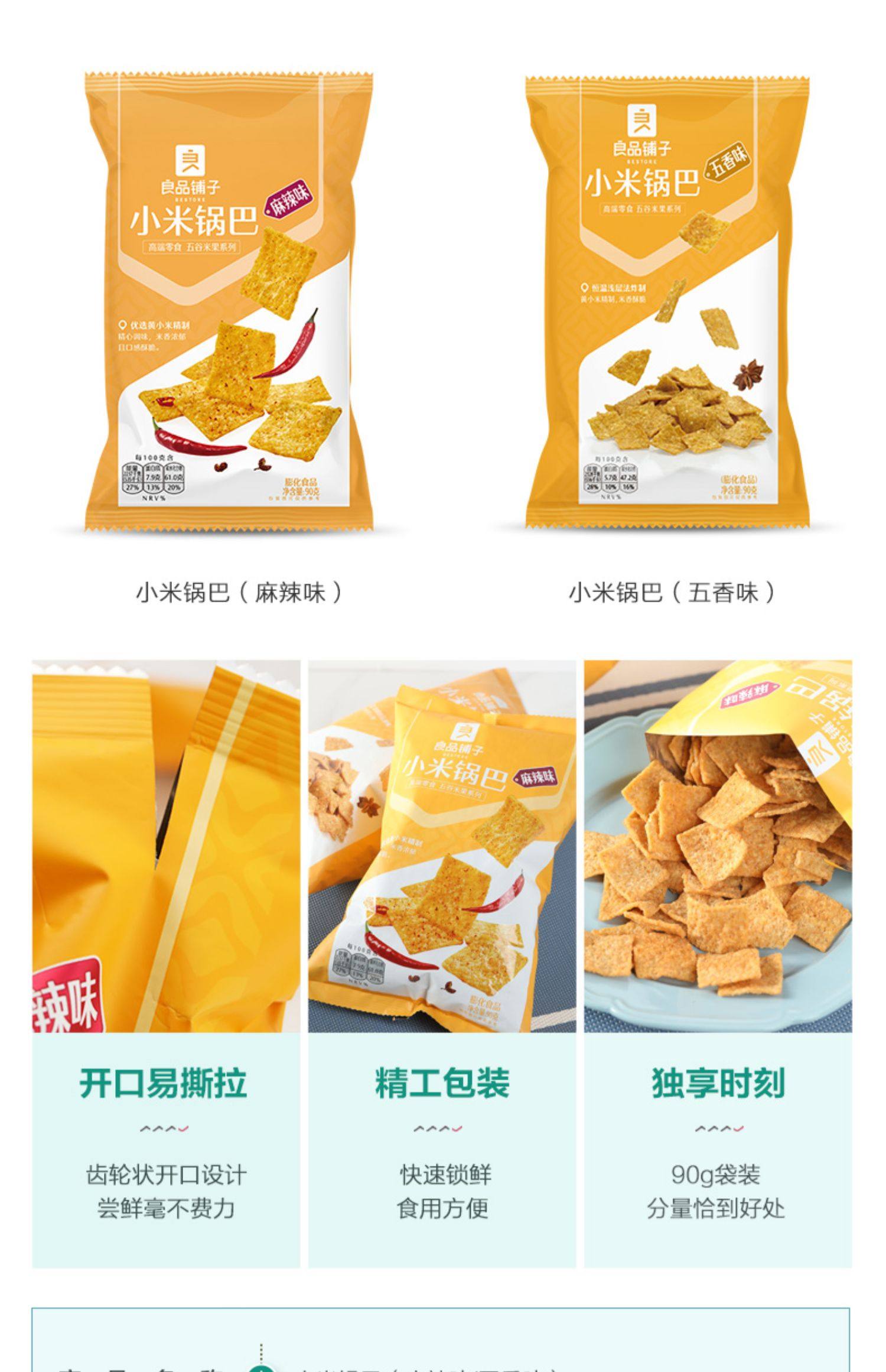 良品铺子小米锅巴麻辣休闲零食 Good Food Shop Millet Pot Spicy Casual Snacks 保质期:270天 Shelf life:270days 储存条件: 常温 Storage condition: room tempera