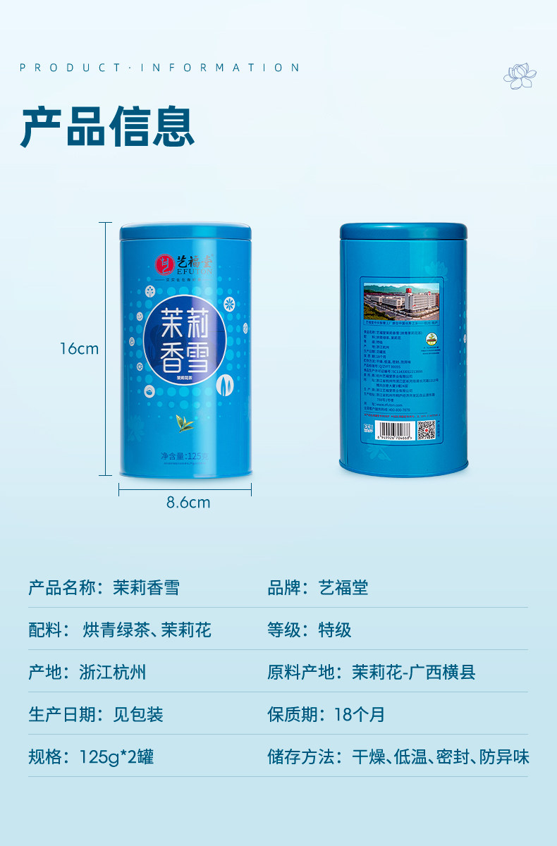 艺福堂 茉莉香雪250g Chinese tea Yifutang Jasmine tea特级浓香型2020新茶绿茶散装罐装 大份量半斤装 炒花新工艺