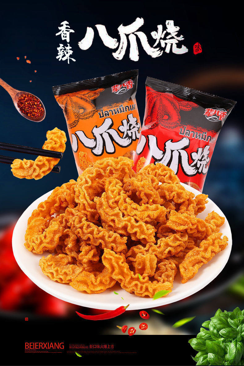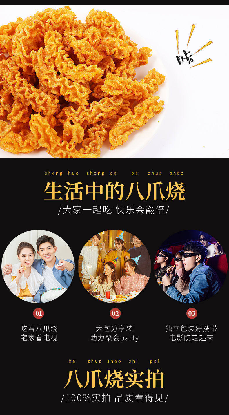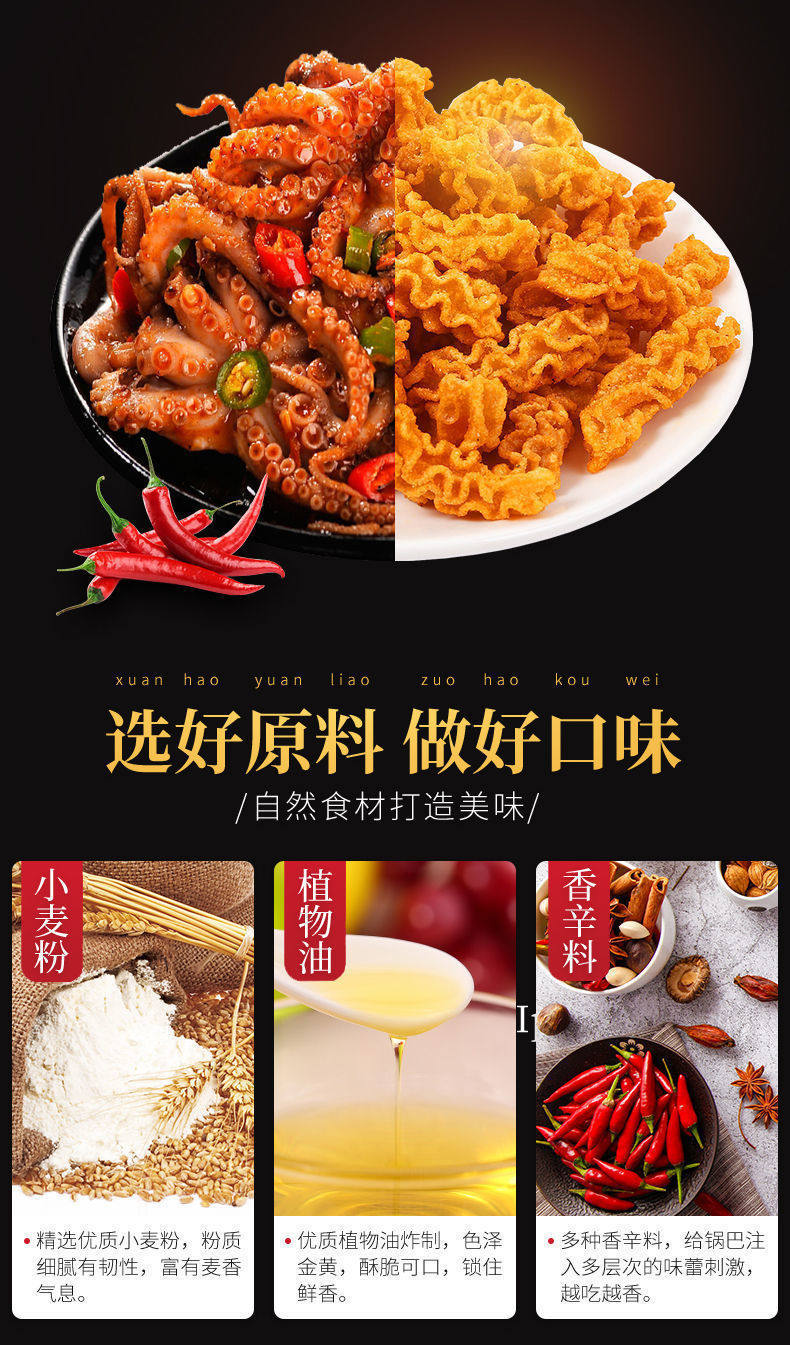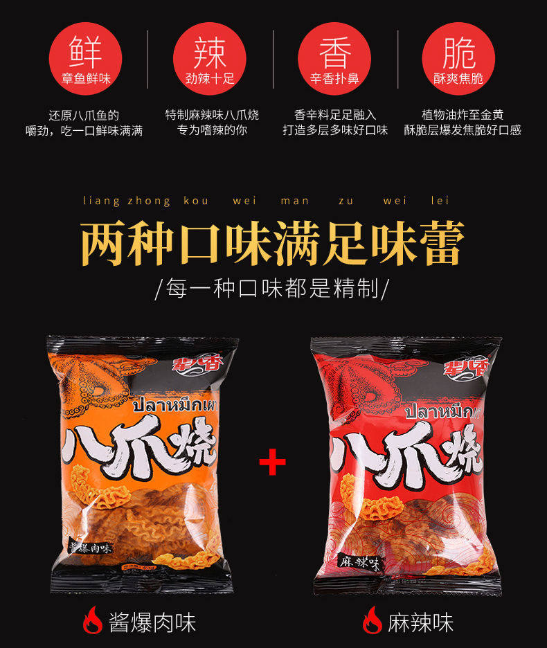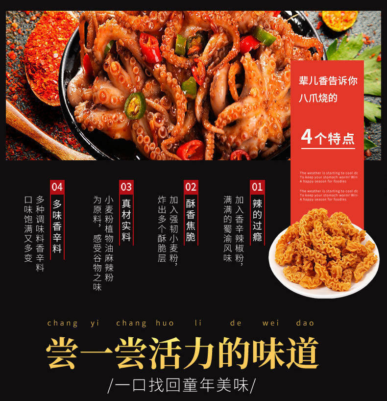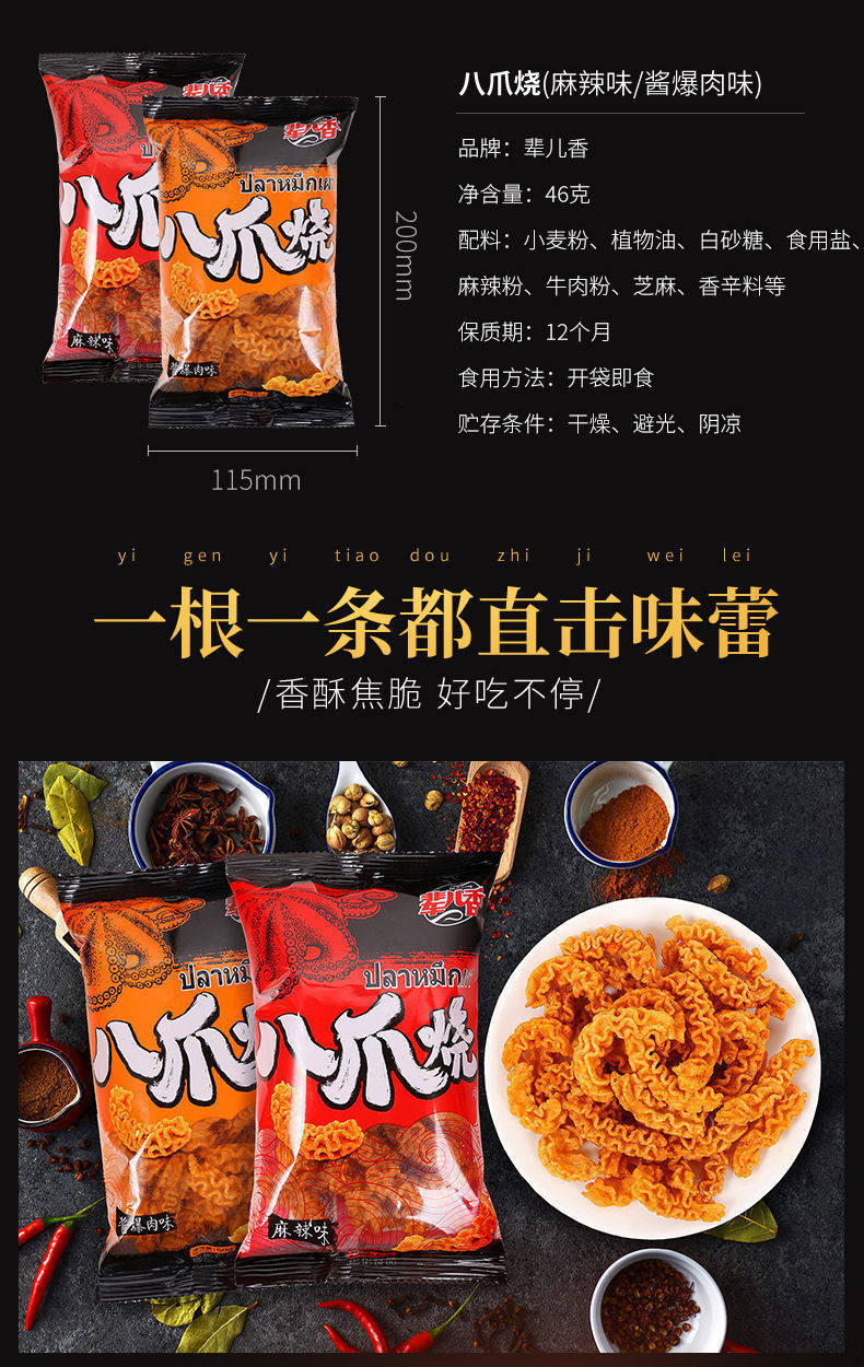 辈儿香麻辣八爪烧酥脆小吃零食 46g/包 Minero Spicy Octopus Crispy snack 46g/ pack 保质期:365天 Shelf life: 365days 储存条件: 常温 Storage condition: room temperature
