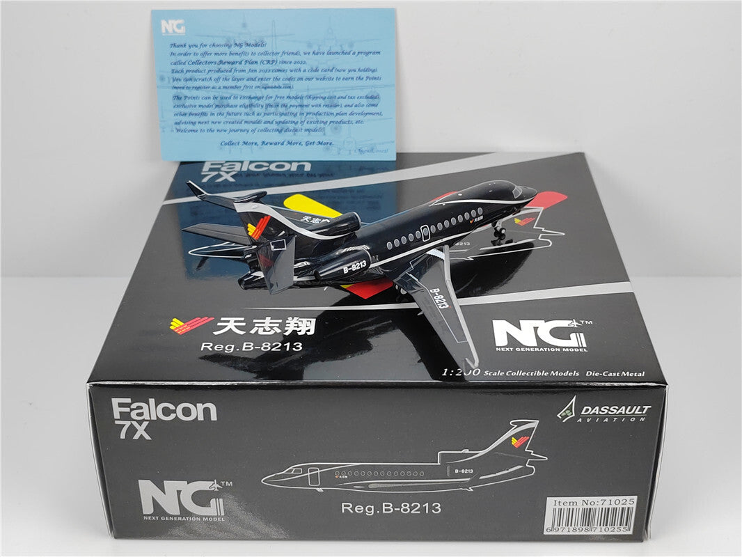 Scale: 1:200 Color: As the pictures shown Material: Diecast Brand: NG Model Registration: B-8213 Label: DASSAULT Aircraft: Falcon 7x Model Number: 71025 Condition: Brand new Packing: Mint in original box