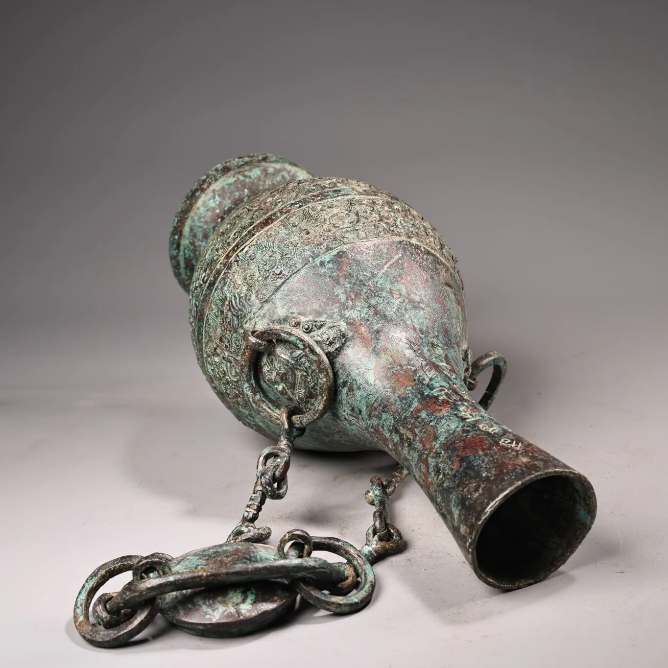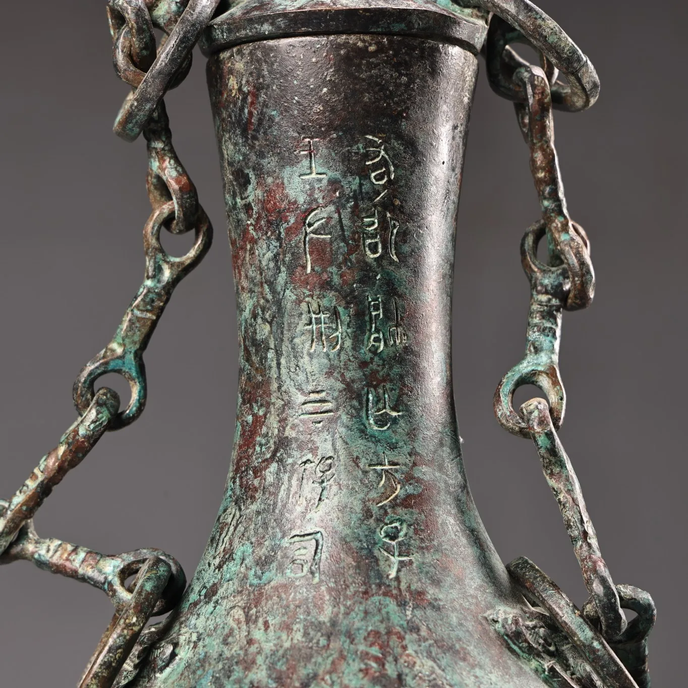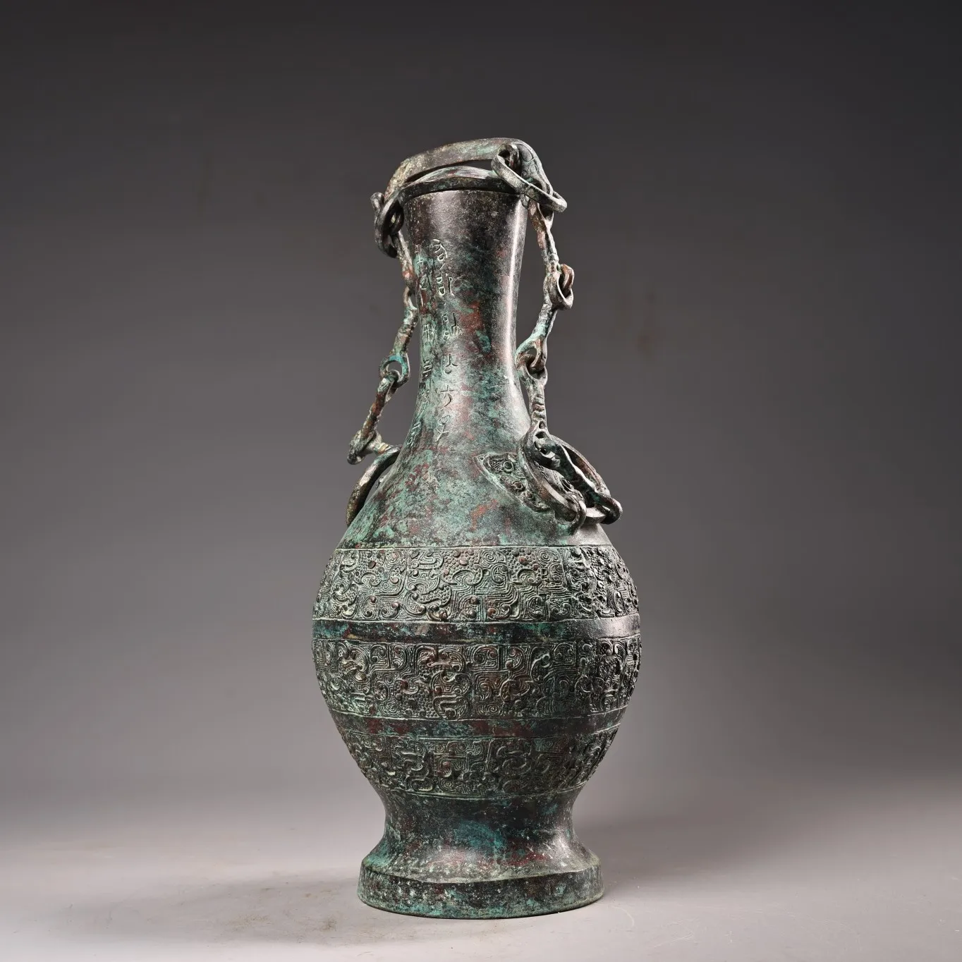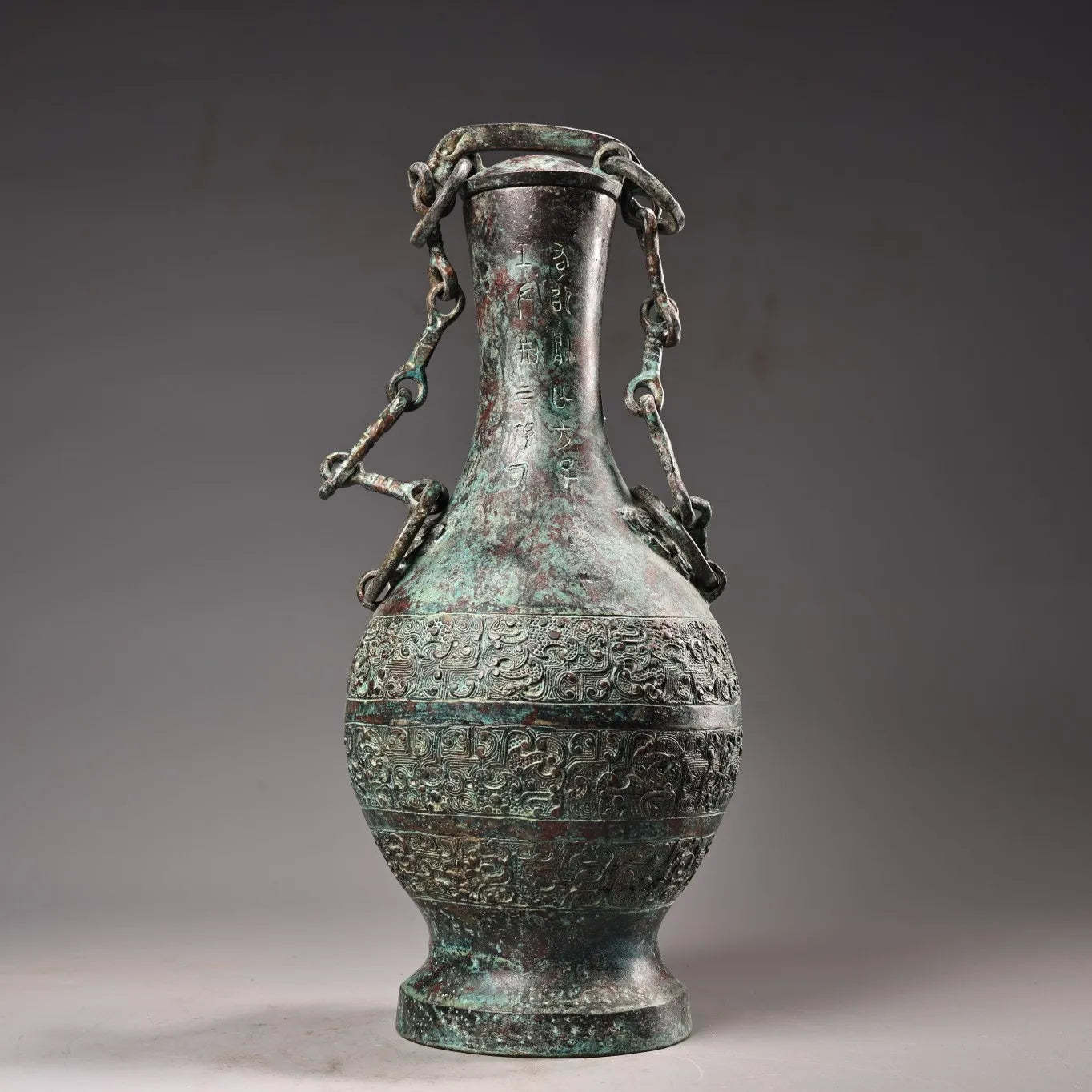 10"Tibetan Temple Collection Old Bronze verdigris Cinnabar Ancient script Beast Head Texture Copper ring raised beam Vase