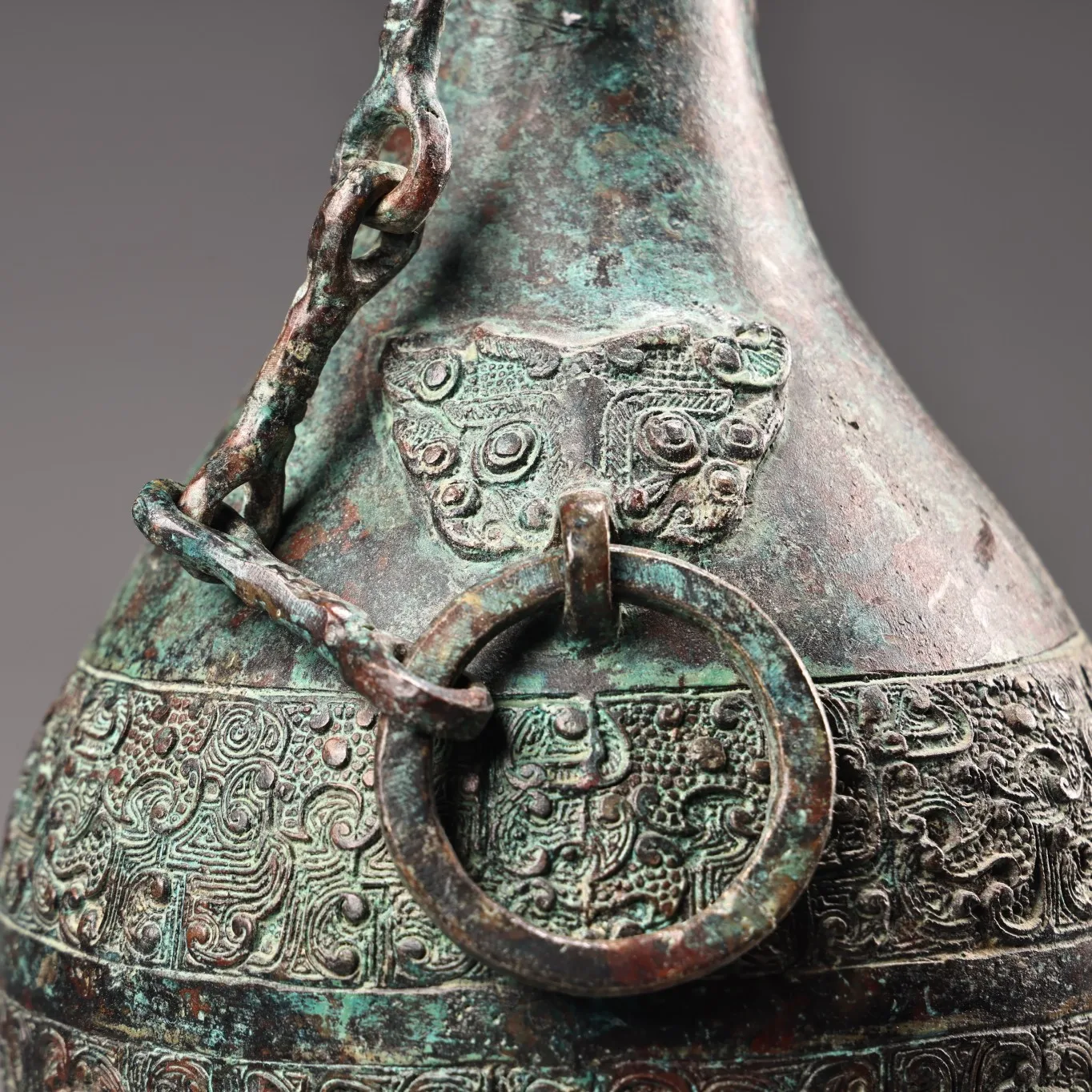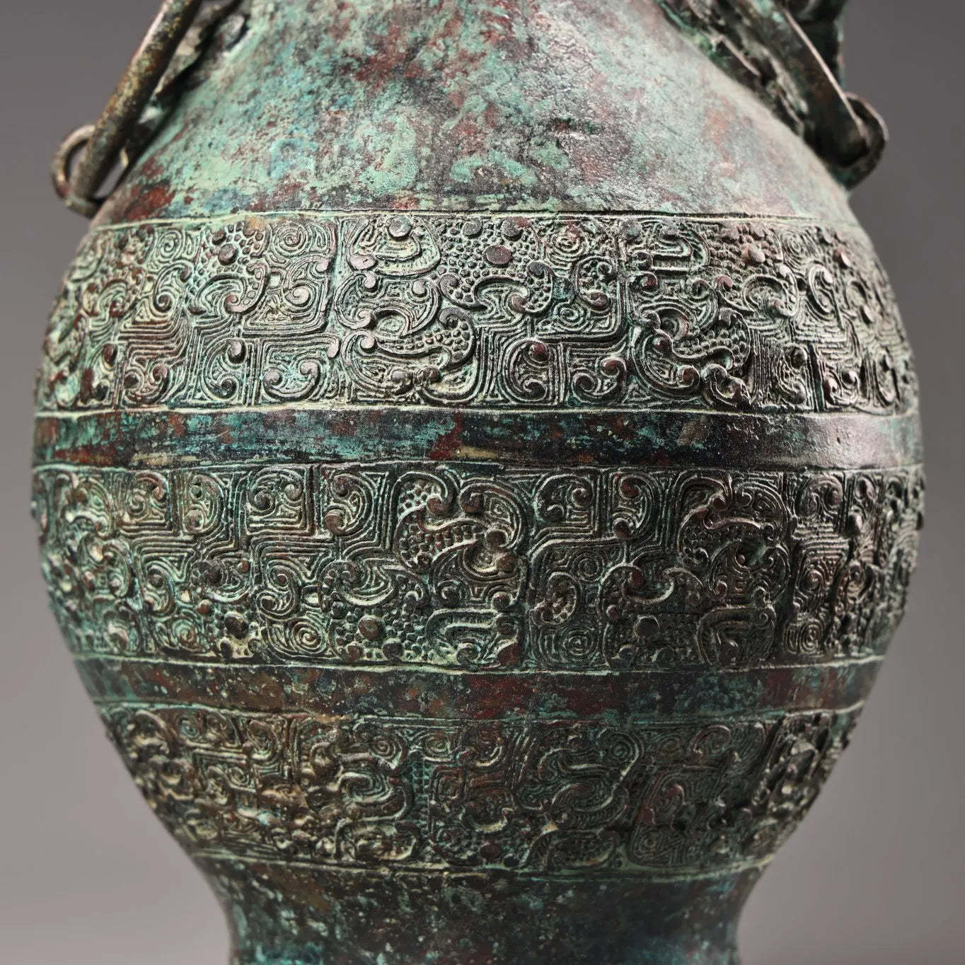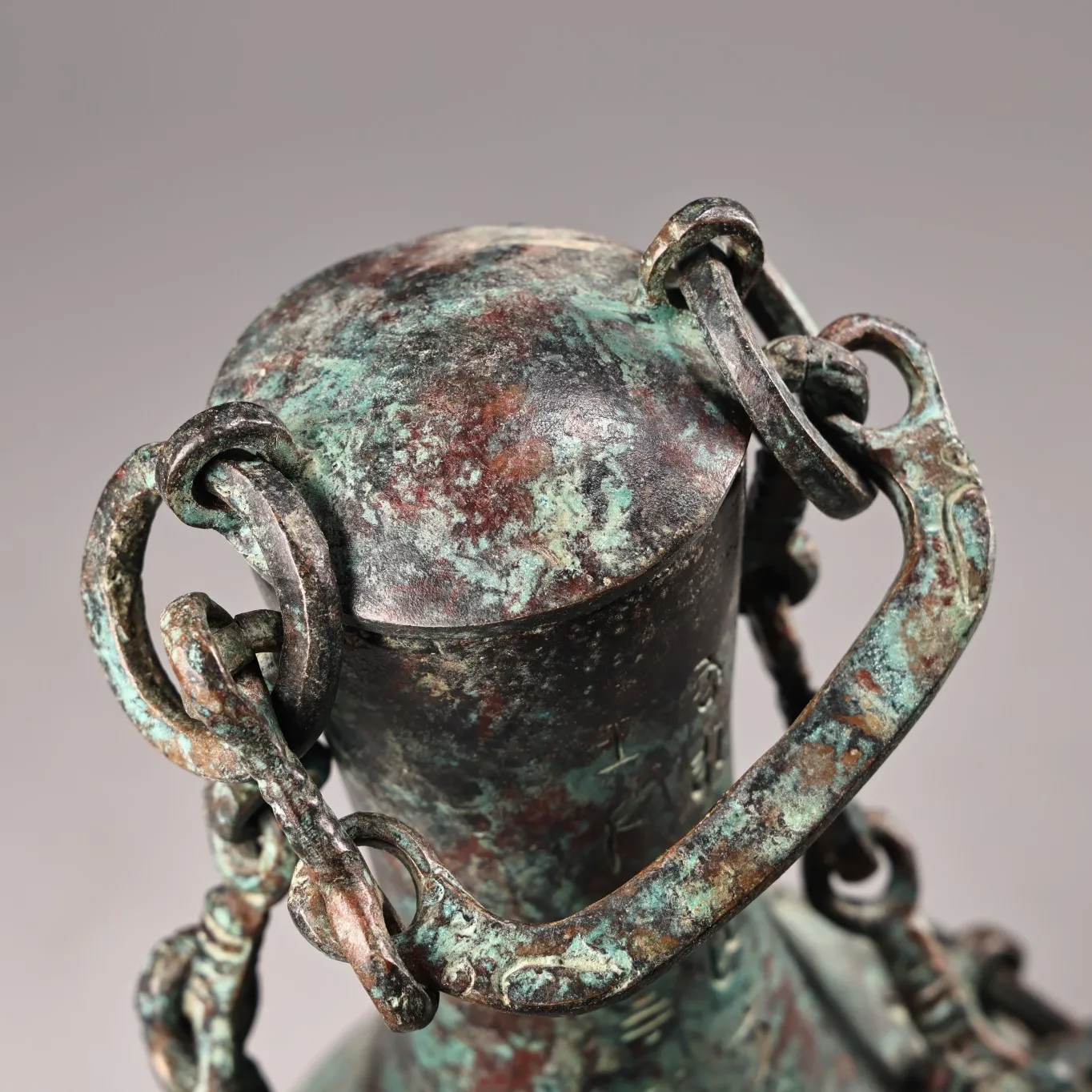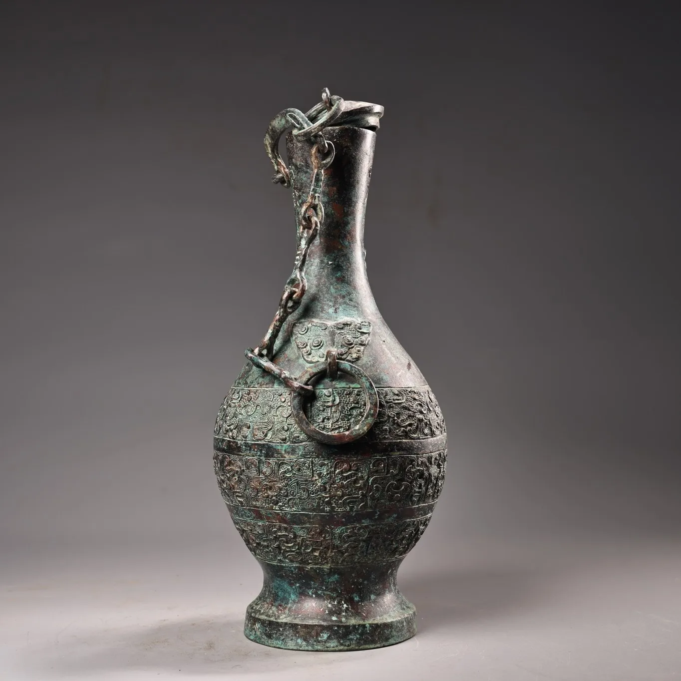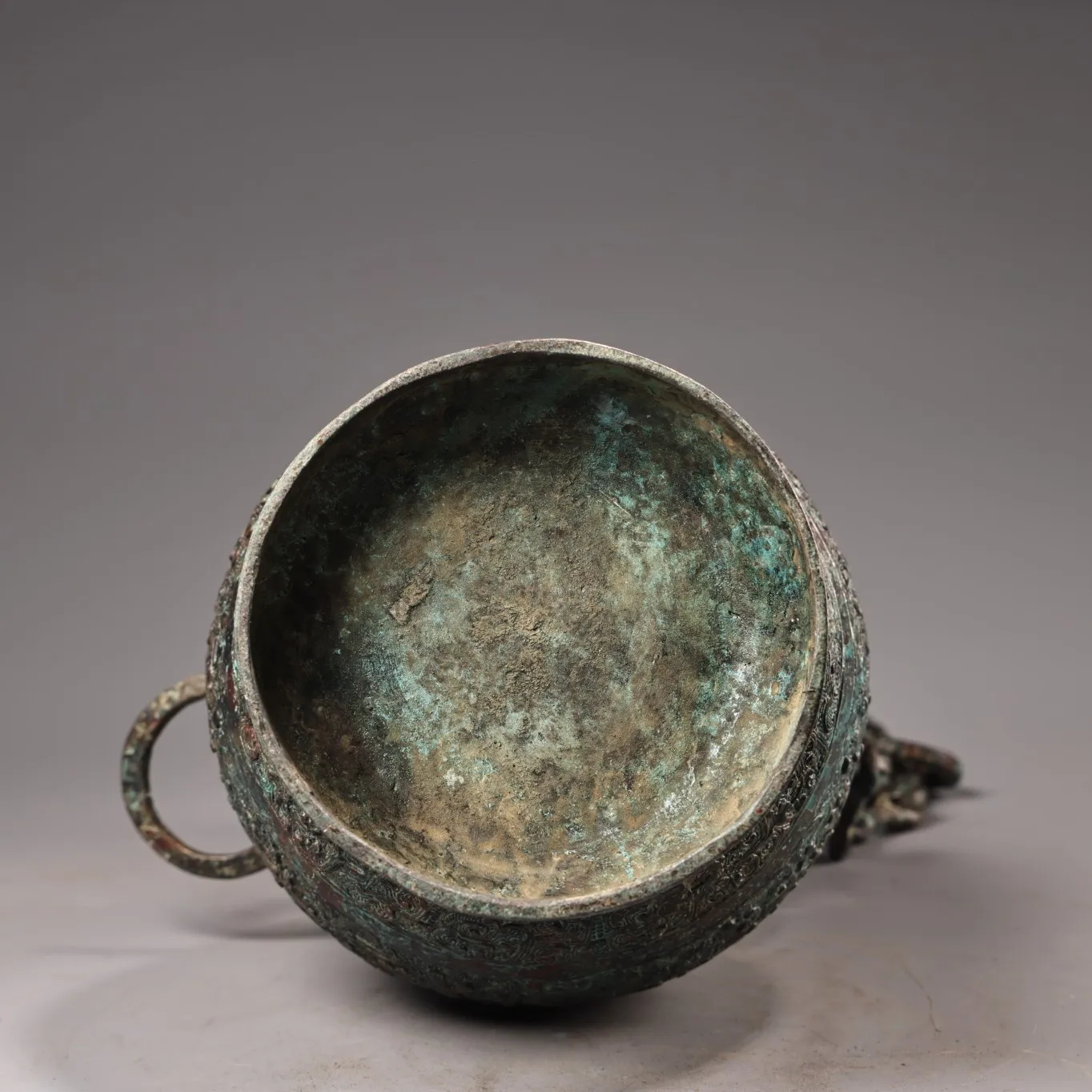 10"Tibetan Temple Collection Old Bronze verdigris Cinnabar Ancient script Beast Head Texture Copper ring raised beam Vase