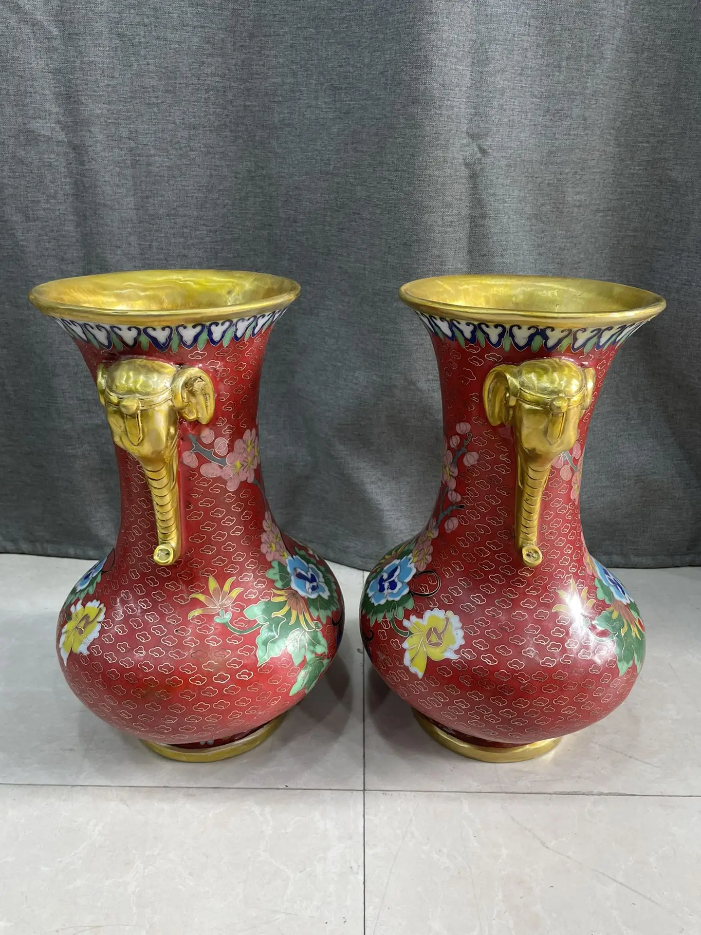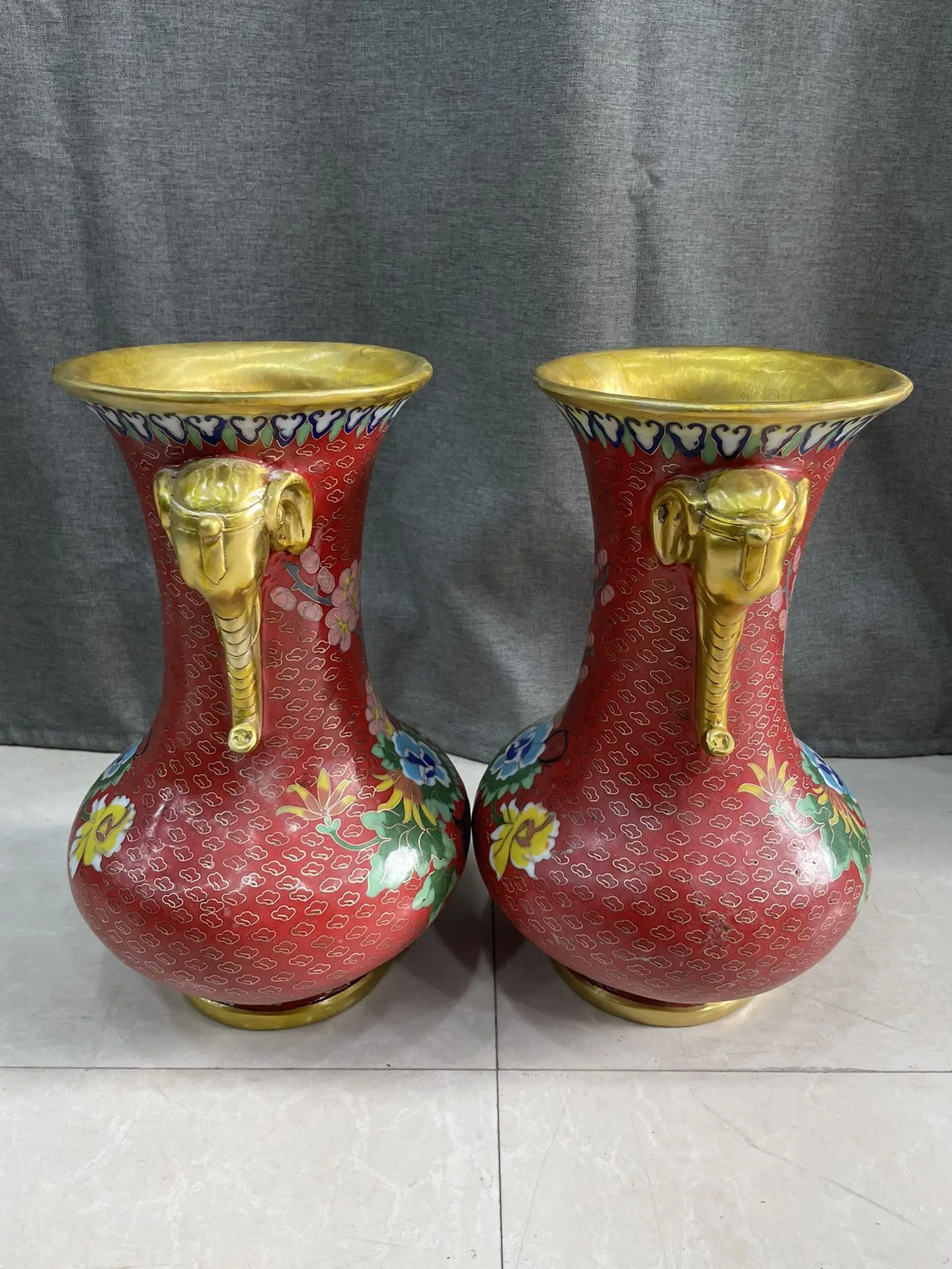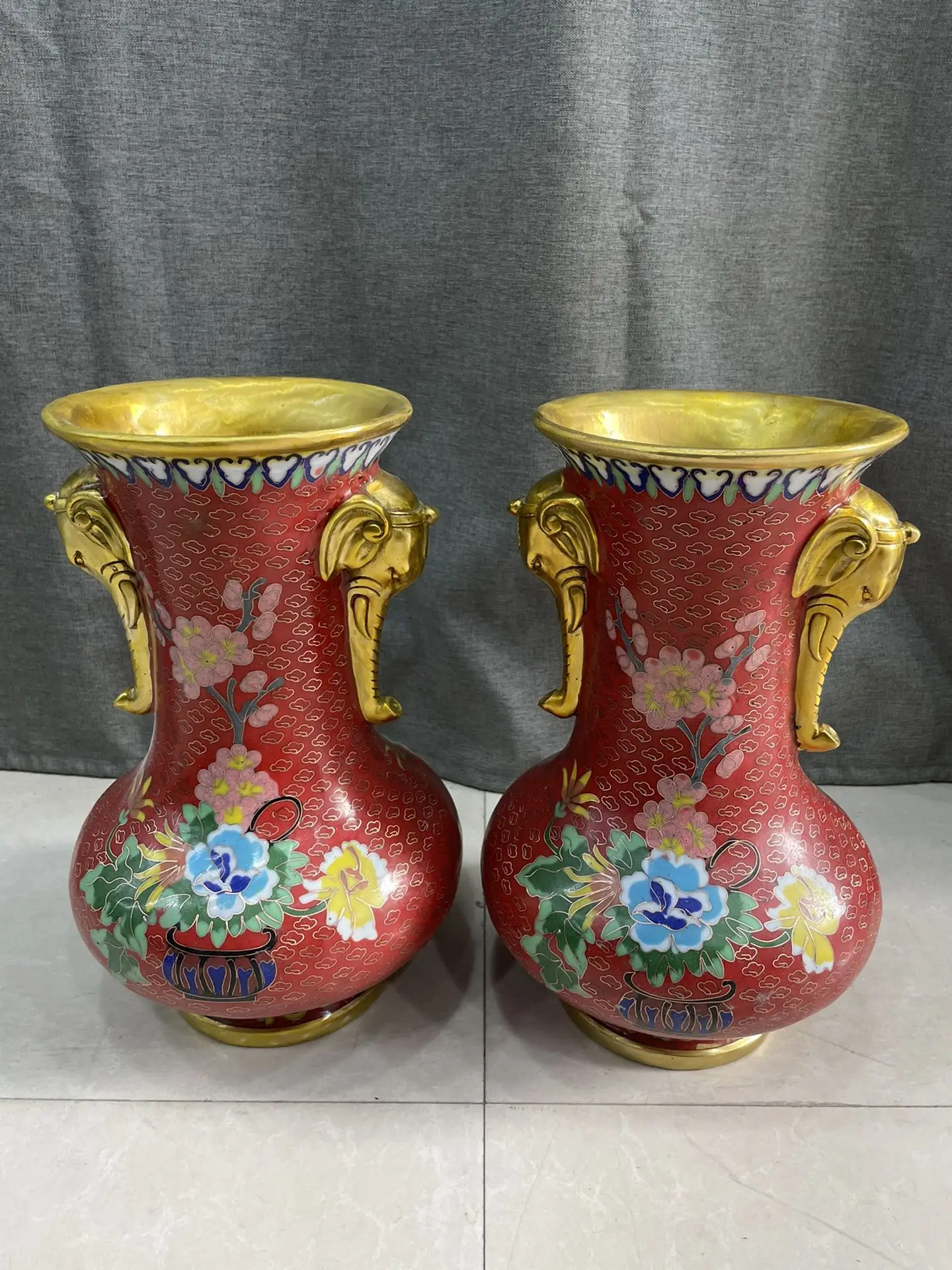 12"Tibet Temple Collection Old Bronze Cloisonne Enamel Peony flower Elephant Trunk bocksbeutel Vase A Pair Ornaments Town house