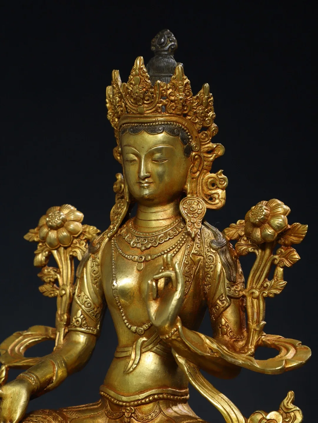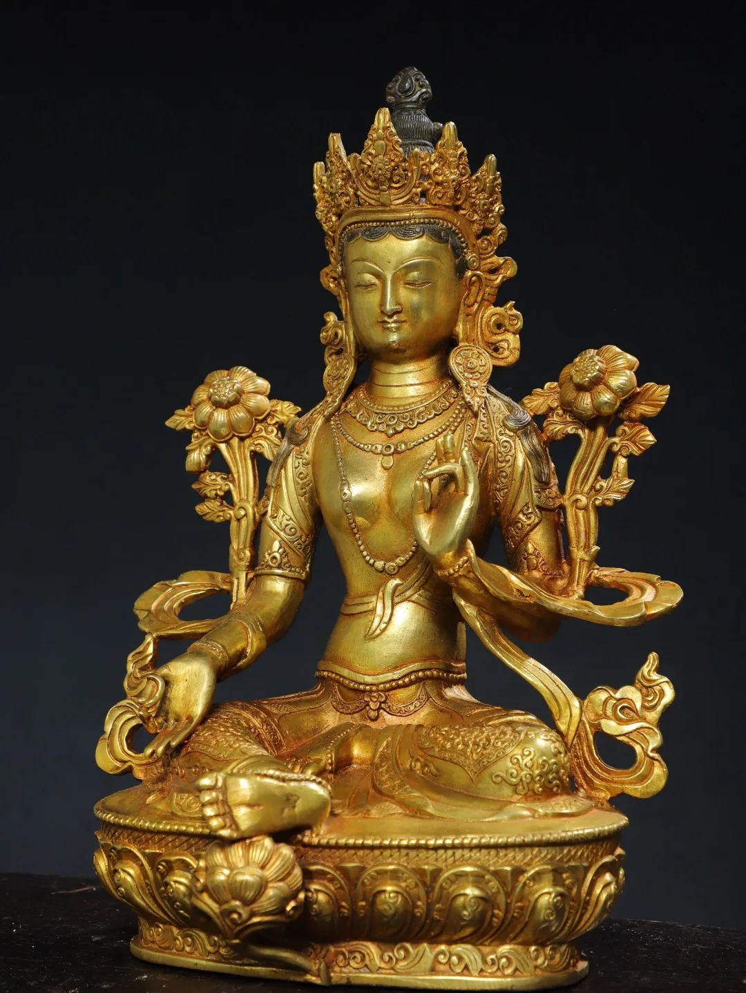 13"Tibetan Temple Collection Old Bronze Cinnabar Gilded Green Tara Lotus Terrace Sitting Buddha Worship Hall Town house