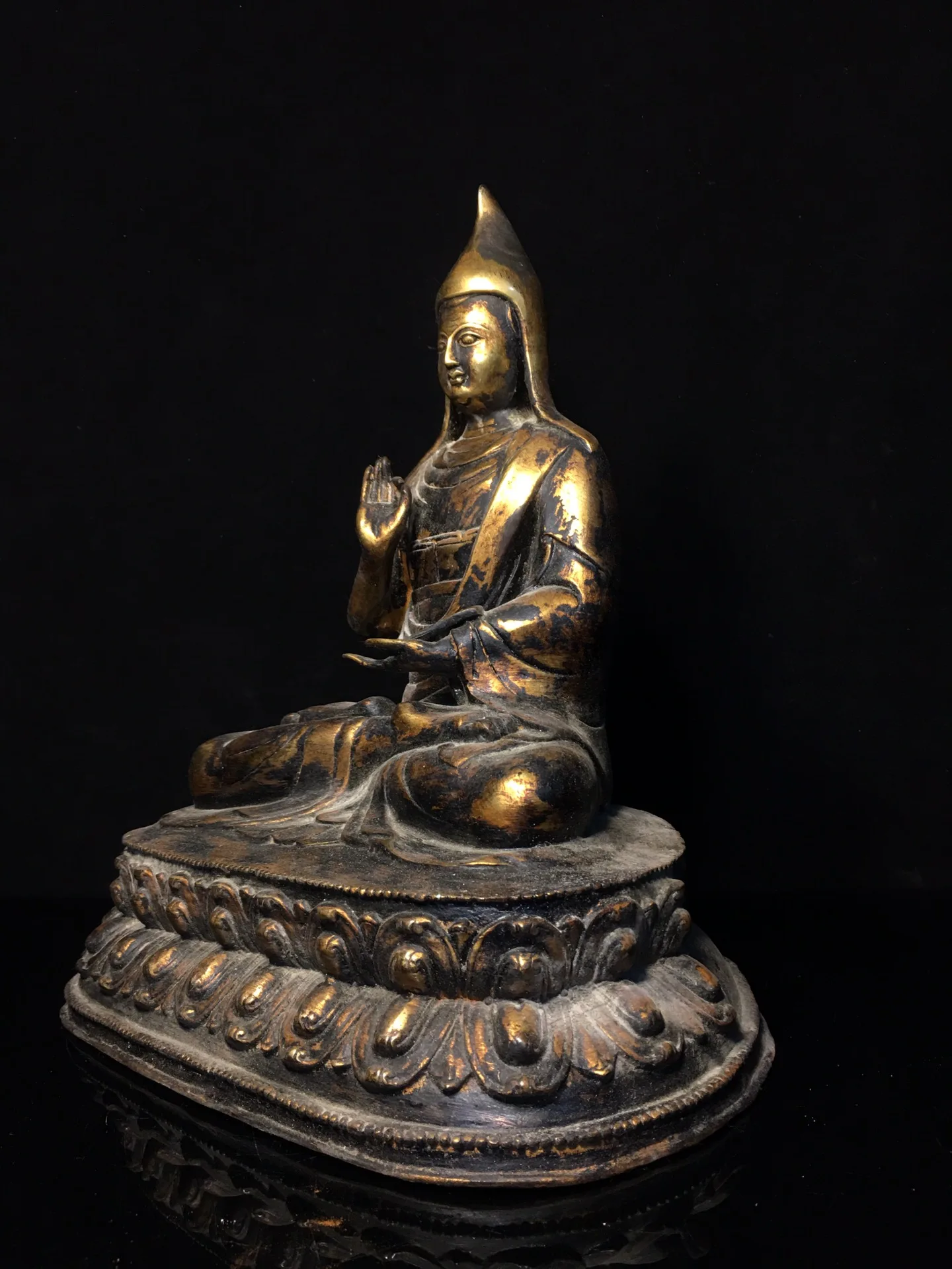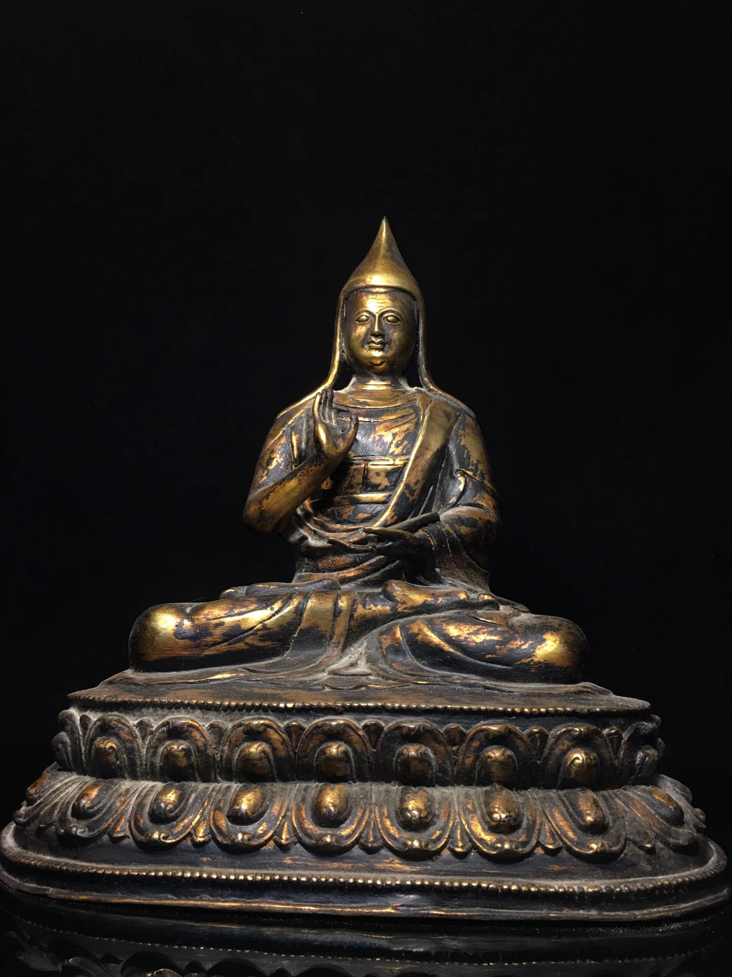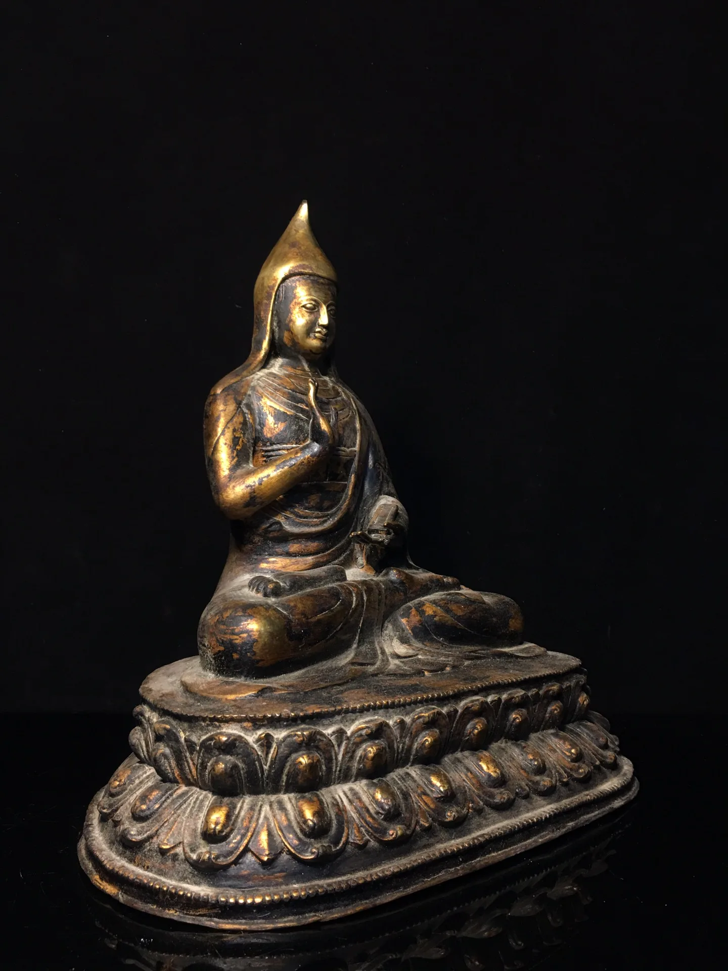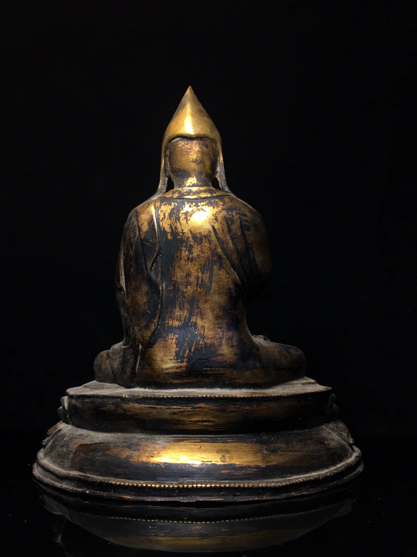 14"Tibet Temple Collection Old Bronze Cinnabar Mud gold Tsongkhapa Double Lotus Terrace Sitting Buddha Worship Hall