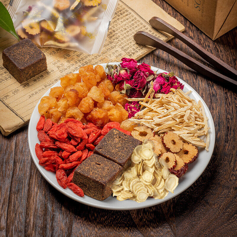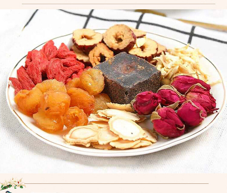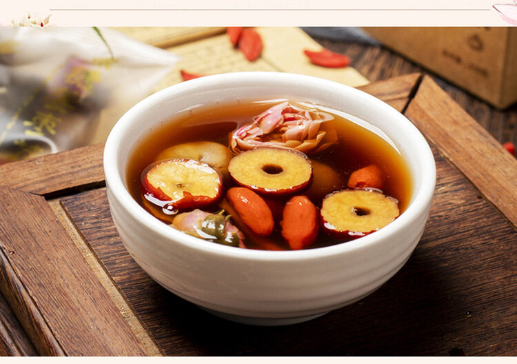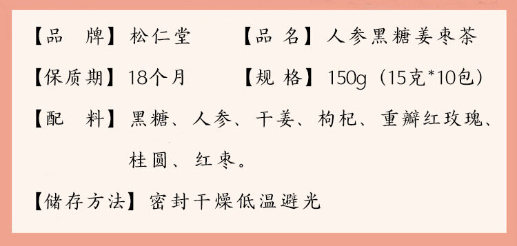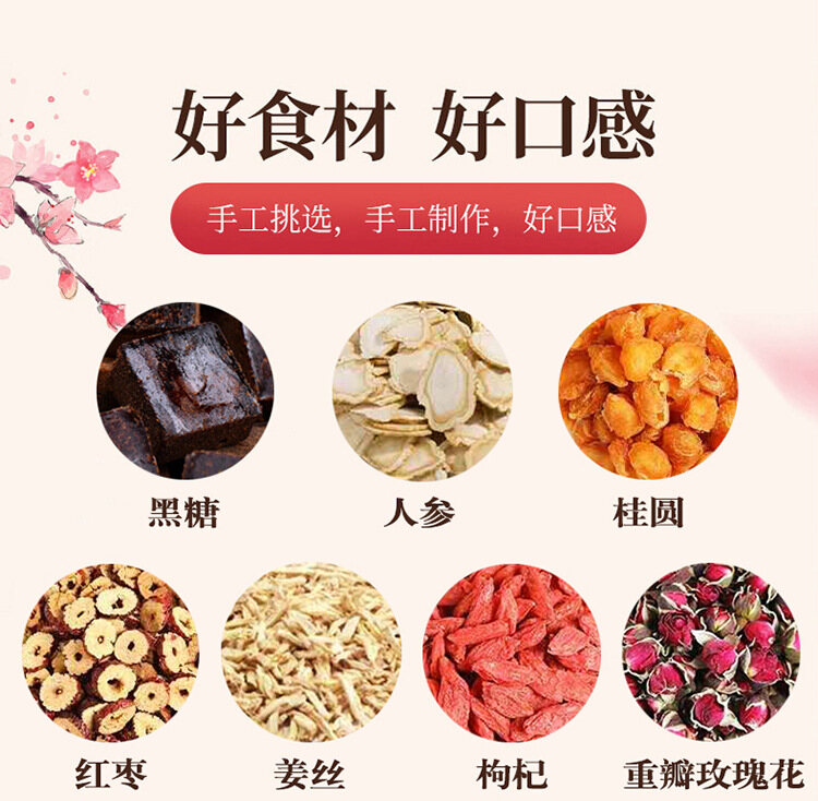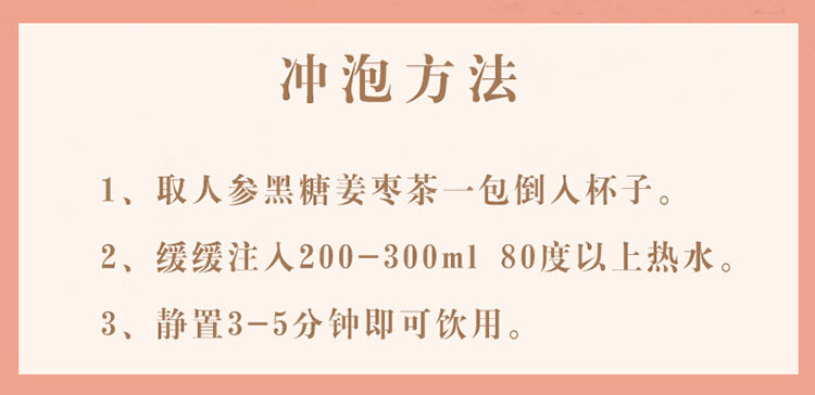 1. Take a packet of ginseng brown sugar ginger jujube tea and pour it into a cup. 2. Slowly inject 200-300ml of hot water above 80 degrees. 3. Let it stand for 3-5 minutes to drink. [Ingredients] brown sugar, ginseng, dried ginger, Chinese wolfberry, double red rose, Longan, red dates.
