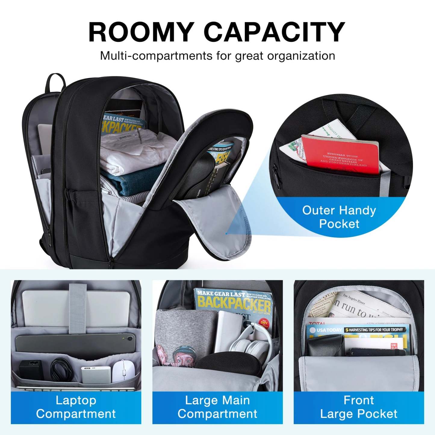 MUlTI-COMPARTMENT: 3 main compartments & 7 allocated inner pockets & 2 side pockets, hold up to 17.3 inch laptop, providing a dedicated space for your tablet, cellphone, pens, textbooks, keys, wallet, clothes, shoes, sunglasses, bottle and more. Easily find what you want in travel backpack.