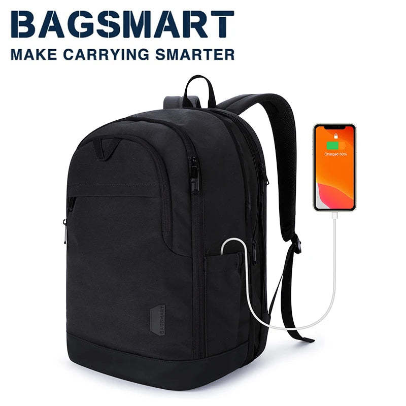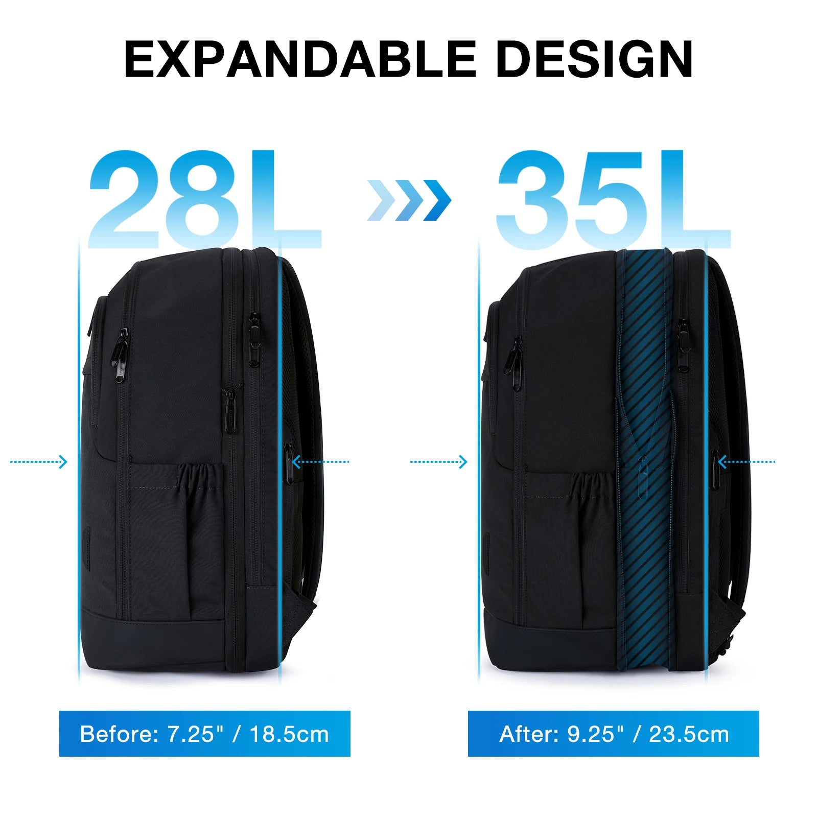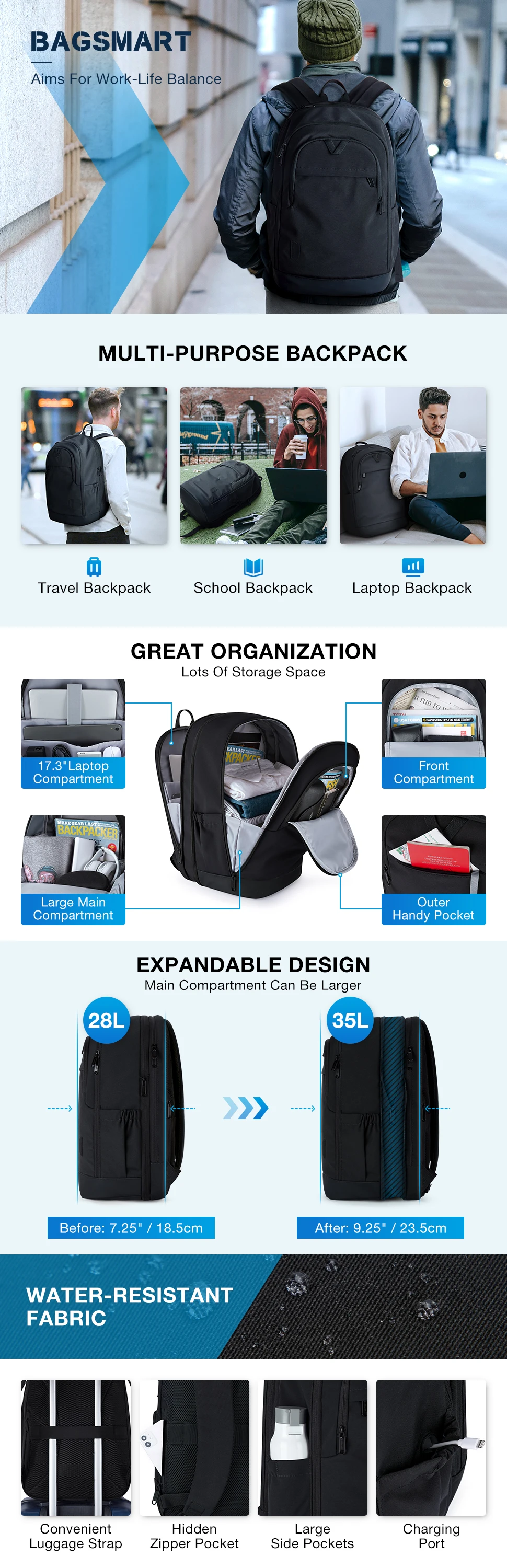 UNIQUE DESIGN: The full perimeter expansion system makes laptop backpack easy to expand from 28L to 35L. Ergonomic shoulder strap design and breathable sponge mesh ergonomic design of the back and straps offering your back plenty of cushioned comfort by relieving the stress on your shoulder. Durable vegan leather at bottom for easy cleaning.