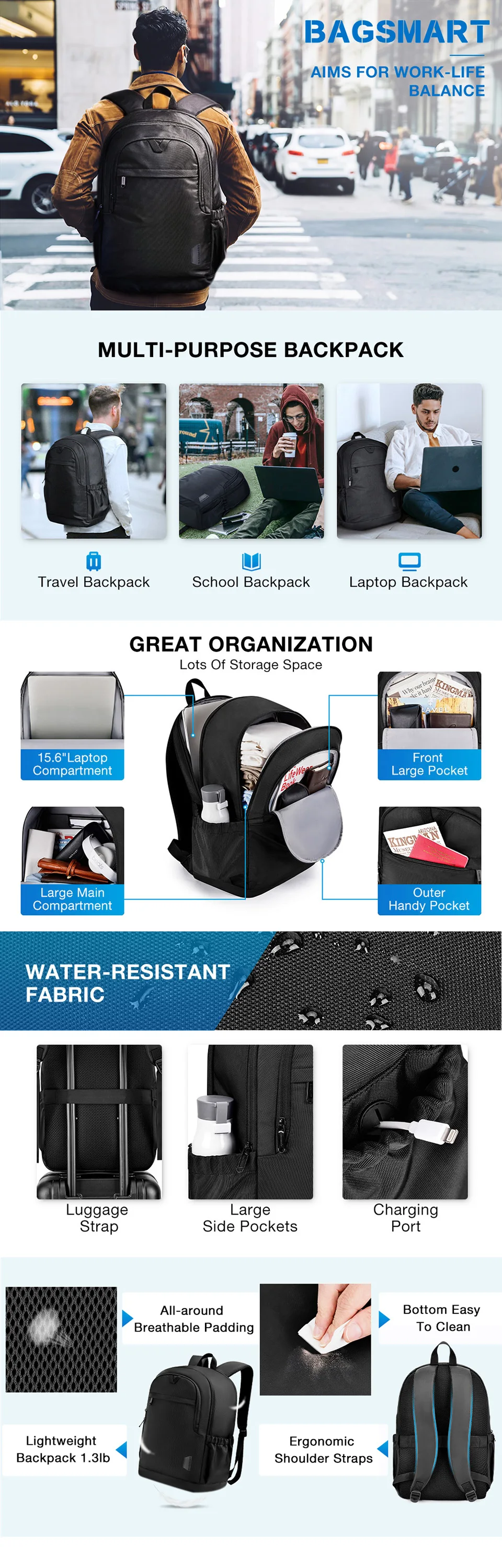 LONG LASTING: Made of water-resistant and durable polyester fabric, metal double-way zipper pulls make opening/closing simple and fast. It's perfect for professional office work, business travel, weekend getaway or school life. The simplicity look of back pack makes it can be served as a school backpack, computer backpack, bookbag, travel backpack, backpack for men and women.