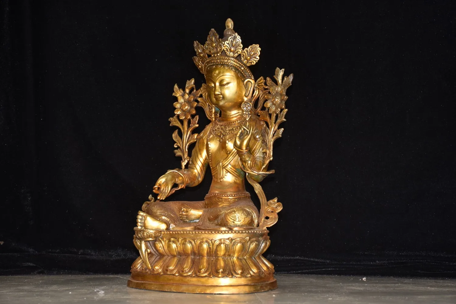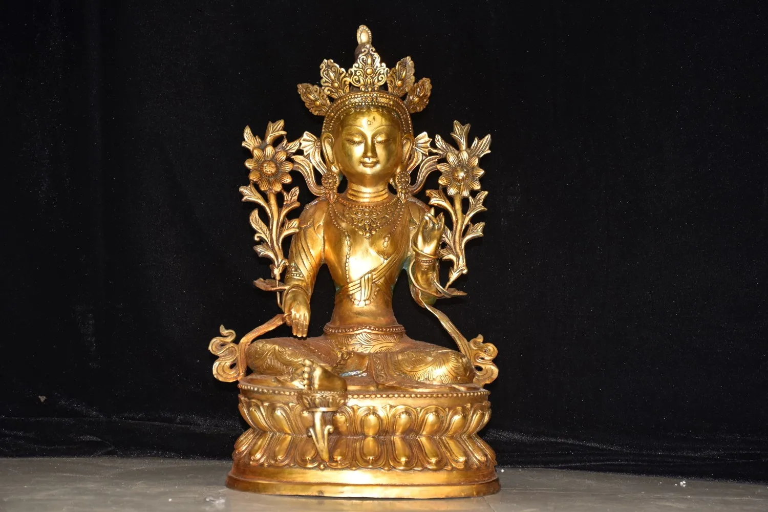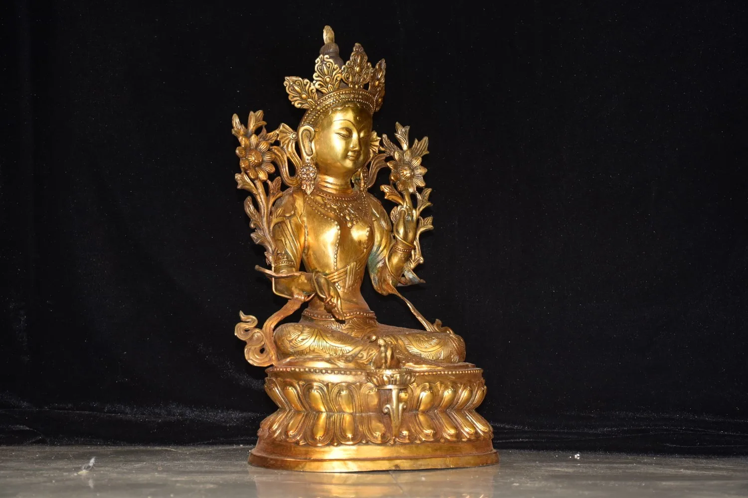 18"Tibetan Temple Collection Old Bronze Gilded Cinnabar Bodhisattva Tara(Green) Buddha Lotus Terrace Worship Hall Town house