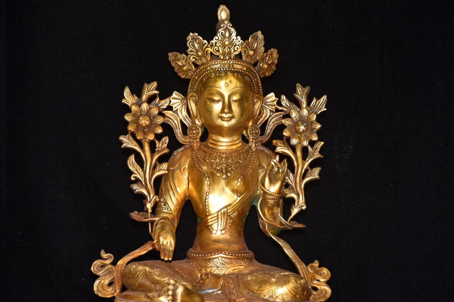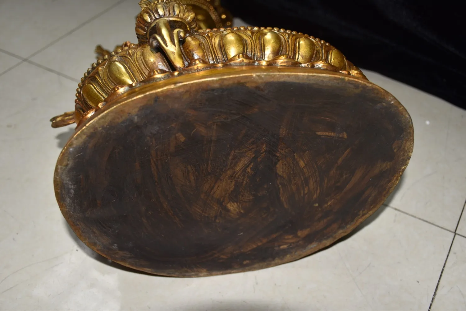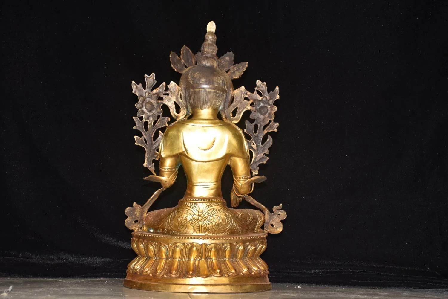 18"Tibetan Temple Collection Old Bronze Gilded Cinnabar Bodhisattva Tara(Green) Buddha Lotus Terrace Worship Hall Town house