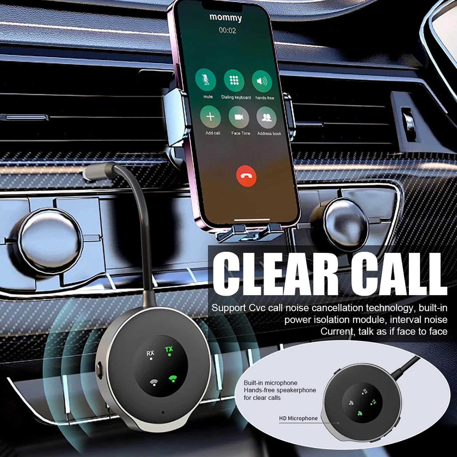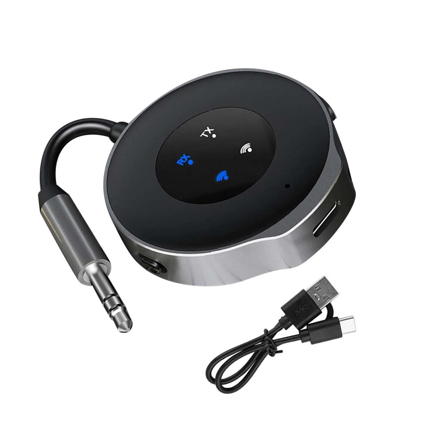 Features: The product transmits and receives 2-in-1 function. Built-in battery, long-lasting life. AUX interface connection, audio input and output. Support HD call function, answer/hang up. 5.3 high configuration bluetooth version, not easy to jam. Enhance the function of Bluetooth connection for all kinds of cars, stereos, TVs, tablets, desktop computers and so on. Made of zinc alloy material shell, ABS material forging and moulding, durable quality assurance. Automatic connection when powered on. After the first successful pairing with the device, the device will automatically connect