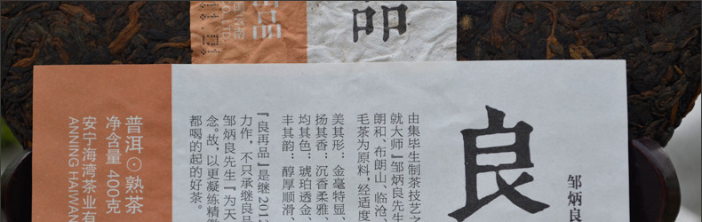 良再品 由中国普洱茶终身成就大师 邹炳良先生精心调和而成。 该茶严选格朗、布朗山、临沧、景谷等古树茶区的明前晒青毛茶为原料,经过适度的发酵,经过手工古法揉制而成。