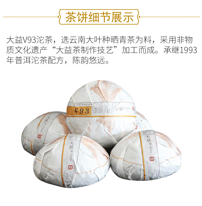 V93 ripe Pu Er tea was first released in 2005, a high classic, quality ripe Pu Er tea. Why it is called V93? Because it inherits the special recipe of high quality Menghai Pu Er tea produced in 1993; V is the code summary for the V93, V2, V4 series of Pu Er tea, whose recipes are the combination of past classic Maocha techniques, quality characters, taste and aroma with the new processing and invention. This tea's fermentation is appropriate, which is super for futher aging and storage. Its tea liquid is smooth and soft, with mellow and thick taste. Its sweet after taste is very long due to its careful selection on the Maocha. This is a ripe tea full of good Menghai taste. Good to long term storage and taste. Important tips: for brewing ripe Pu Er tea, the water temparature should be over 95 degrees, based on different kind of Pu Er teas. Pu-erh tea can be purchased as either raw/green (sheng) or ripened/cooked (shu), depending on processing method or aging. Sheng pu-erh can be roughly classified on the tea oxidation scale as a green tea, and the shou or aged-green variants as post-fermented tea.
