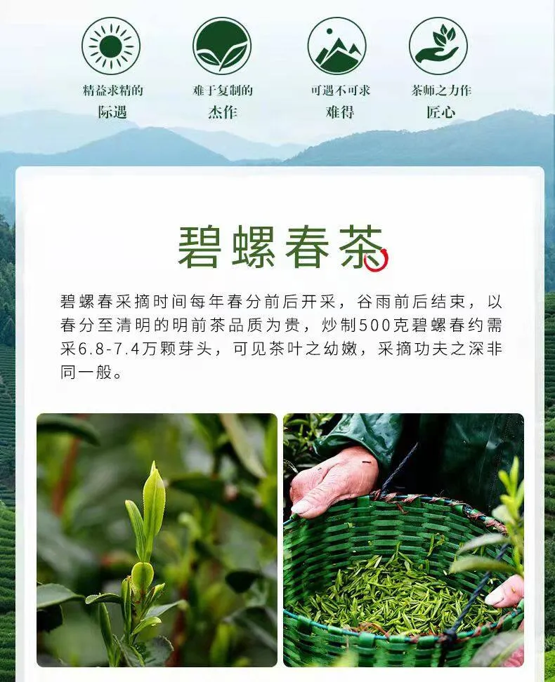 Biluochun is a traditional famous tea in China and one of the top ten famous teas in China. It belongs to green tea and has a history of more than 1000 years. Biluochun is produced in the East Dongting mountain and West Dongting mountain (now Wuzhong District, Suzhou) of Taihu Lake in Wu County, Suzhou City, Jiangsu Province, so it is also known as "Dongting Biluochun".