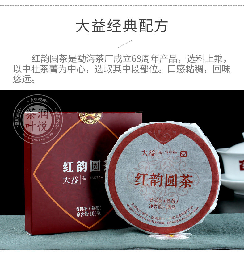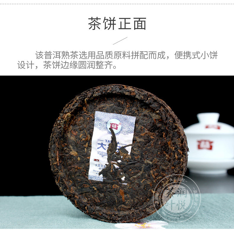 Puer Ripe cake tea Net weight: 100g, 5pcs/box. Production Date: 2021, 2101 batch Origin: Menghai,Yunnan,China Manufacturer: Menghai Tea factory,TAETEA Group.