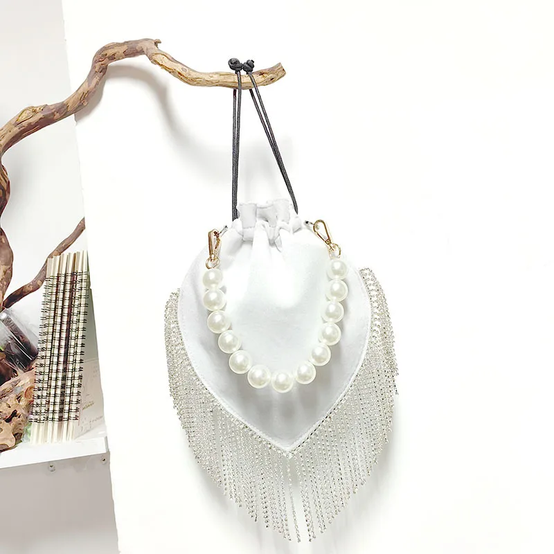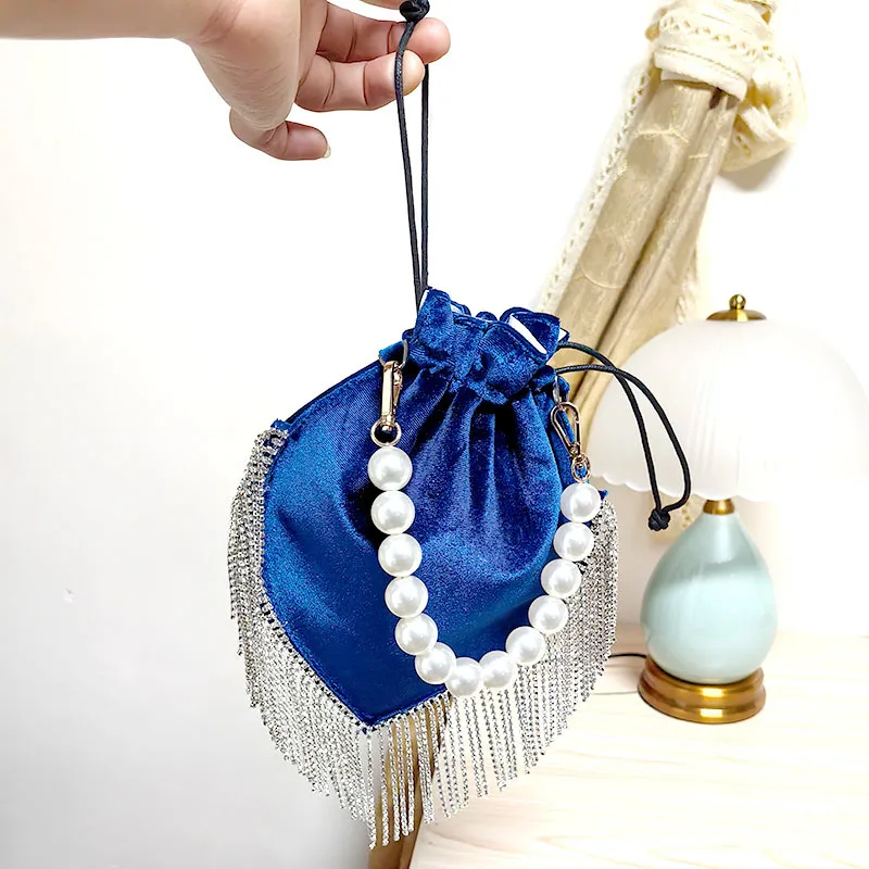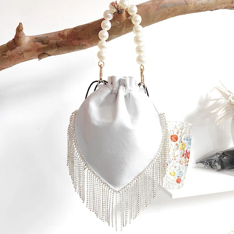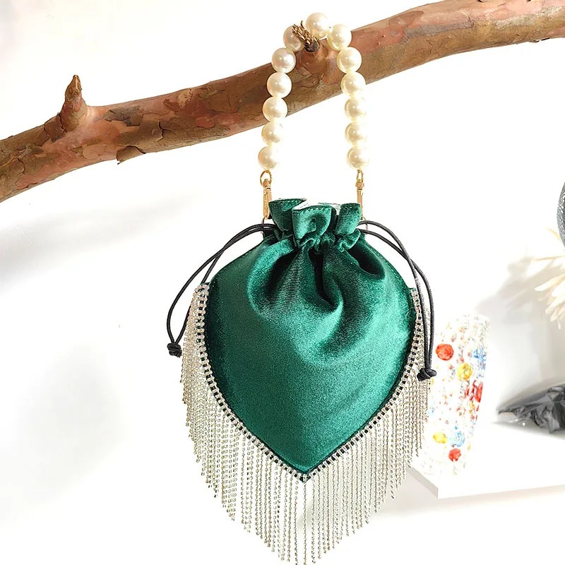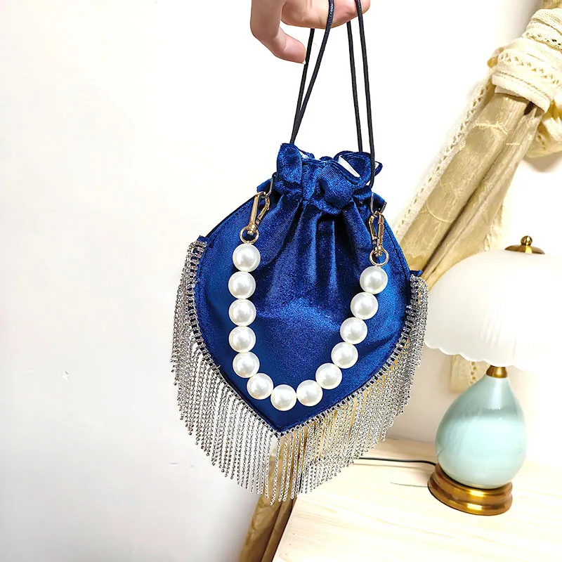 2024 Thai Trend French tassel rhinestone bag Satin drawstring Pearl catwalk fashion bag one shoulder hand