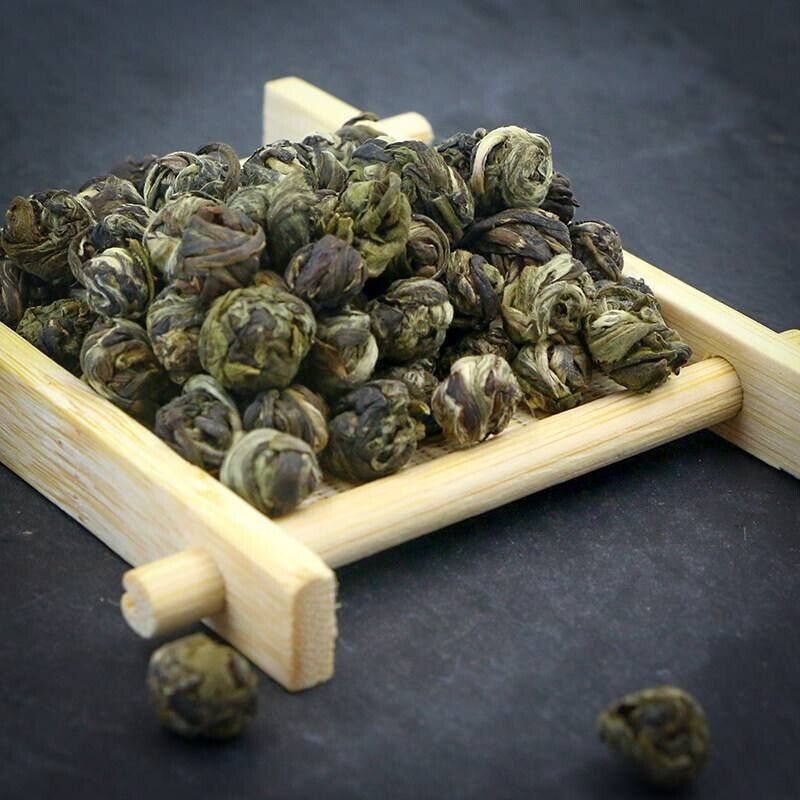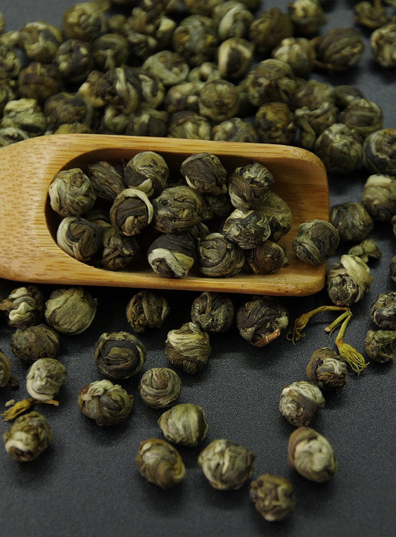 Jasmine Balls are hand rolled and tied. The leaf appearance tends toward a mottled and white appearance, indicating very early new season tea and extremely careful plucking. New season tea of this quality is rare and only available for 2-3 weeks each year. When you infuse a Jasmine Ball, you will see the outer leaves begin to uncurl. Once the infusion time is complete the tea looks like a chrysanthemum flower with long petals on the outside and the short petals on the inside. The chrysanthemum implies tranquillity, beauty, longevity and health