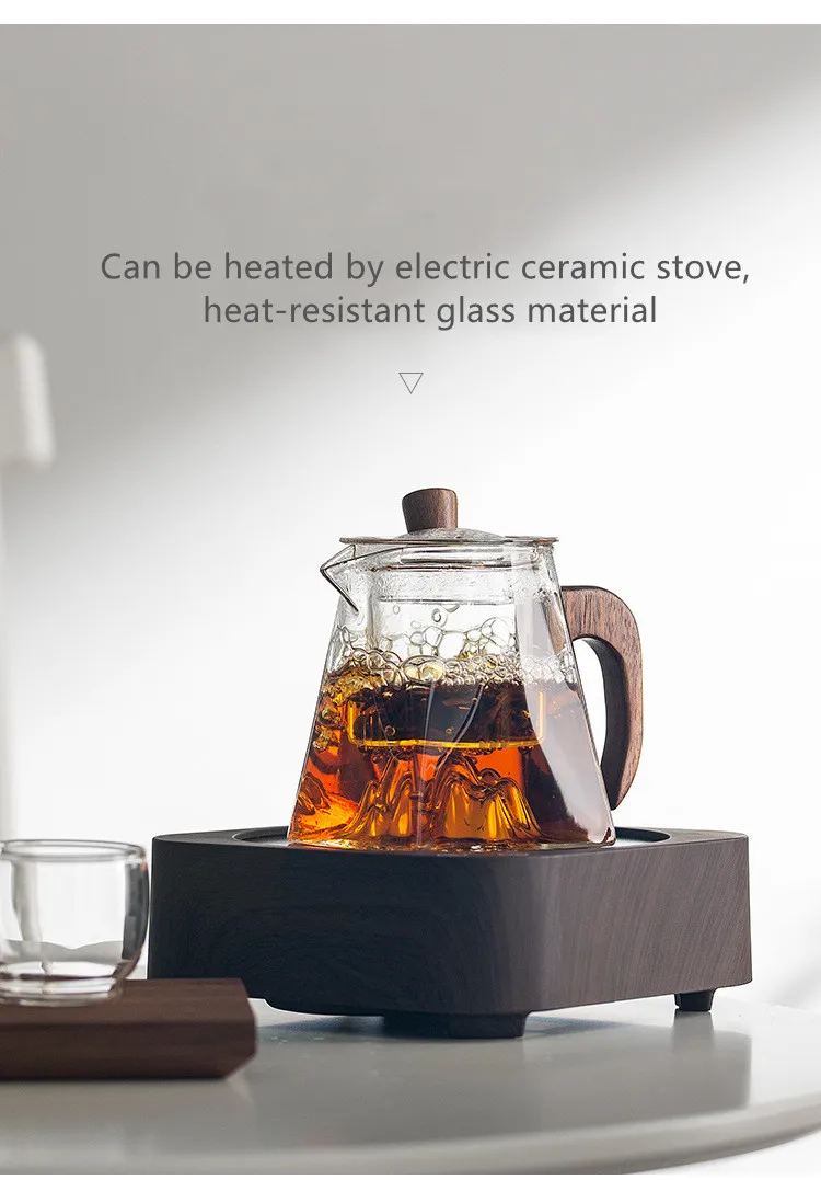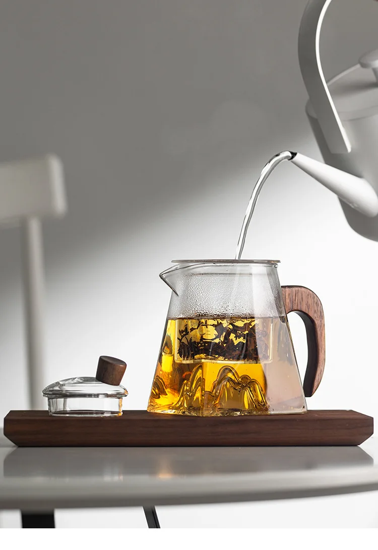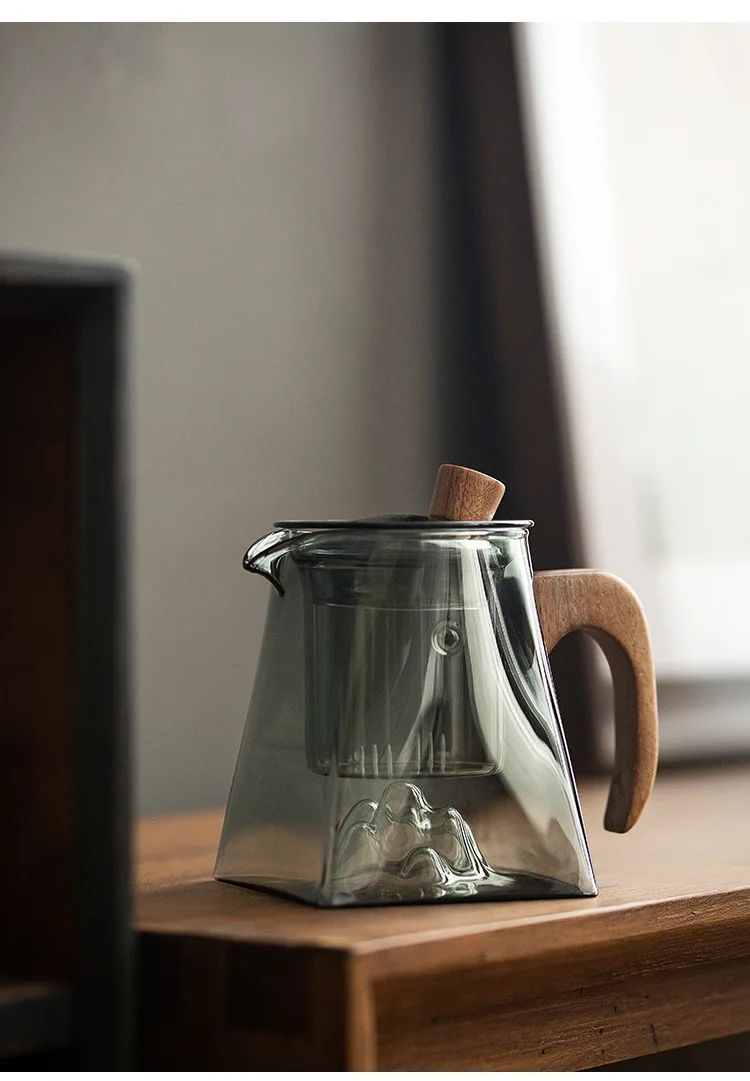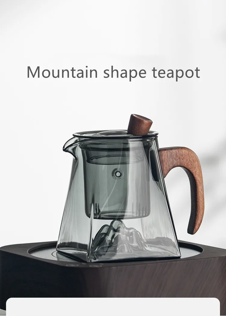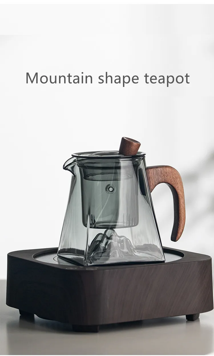 3D Mountains Glass Teapot with Tea Infuser Heat Resistant Glass Tea Pot Clear Kettle Wooden Handle Chinese Kung Fu Tea Sets