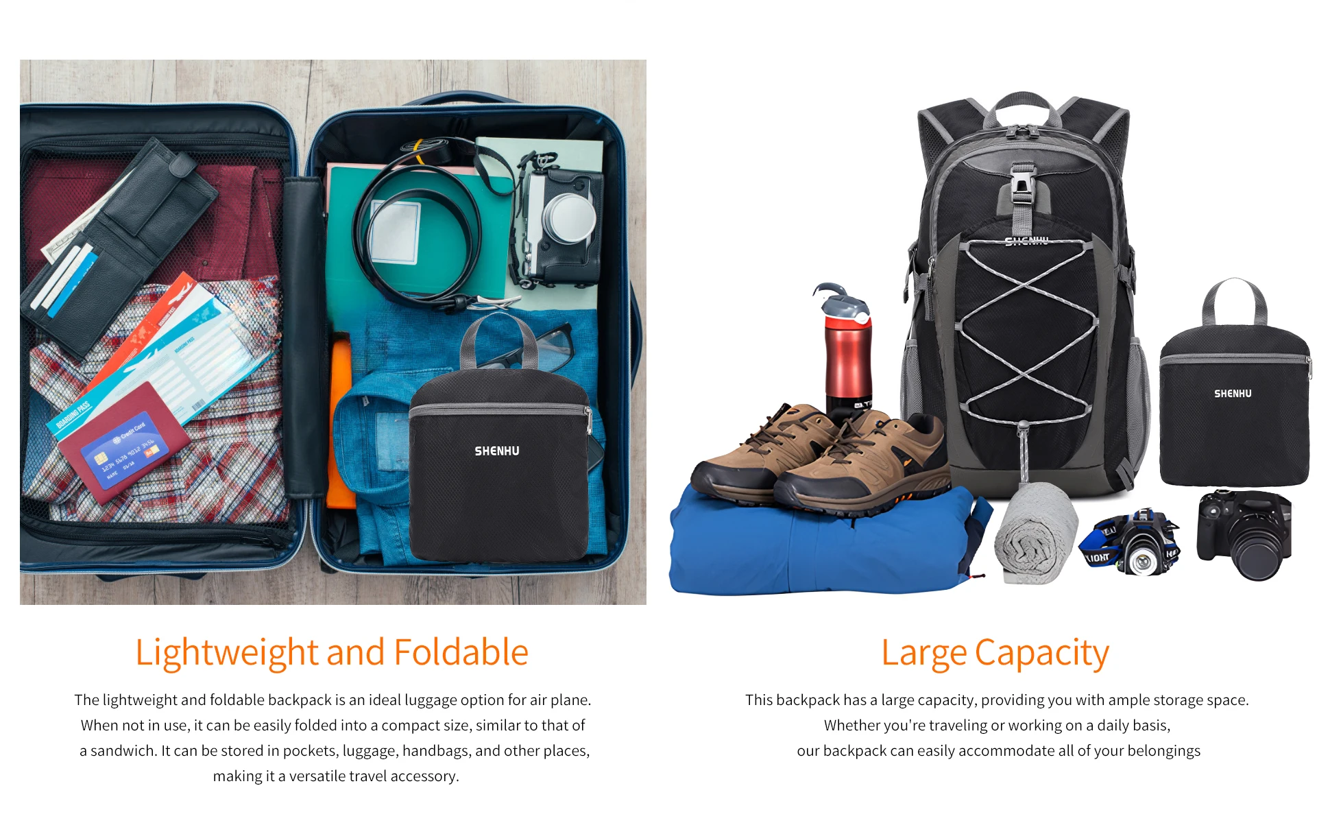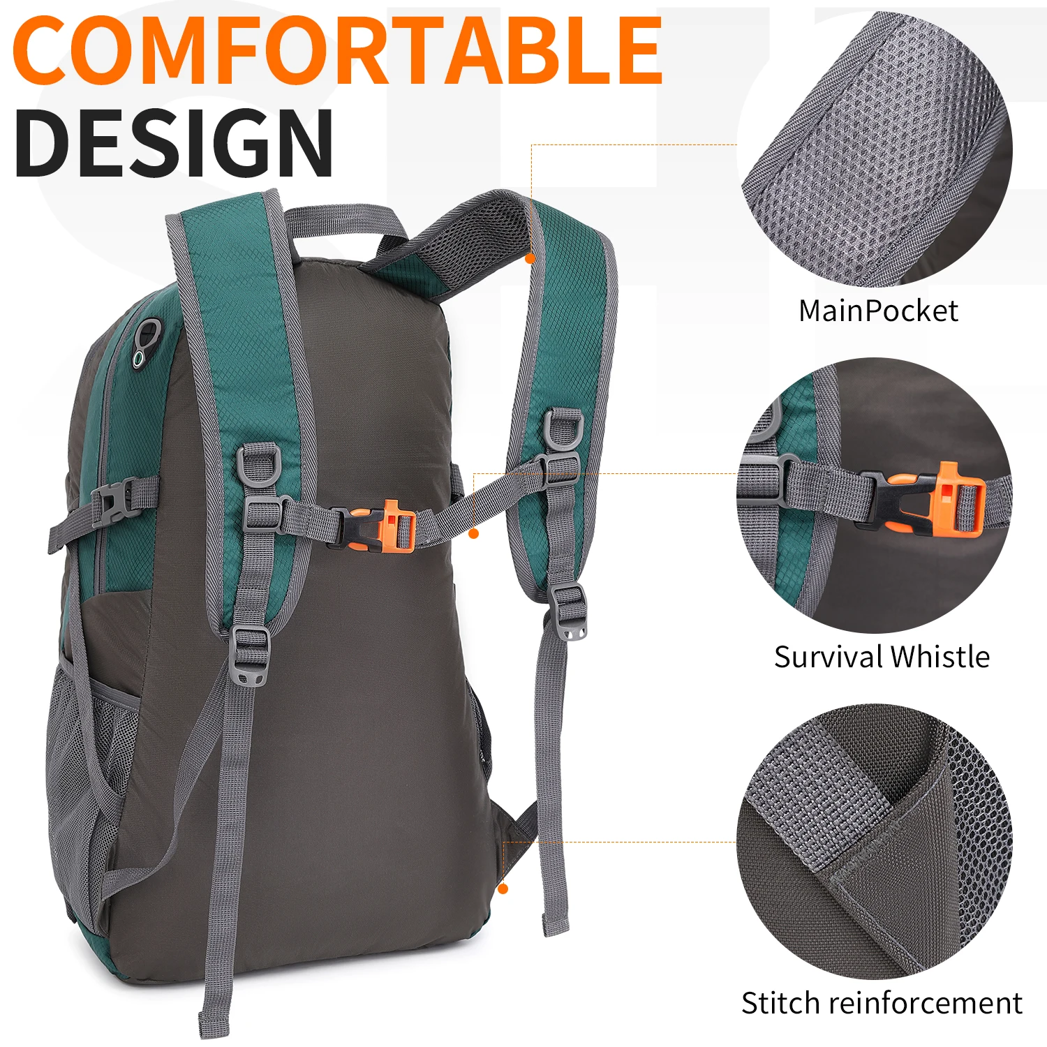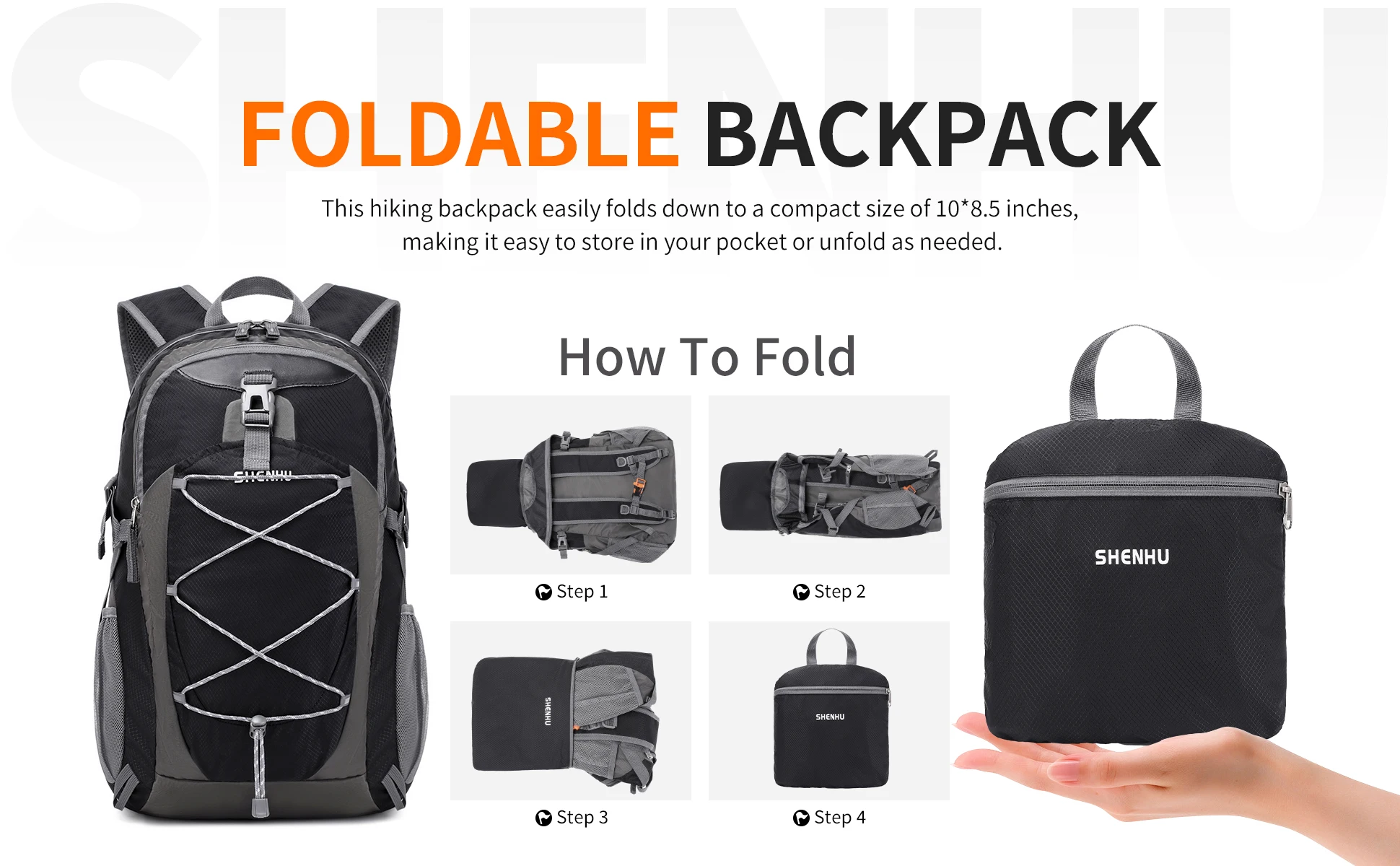 • Foldable Backpack: This travel backpack can be easily fold into its own pocket for storage; Ideal comfort for daily use or day trips, holiday, travel, hiking, camping and shopping.