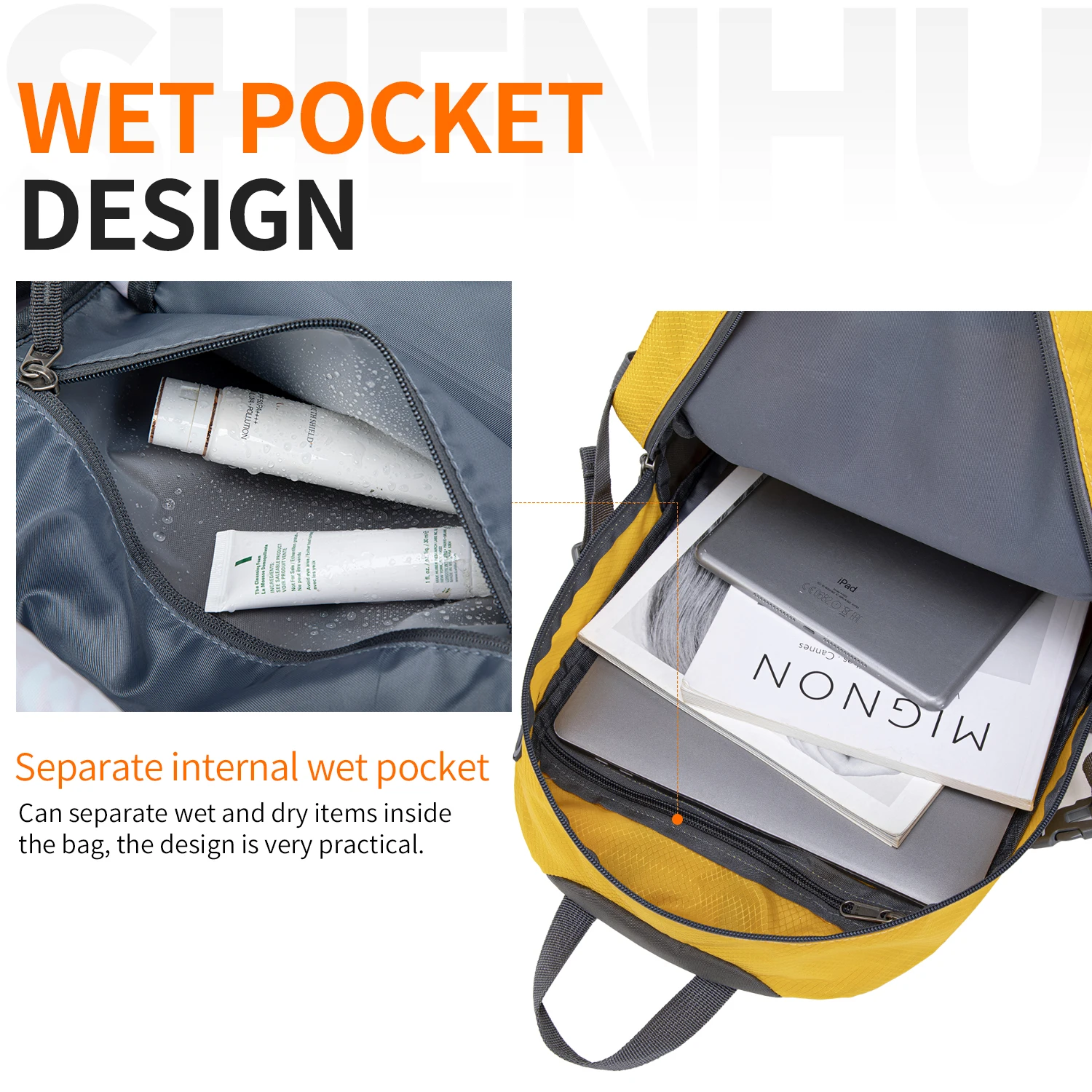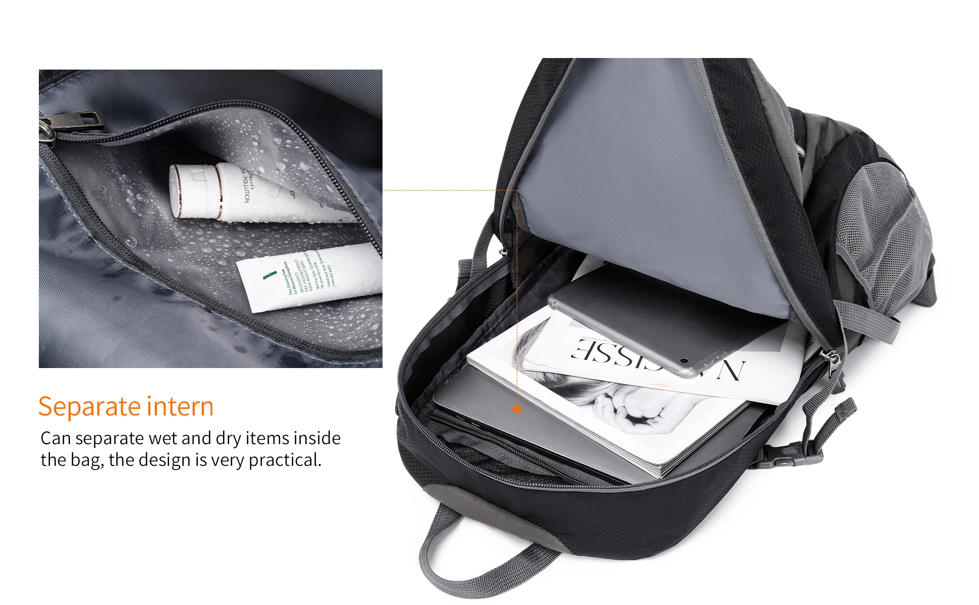 • Wet Pocket Design: stands out with more humane design for easy and convenient use. One big waterproof wet pocket is added to the front compartment, can let to the internal wet pocket, to better separate sweaty clothes, towels or other personal things after swimming or taking exercise.