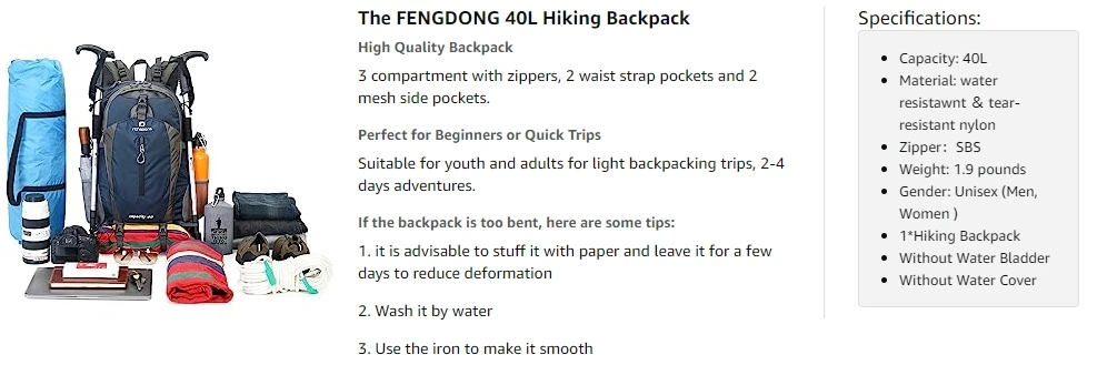 • Water Resistant & DURABLE: Made of Water Resistant high-density polyester material. FENGDONG camping backpack is made of extra thick, tear-resistant, water-resistant and anti-abrasion polyester fiber. All stress points are reinforced with bar tacking to increase its longevity.