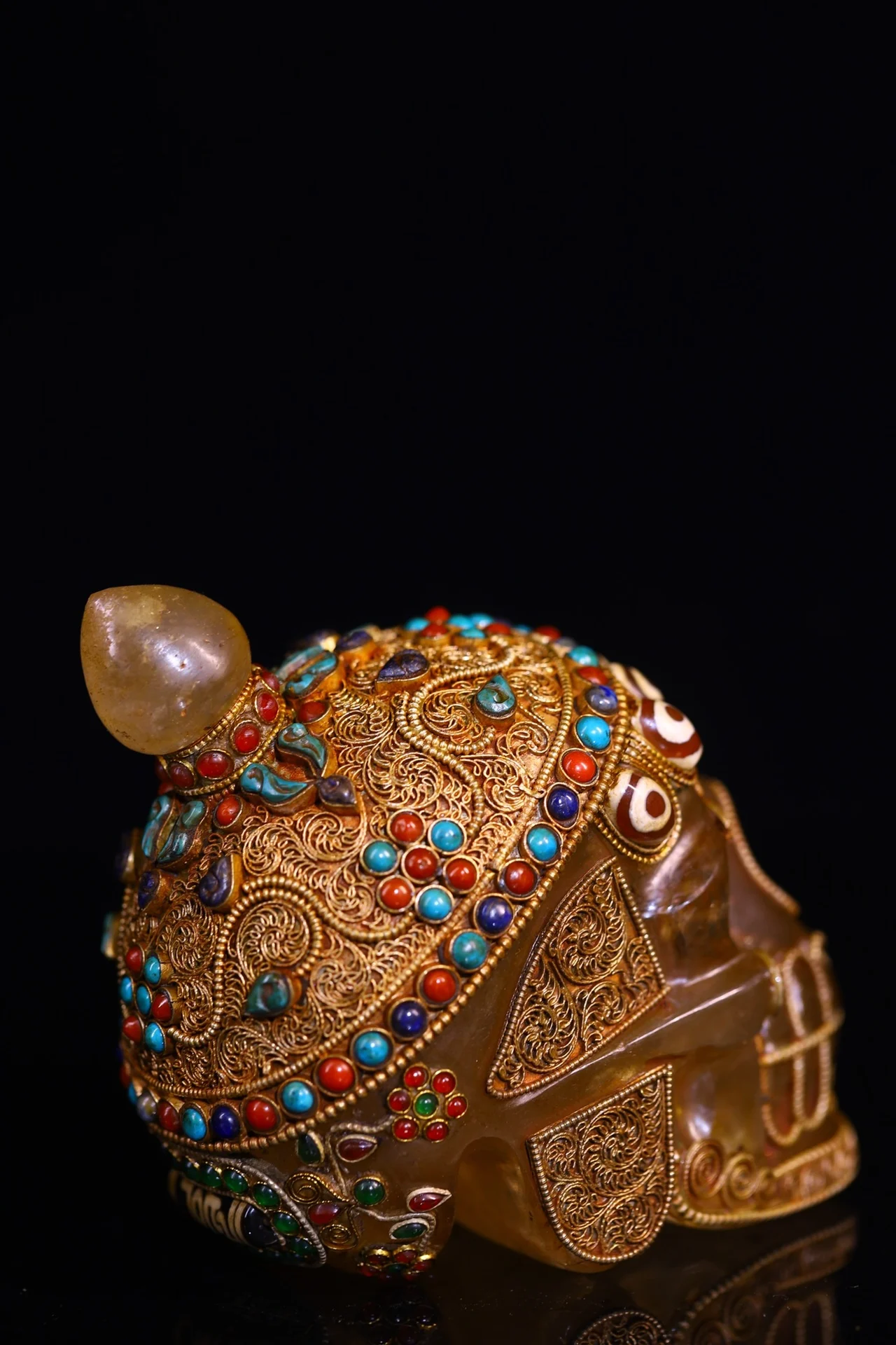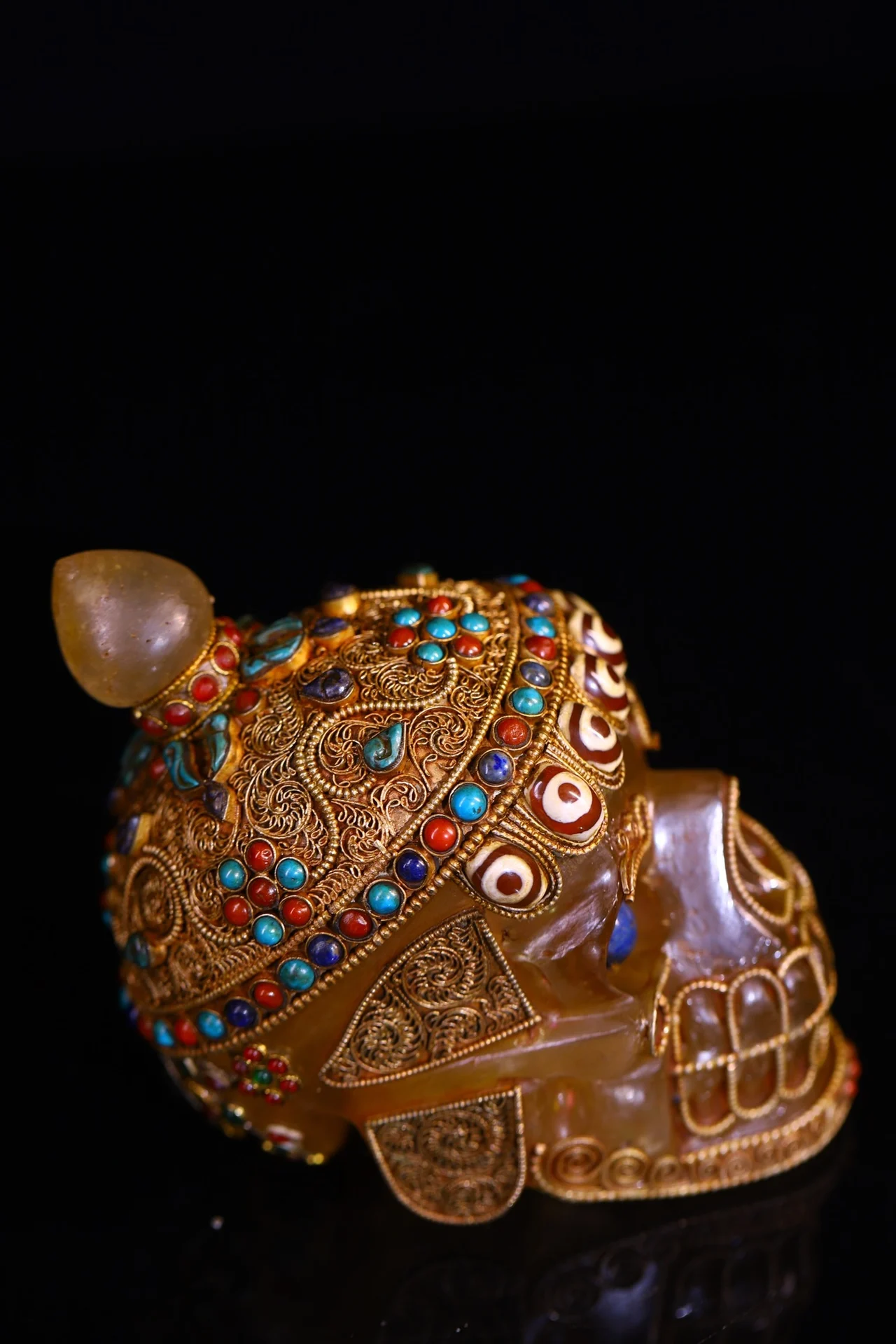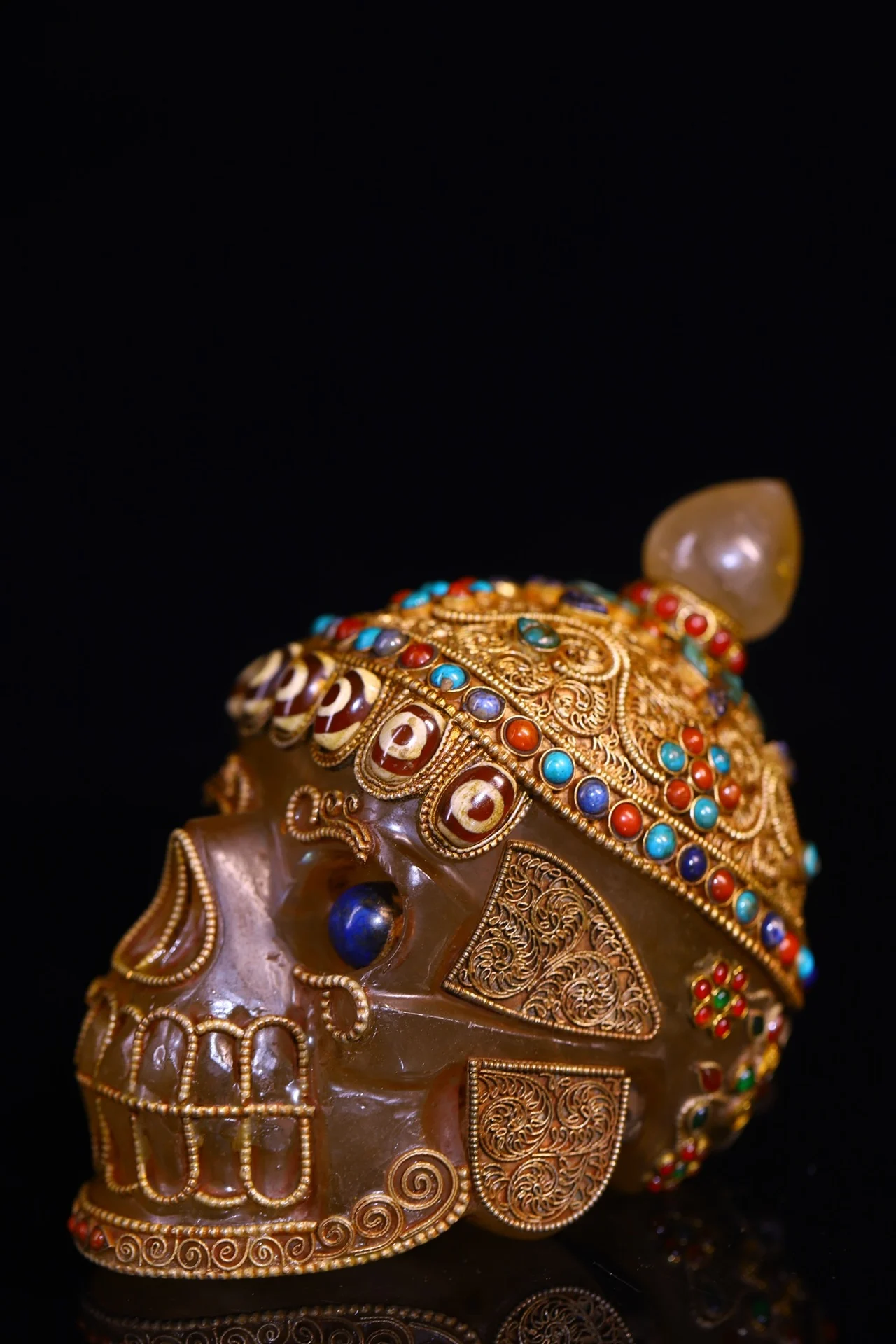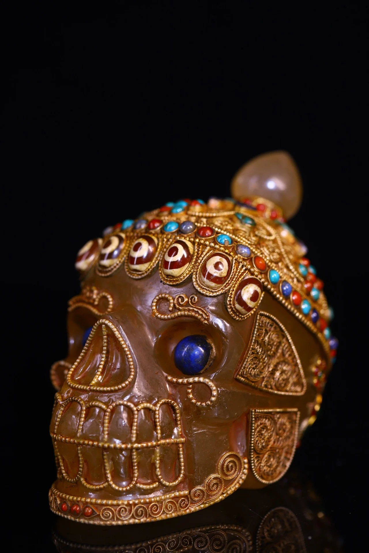 5"Tibetan Temple Collection Old Natural Crystal Cinnabar Tibetan silver Mosaic Gem gZi Beads Skull Head Worship Hall Town house