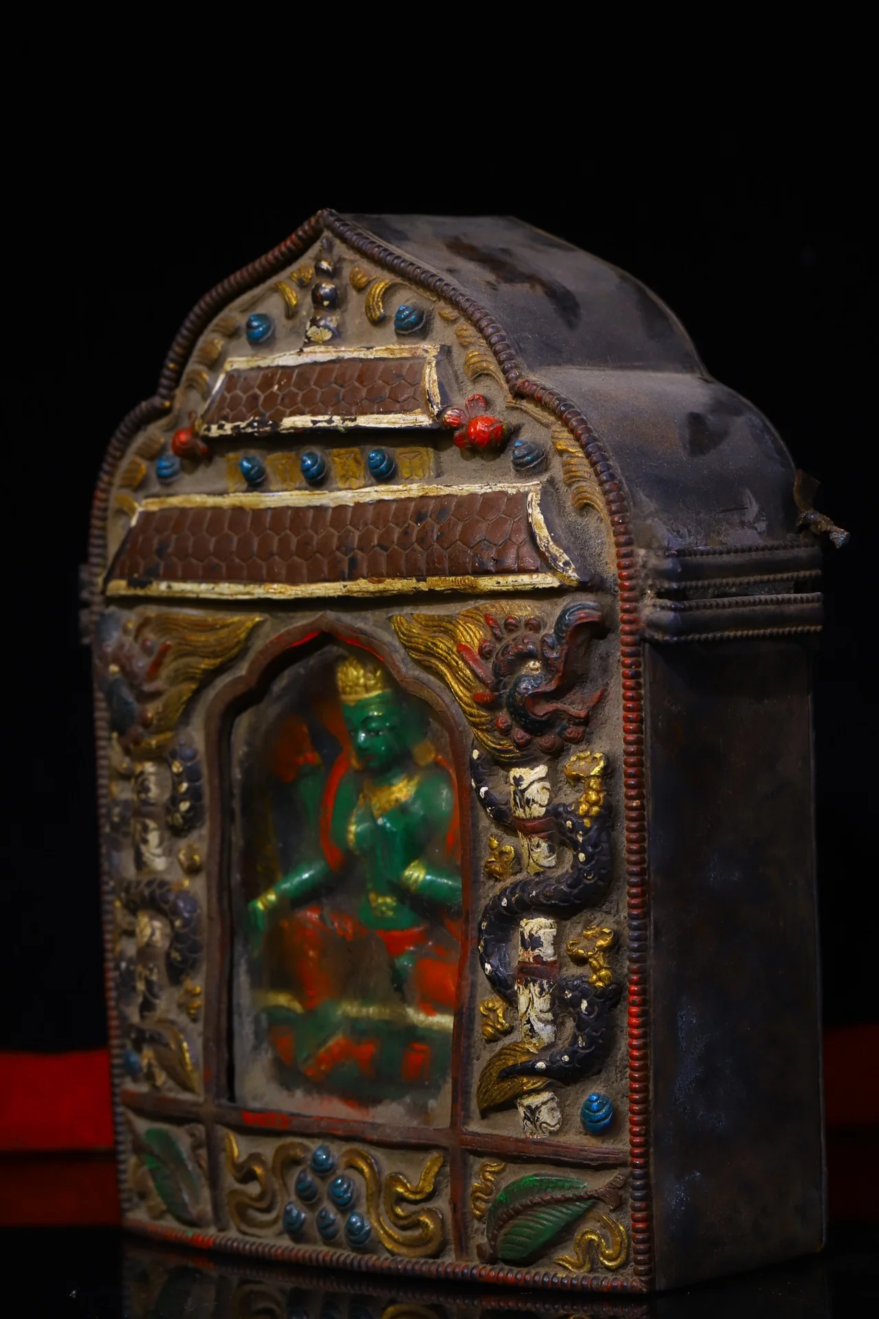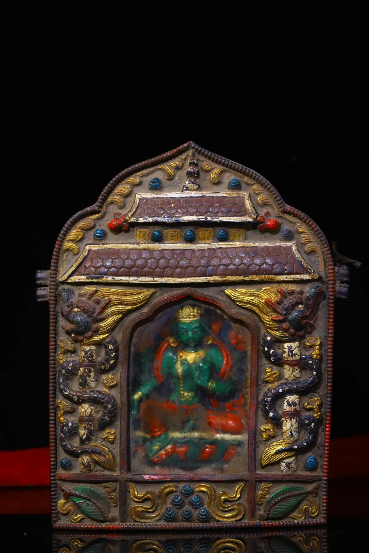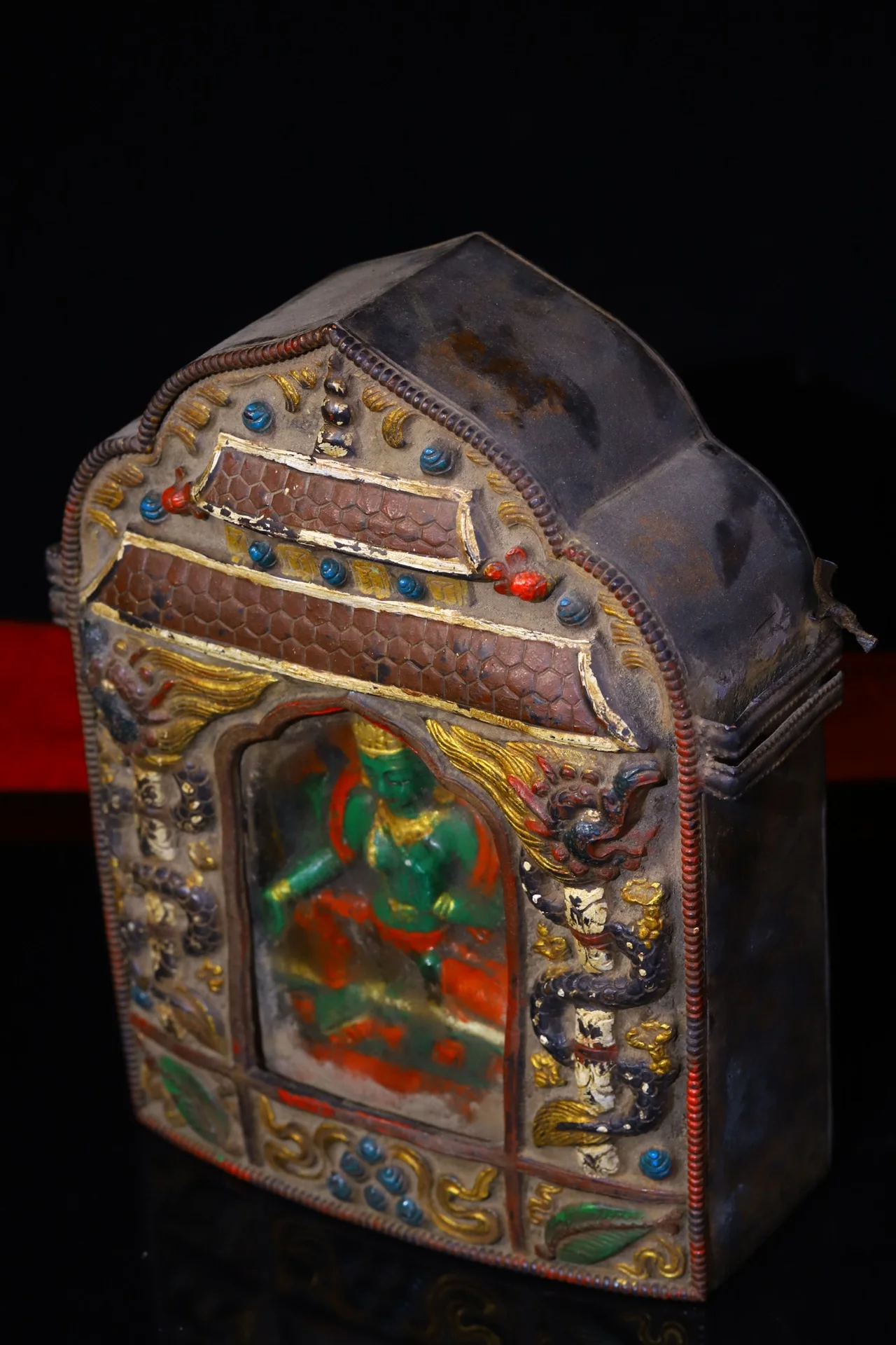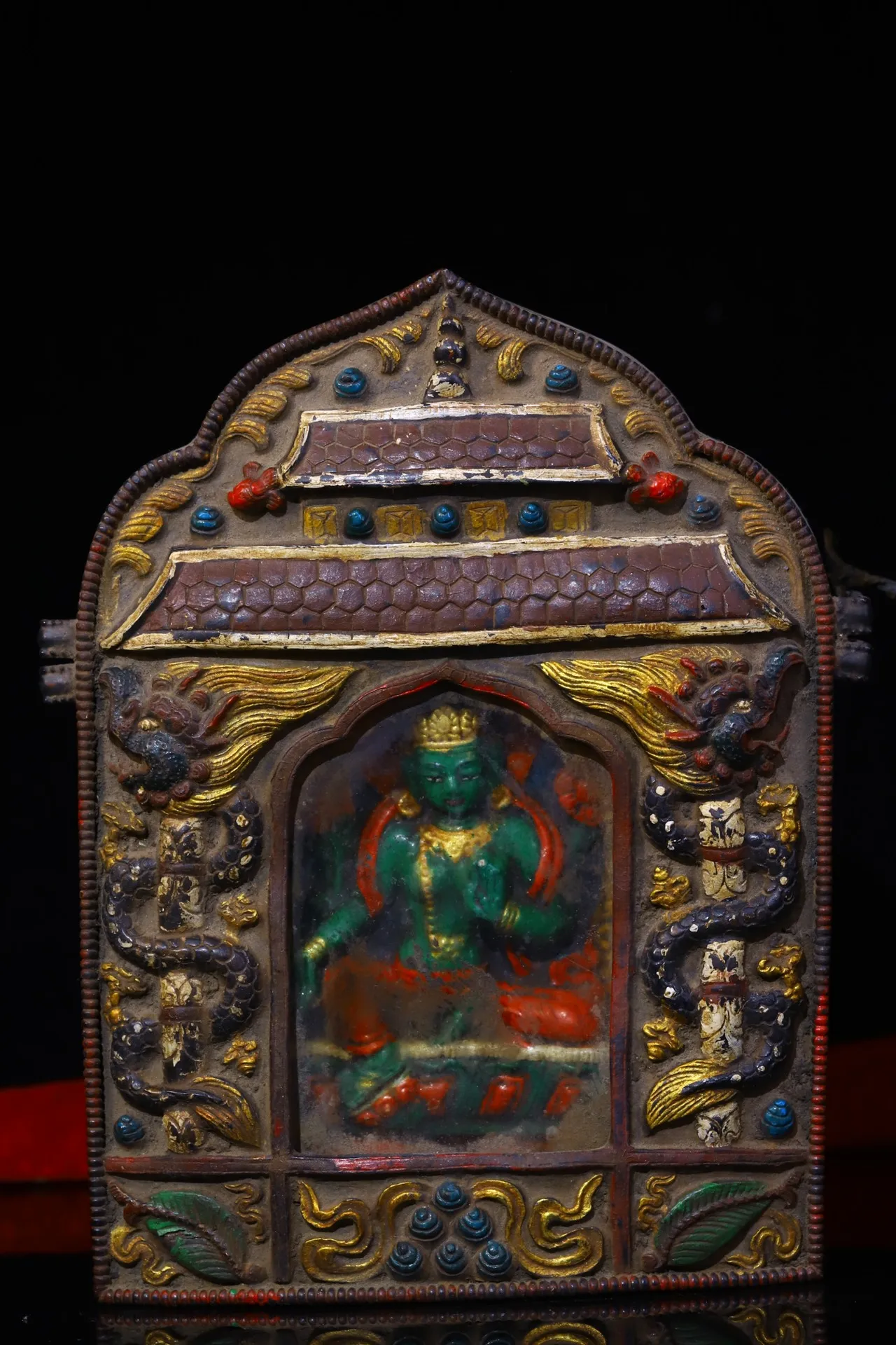 8"Tibetan Temple Collection Old Purple Bronze Cinnabar Painted Green Tara Buddha Gawu Box Buddhist Niche Amulet Worship Hall
